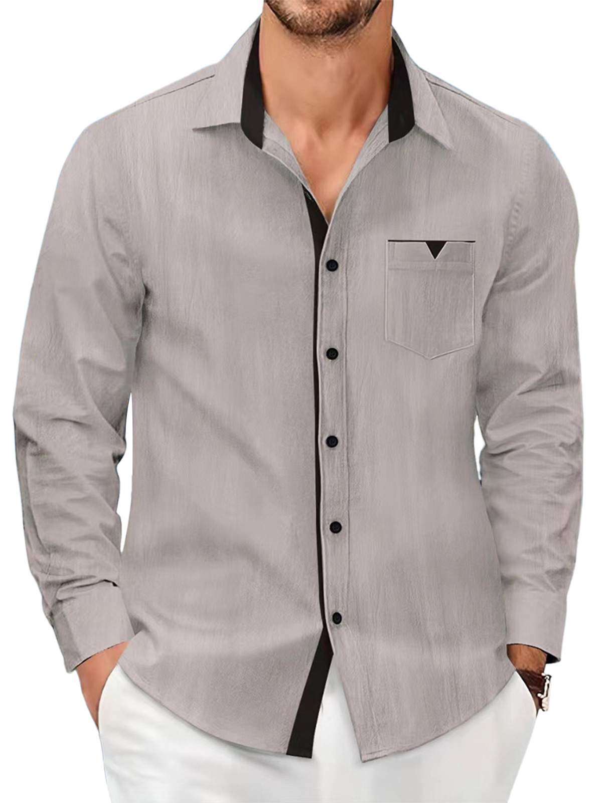 Men's cotton and linen solid color casual pocket contrast lapel long-sleeved shirt$39.99 USD -