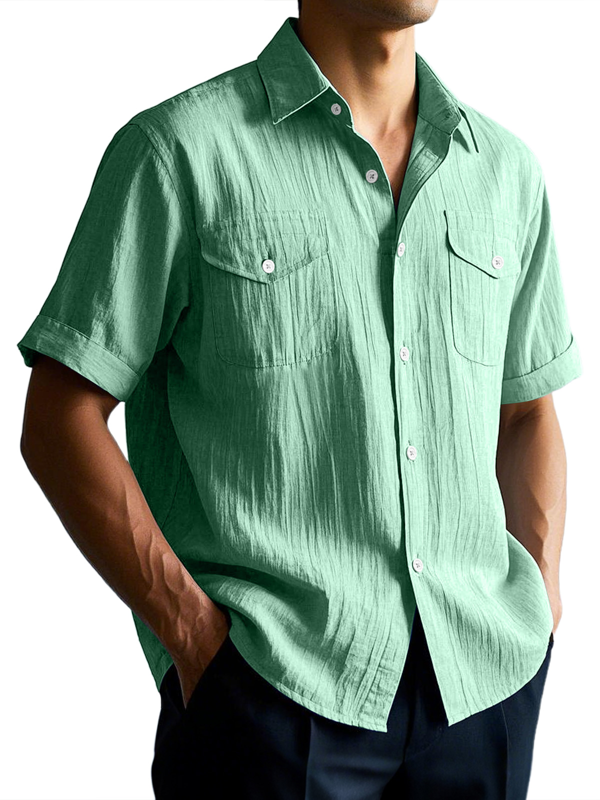 Men's Everyday Casual Double Pocket Lapel Solid Color Comfortable Short Sleeve Shirt$39.99 USD -