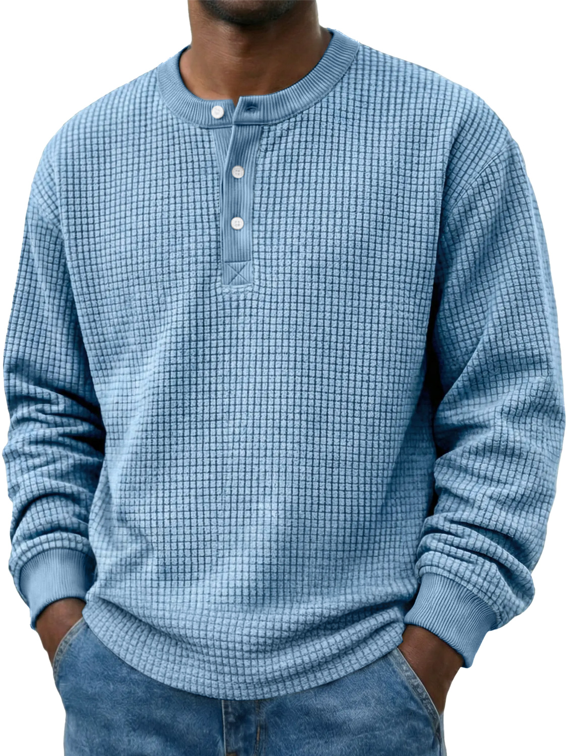 Men's Simple Waffle-knit Casual Long-sleeved Henley Shirt With Pocket$42.99 USD -