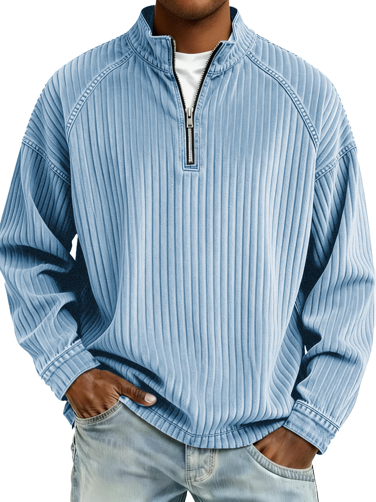 Men's Raglan Sleeve Ribbed Stand-collar Zip-up Casual Long-sleeved T-shirt$42.99 USD