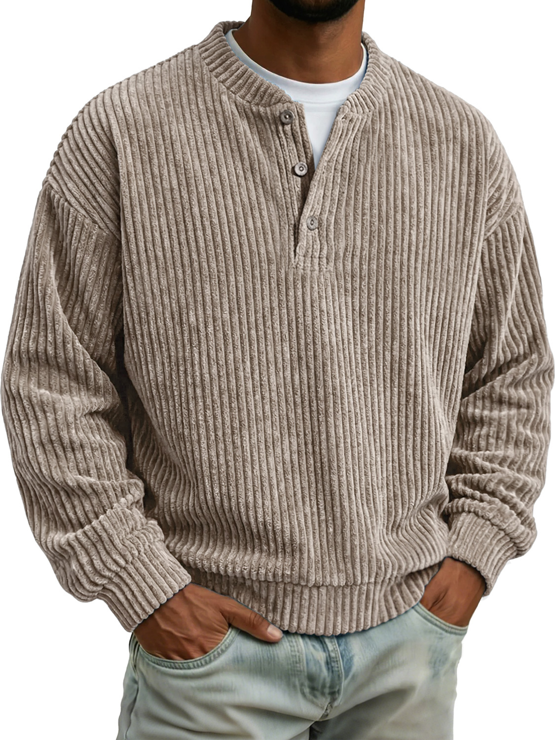 Men's Casual Corduroy Waffle-knit Solid Color Long-sleeved Henley Shirt$42.99 USD -
