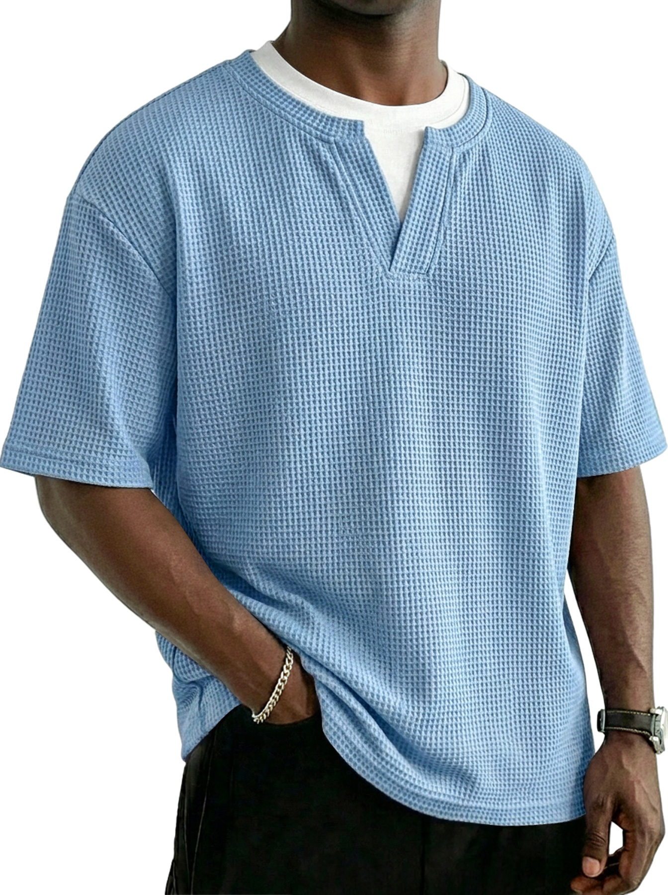 Men's Waffle-knit Faux Two-piece Casual Solid Color Short-sleeved T-shirt$38.99 USD -
