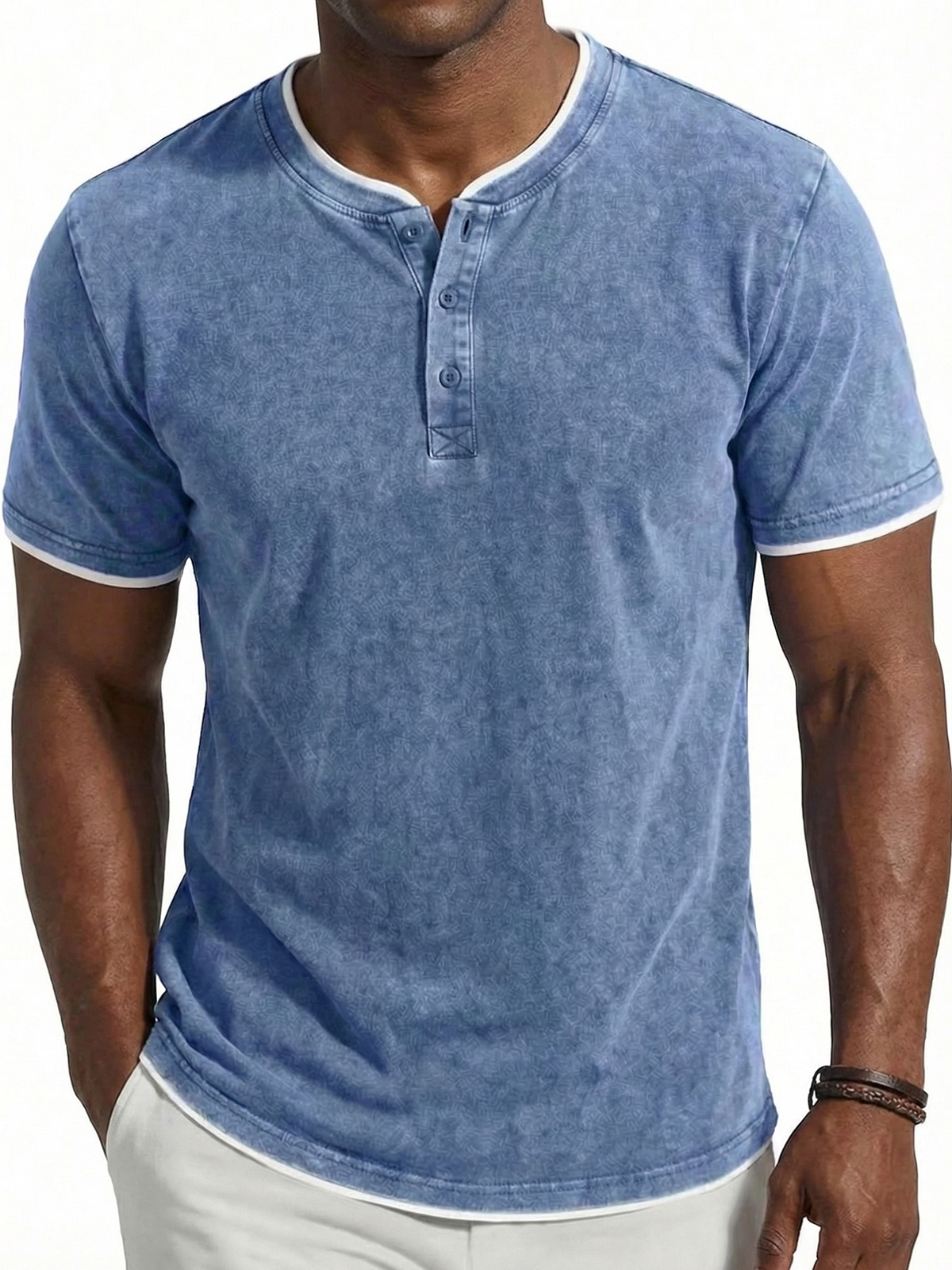 Men's Vintage Washed & Distressed Faux Layered Henley Short-Sleeve Top$39.99 USD