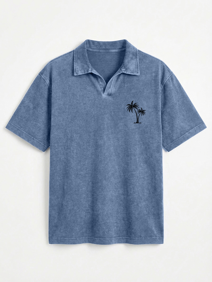 Men's Vintage Distressed Palm Tree Print Seagull Collar Short-Sleeve Polo Shirt$39.99 USD -