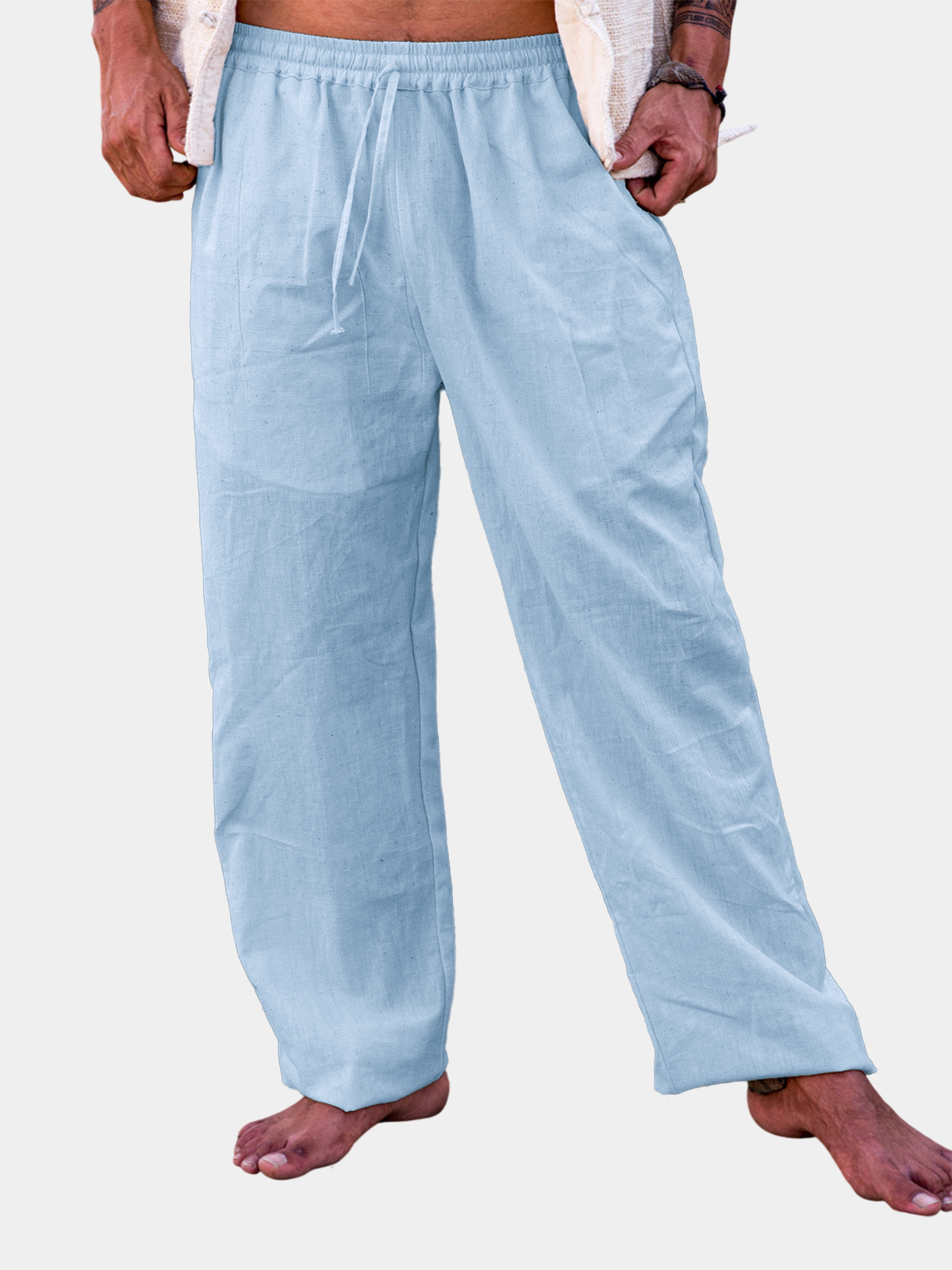 Men's Breathable Linen Vacation Drawstring Elastic Waist Loose Trousers With Side Pockets$42.99 USD -