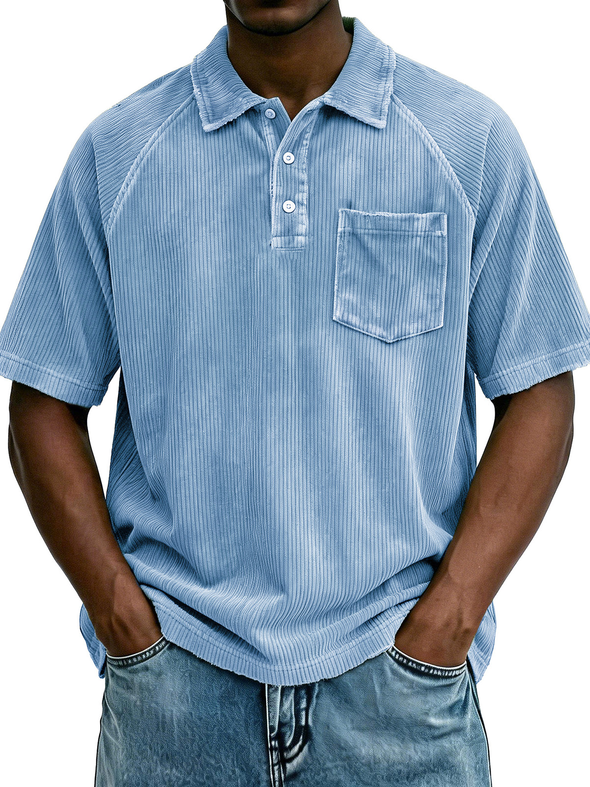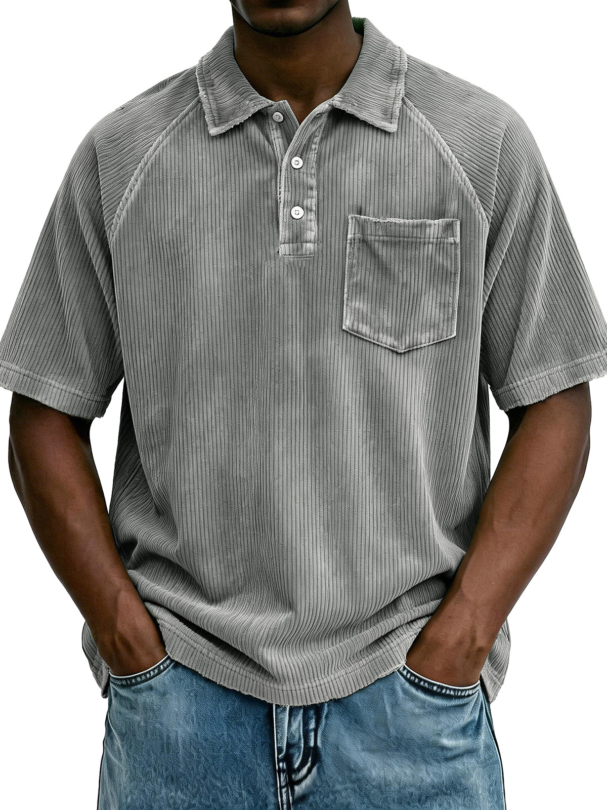 Men's Retro Raglan Pocket Zipper Loose Short-Sleeve Polo Shirt$39.99 USD -