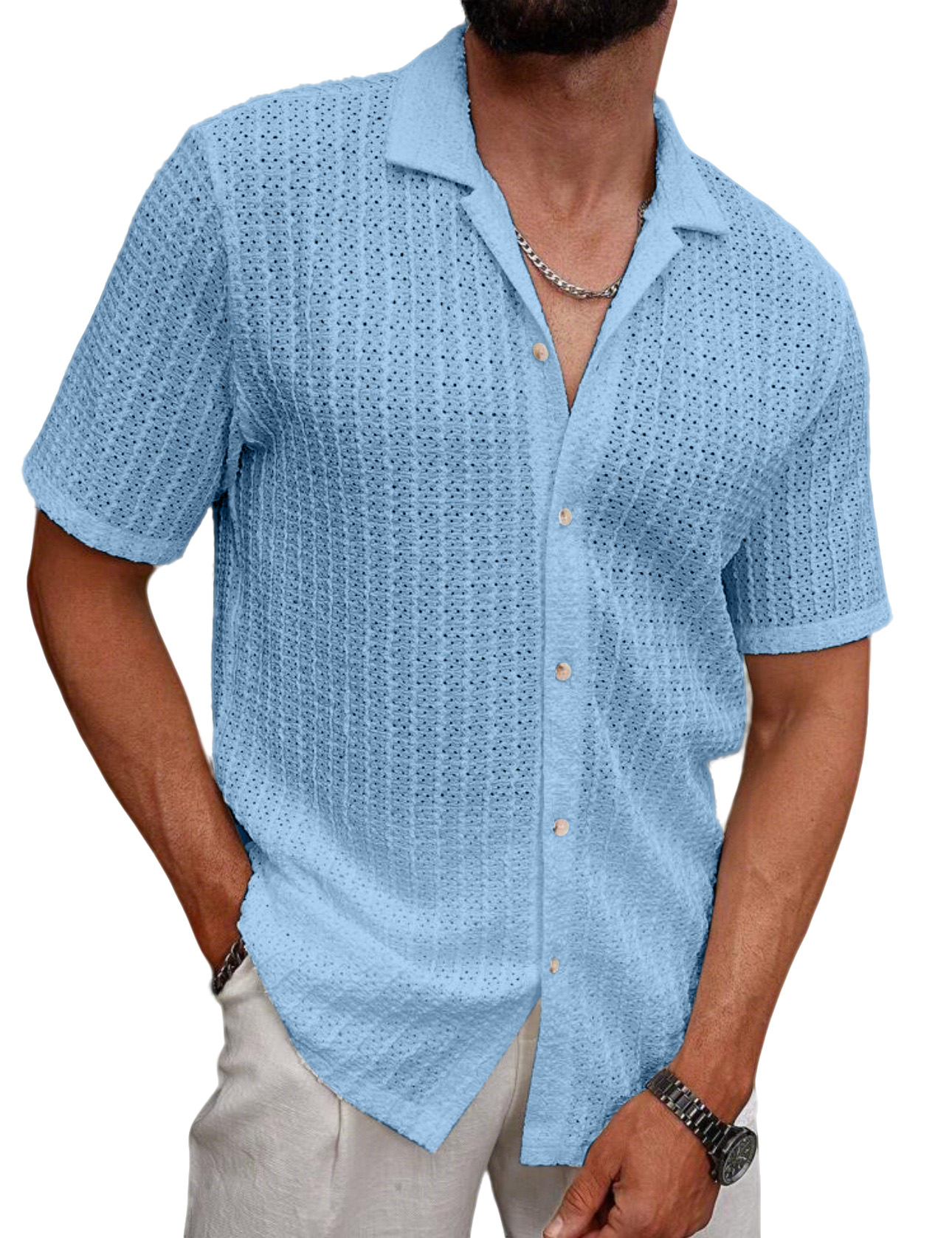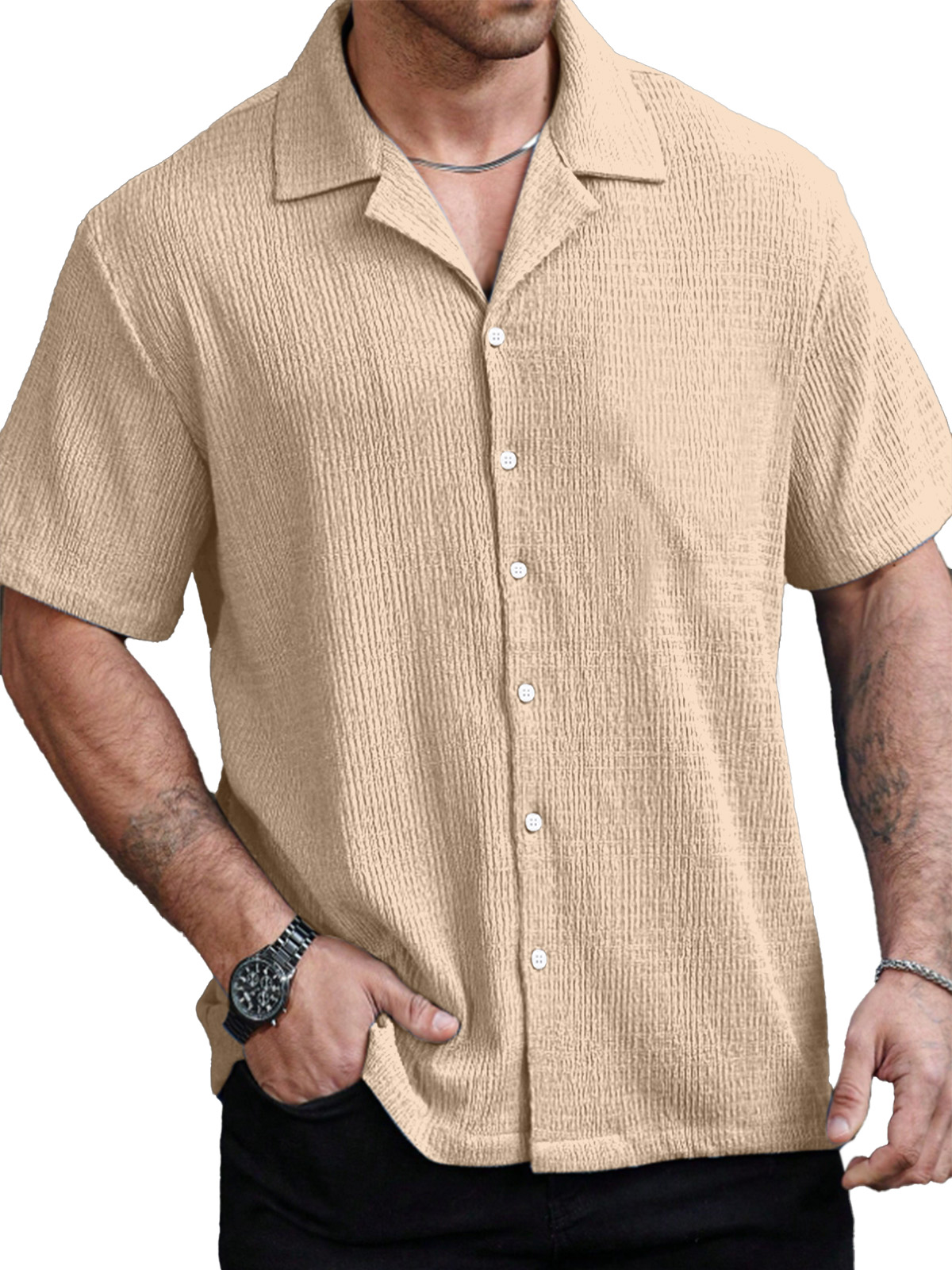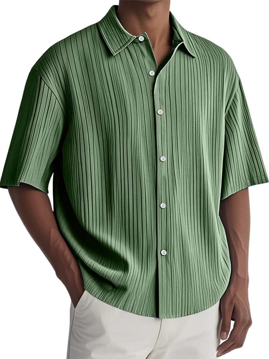Men's Daily Simple Solid Color Ribbed Cuban Collar Short-sleeved Shirt$39.99 USD -