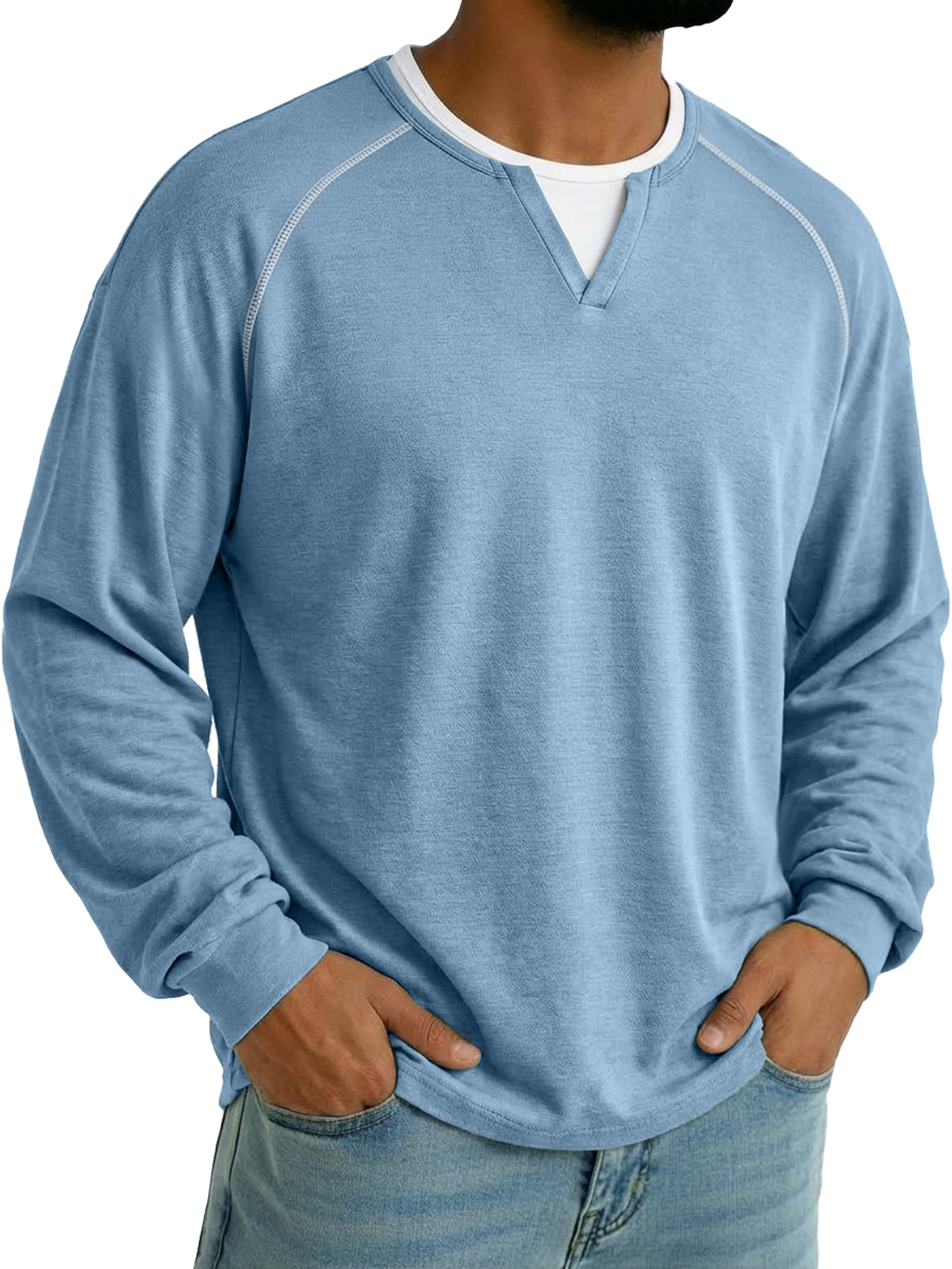 Men's Faux Two-piece Double-layered Collar Raglan Sleeve Casual Long-sleeved T-shirt$42.99 USD -