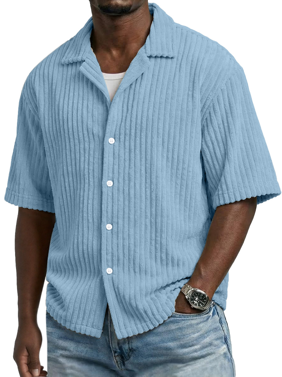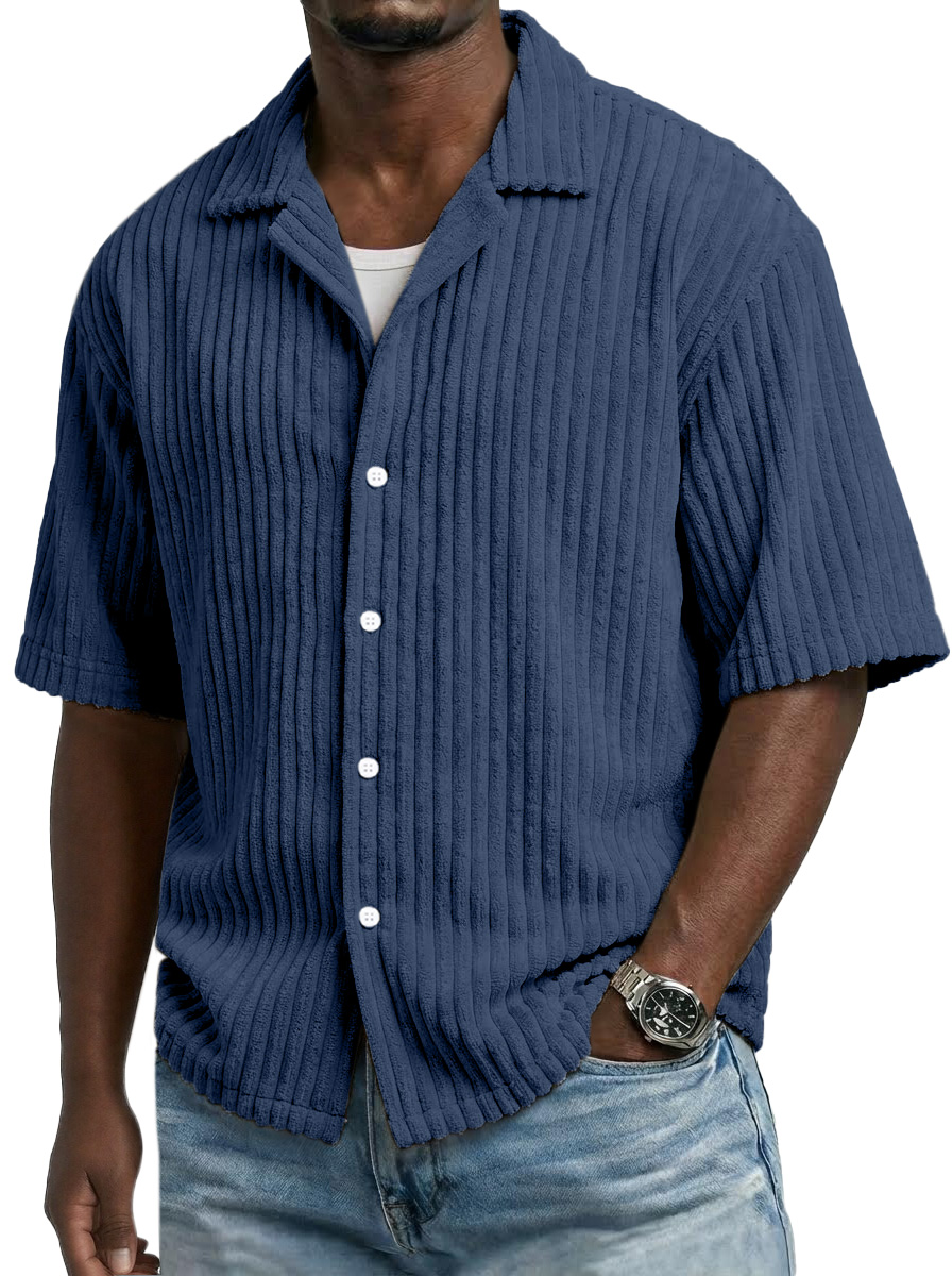 Men's Simple Solid Color Corduroy Short-Sleeved Cuban Collar Shirt$42.99 USD -