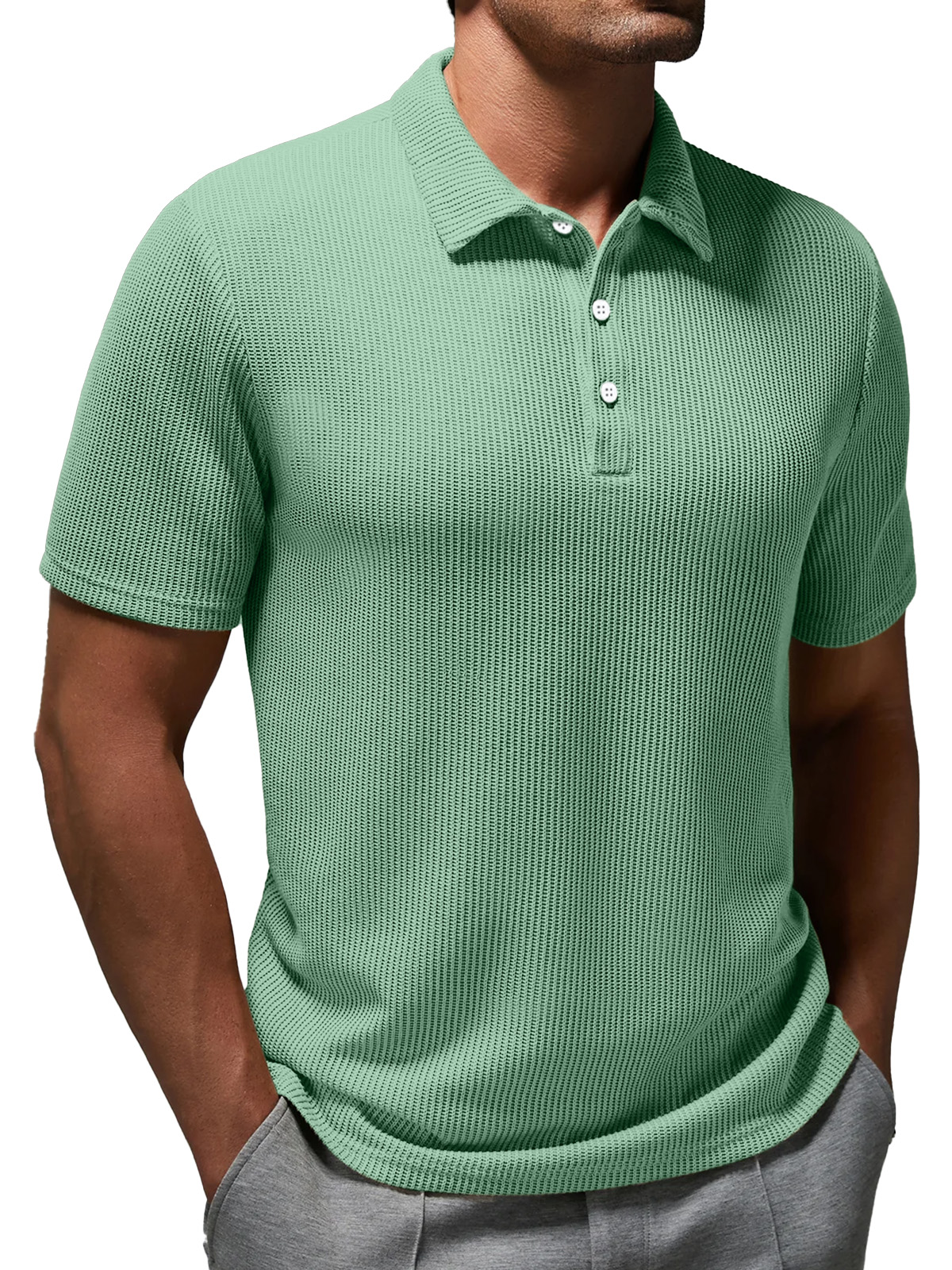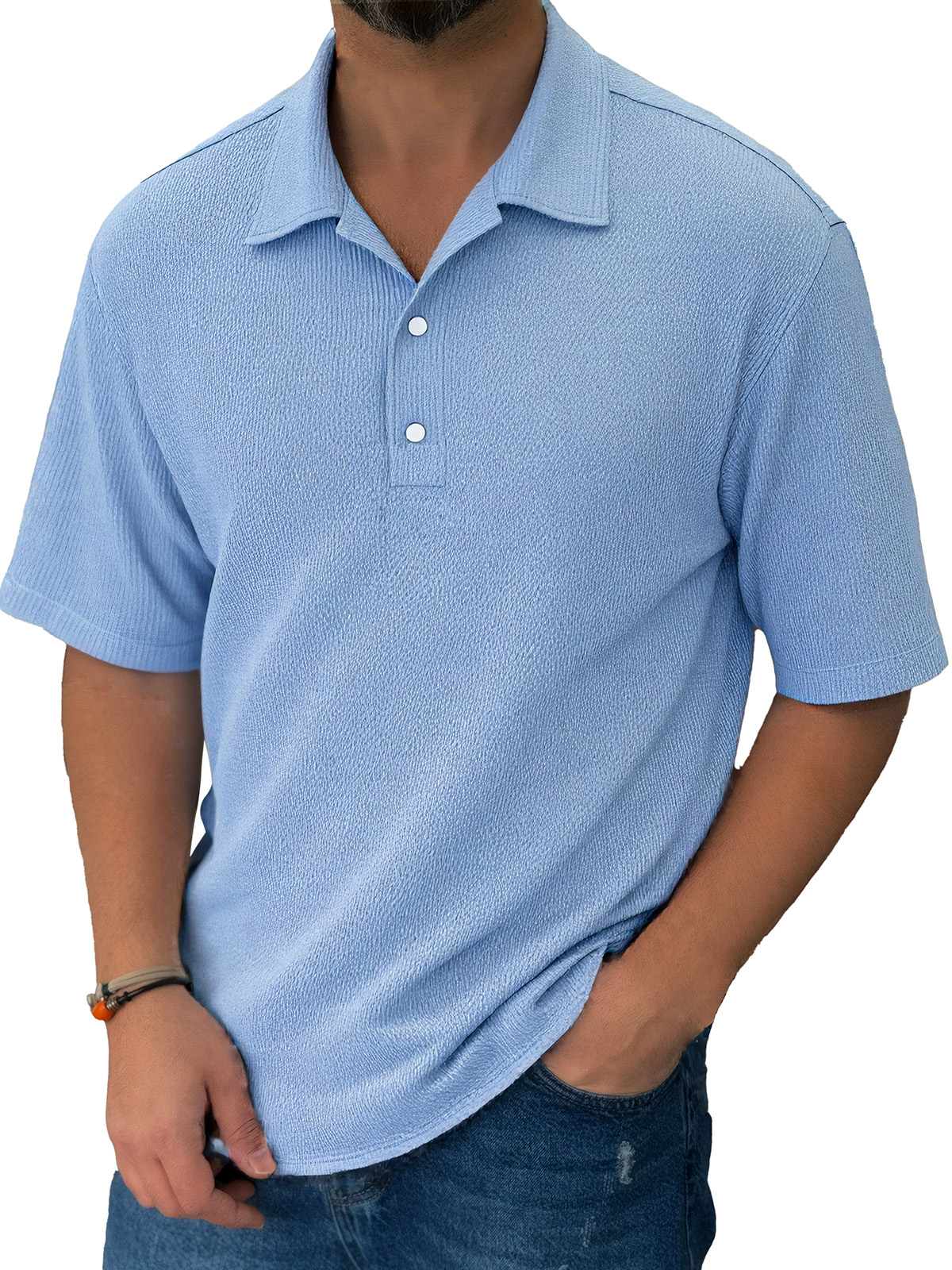 Men's Casual Solid Color Texture Short-sleeved Button-down Polo Shirt$39.99 USD -