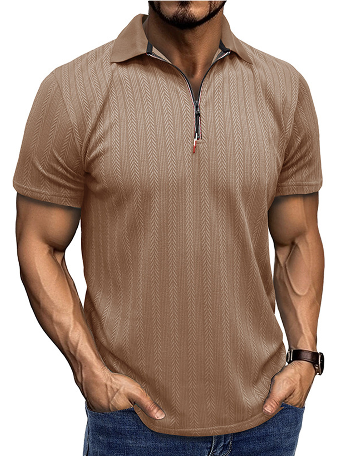 Men's Casual Lapel Jacquard Zip Short Sleeve POLO Shirt$39.99 USD -