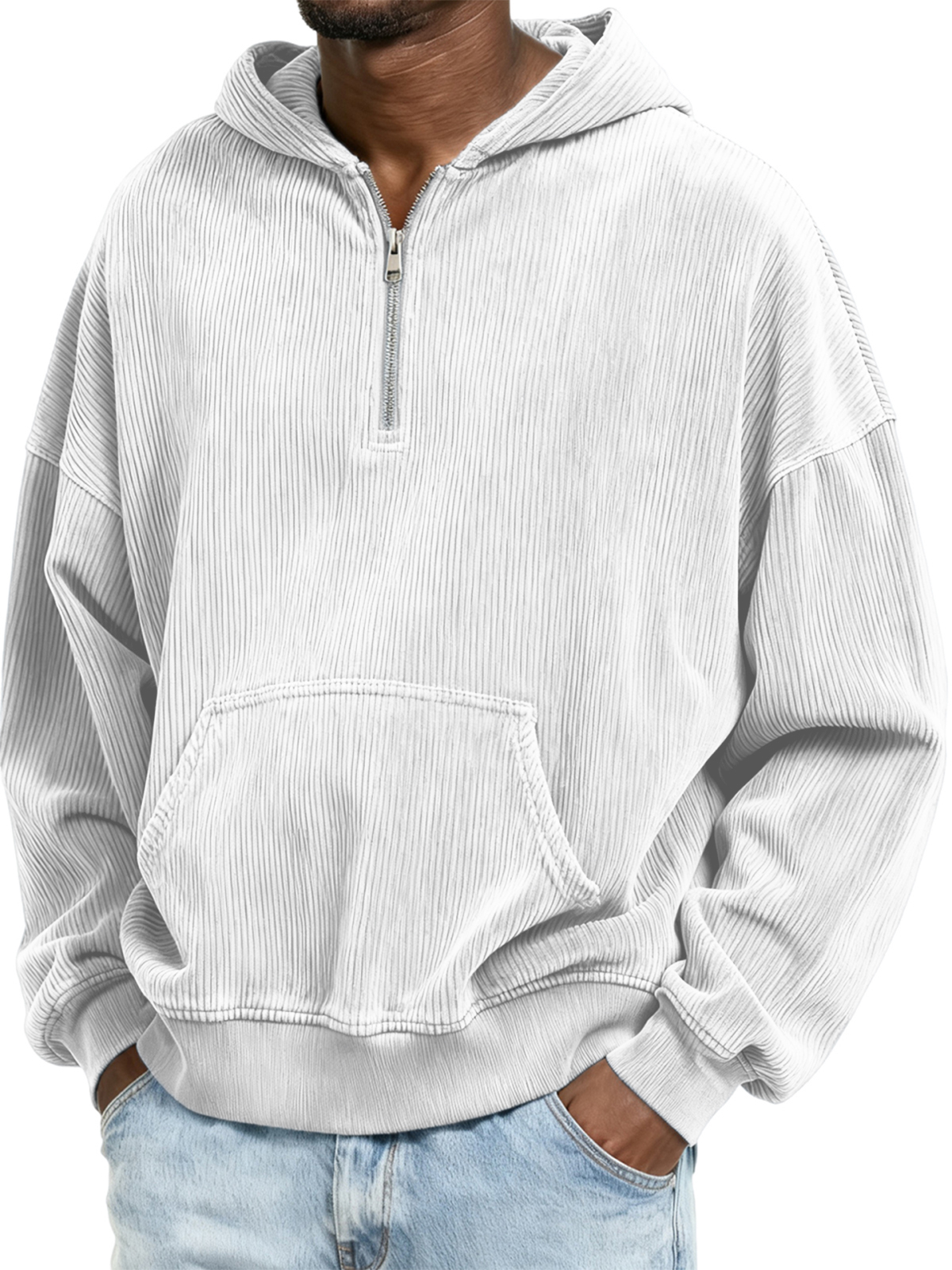 Corduroy Ribbed Stylish Quarter Zip Pullover Sweatshirt with Kangaroo Pocket