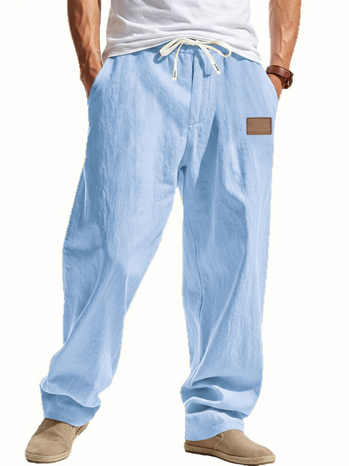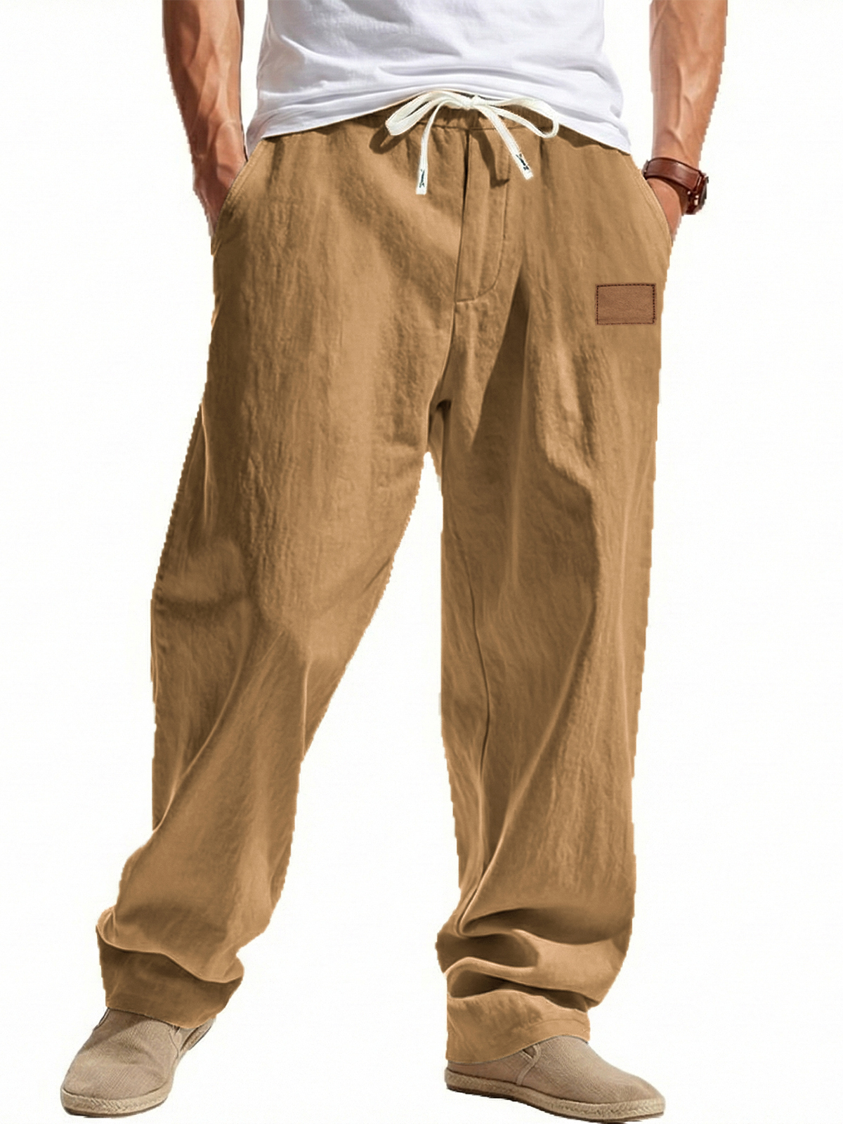 Loose-fitting Linen Wide-leg Beach Trousers with Embroidered Label