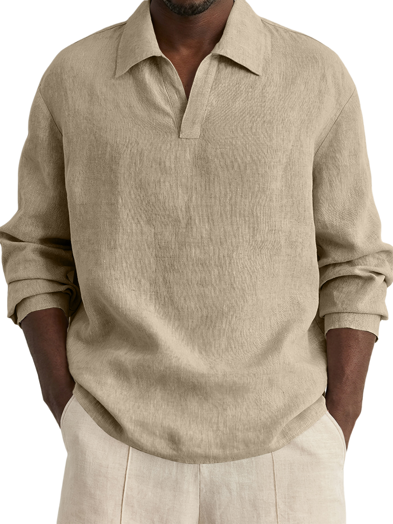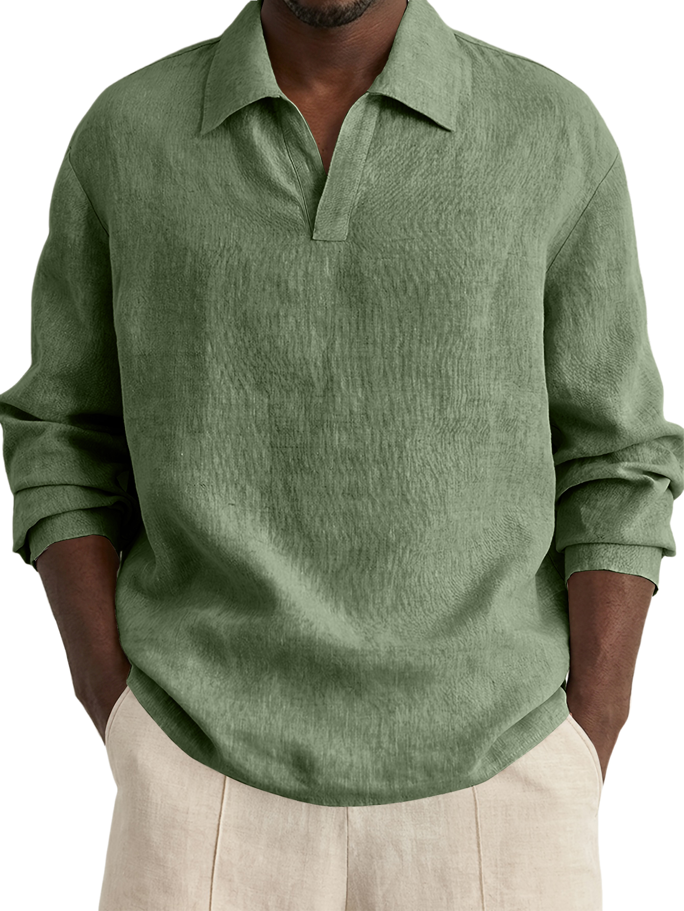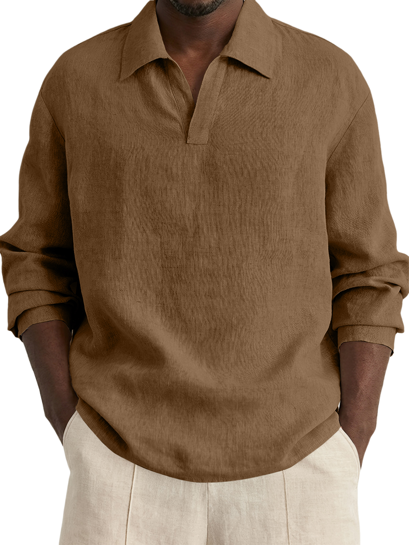 Men's Casual Simple Cotton Linen V-Neck Long-Sleeve Shirt