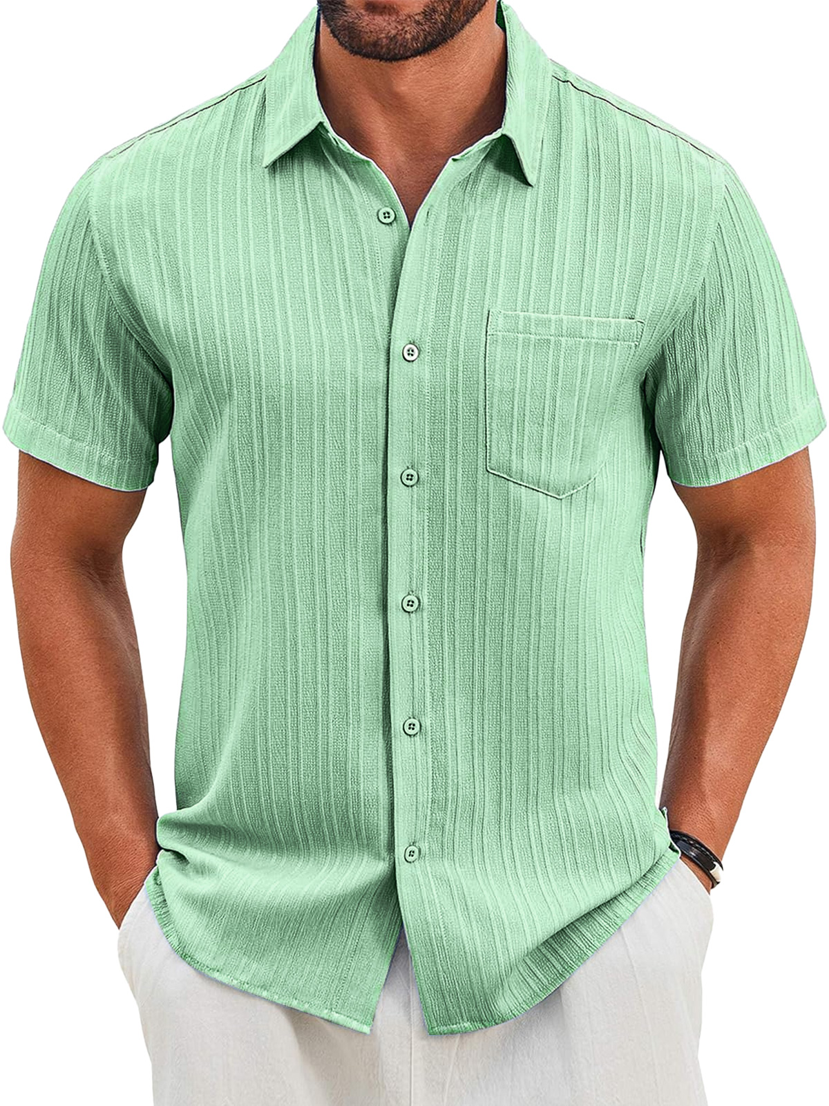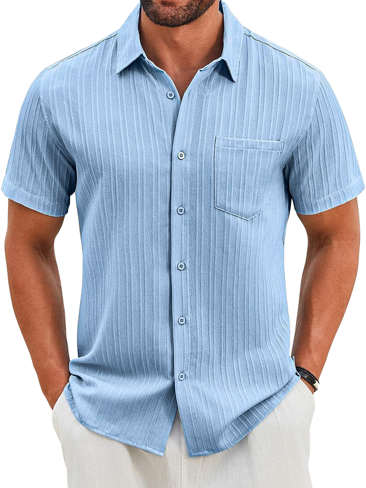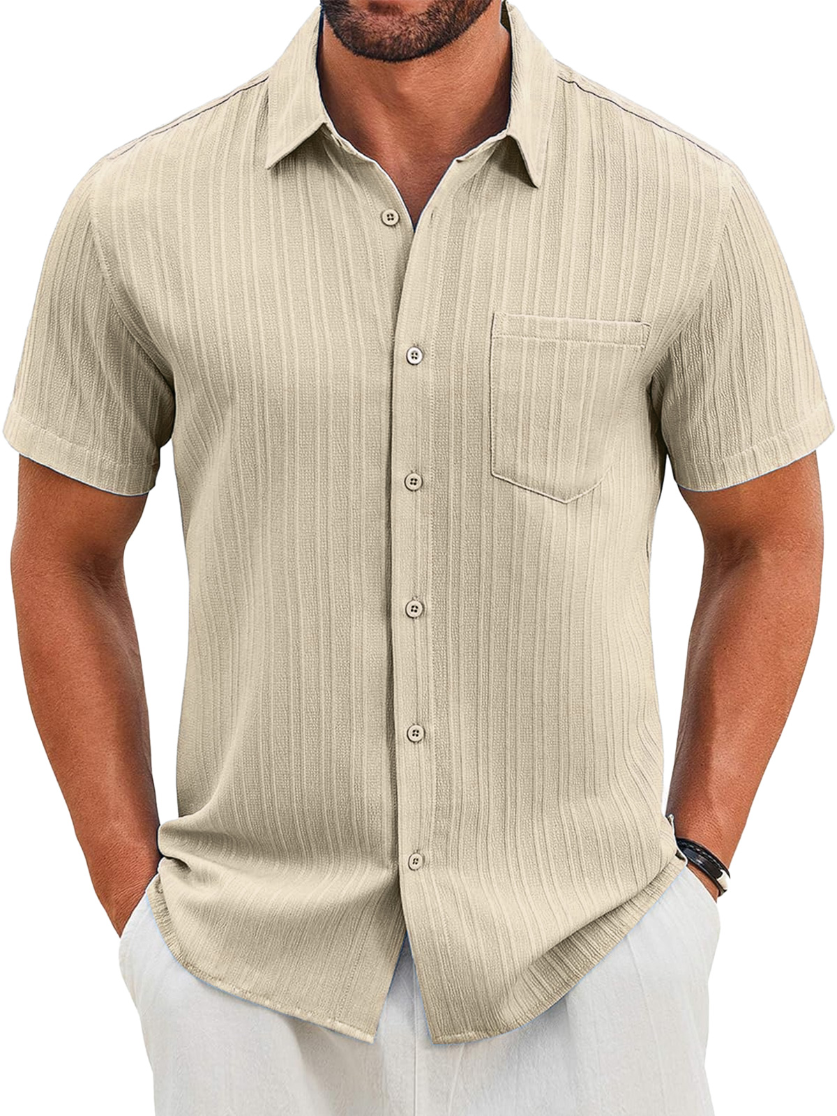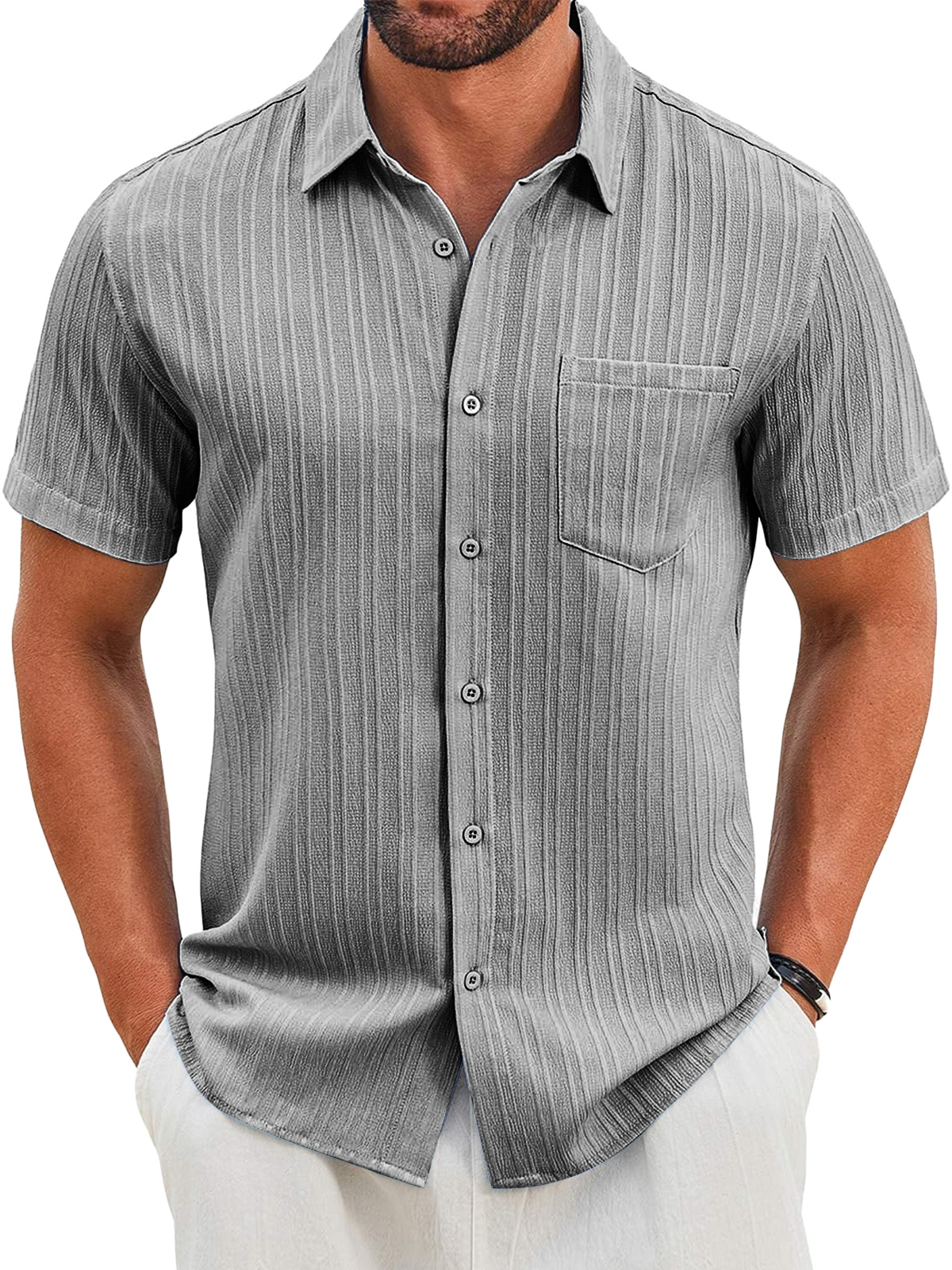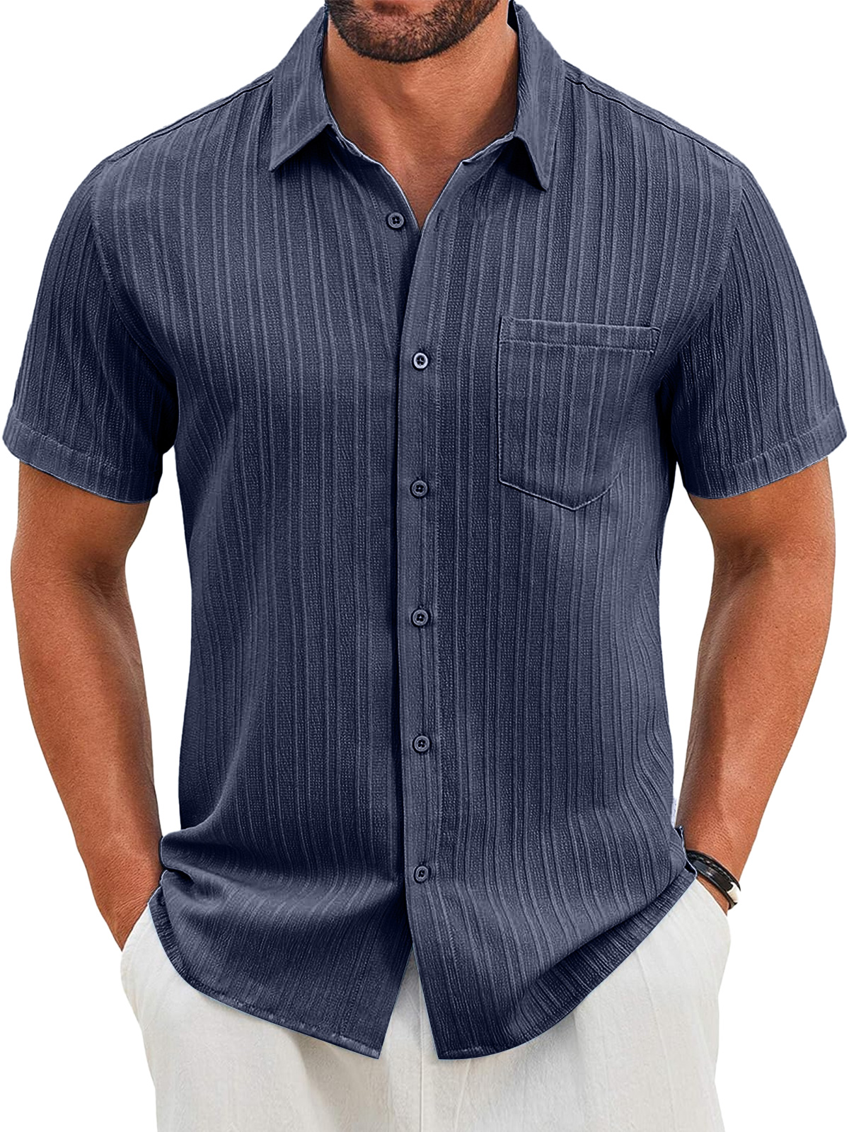 Men's Casual Vertical Striped Textured Lapel Solid Color Short-sleeved Shirt