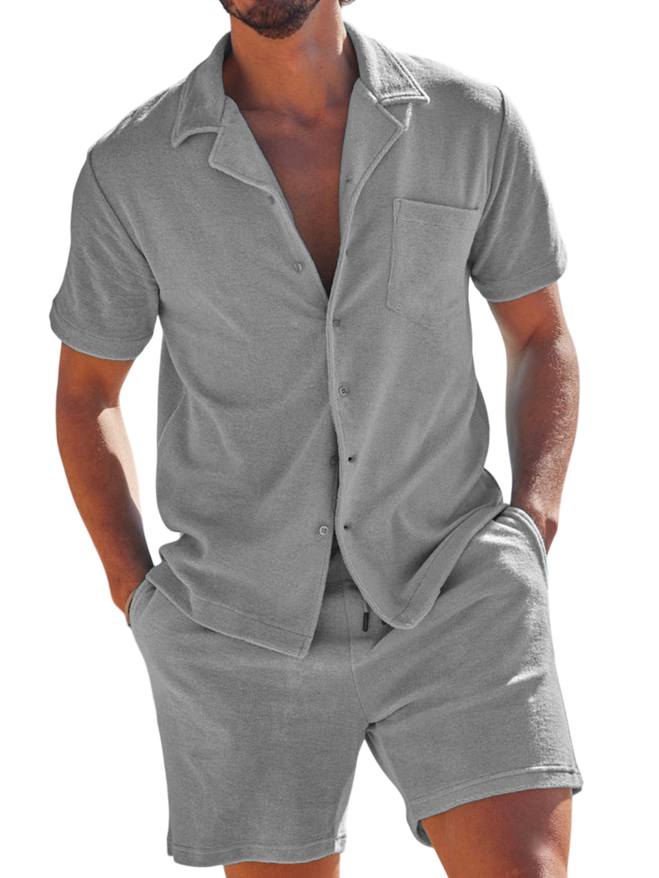 Men's Comfortable Terry Camp Collar Holiday Leisure Suit with Chest Pocket Short Sleeve Shirt Shorts Two-piece Set