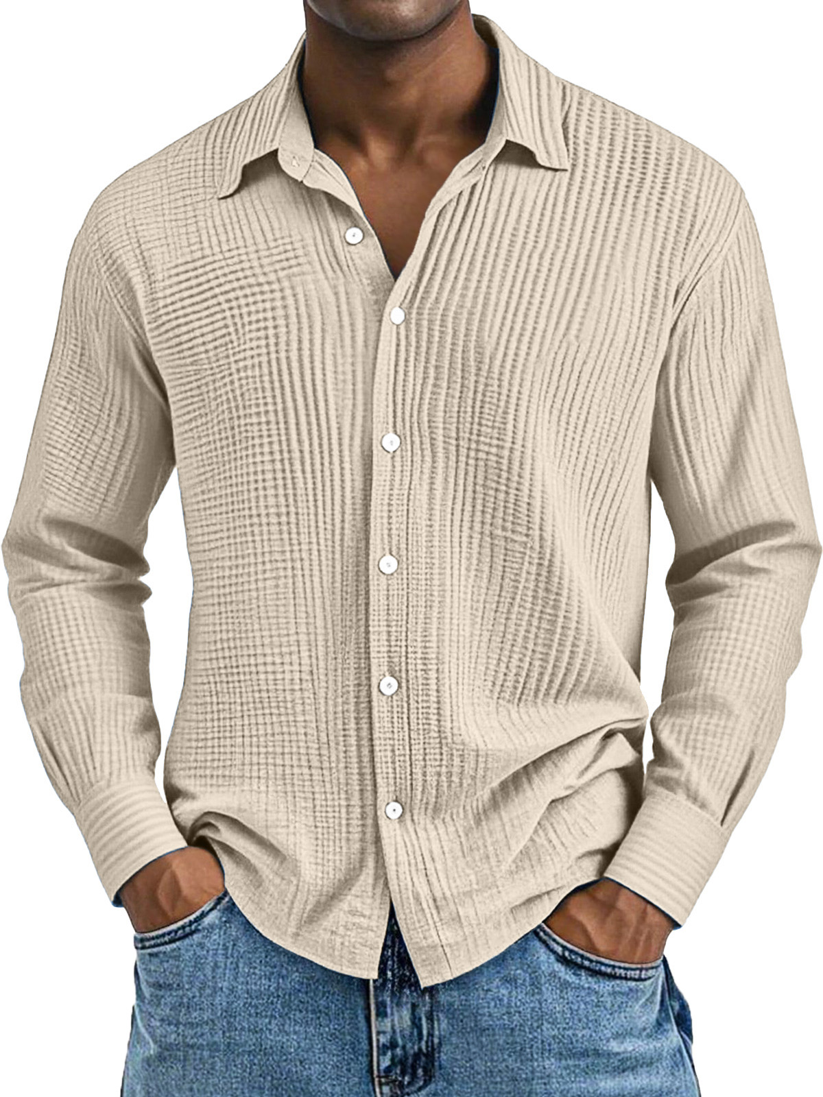 Men's Daily Casual Solid Color Pure Cotton Pleated Texture Long-sleeved Shirt