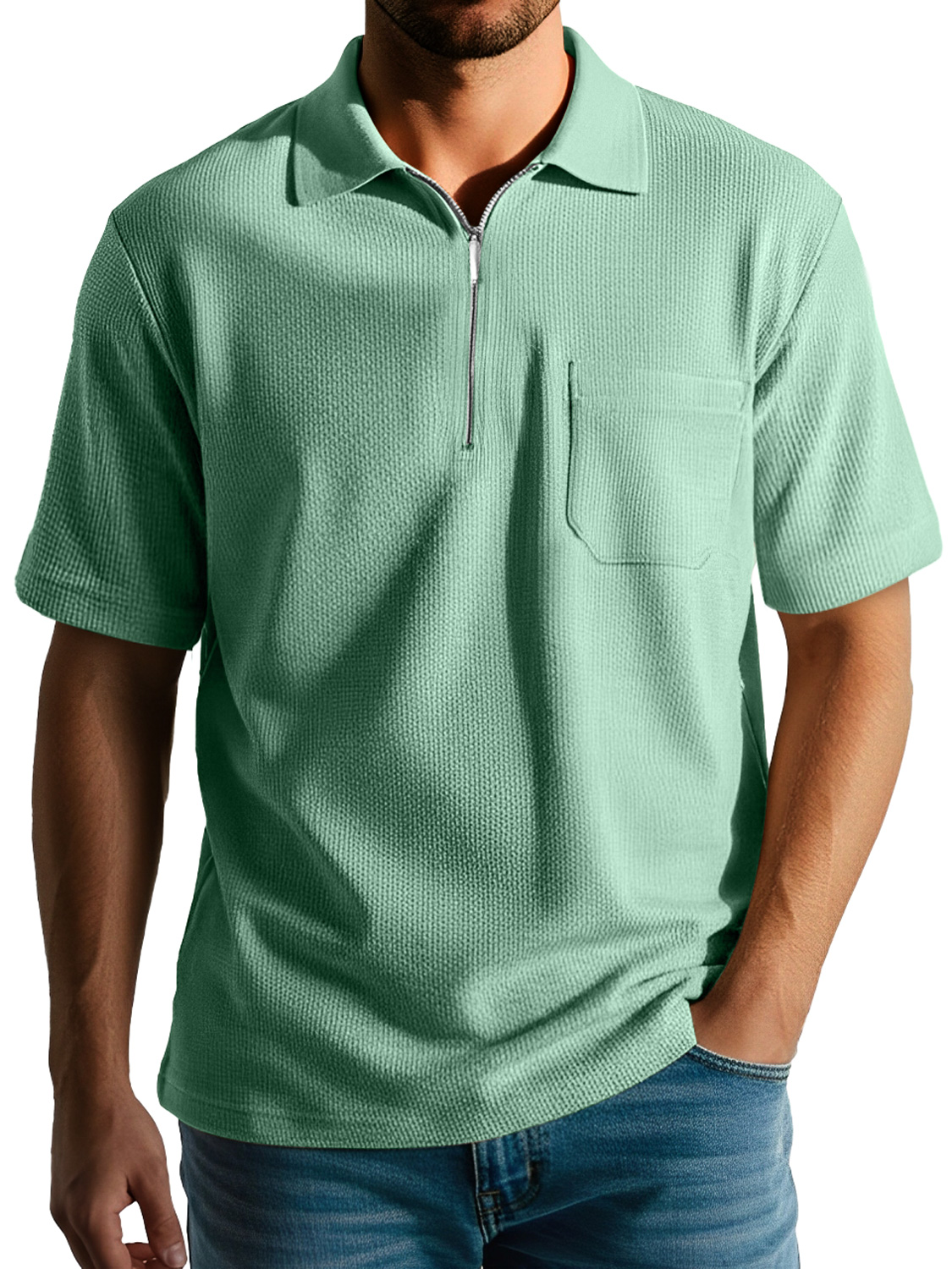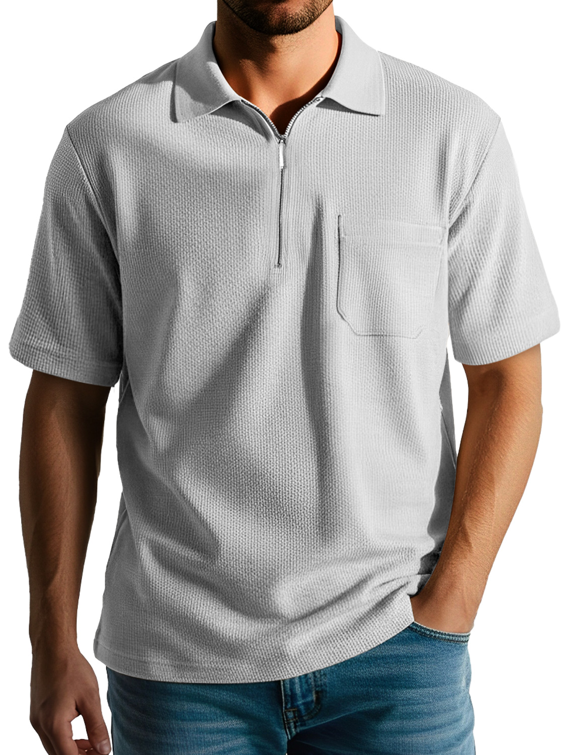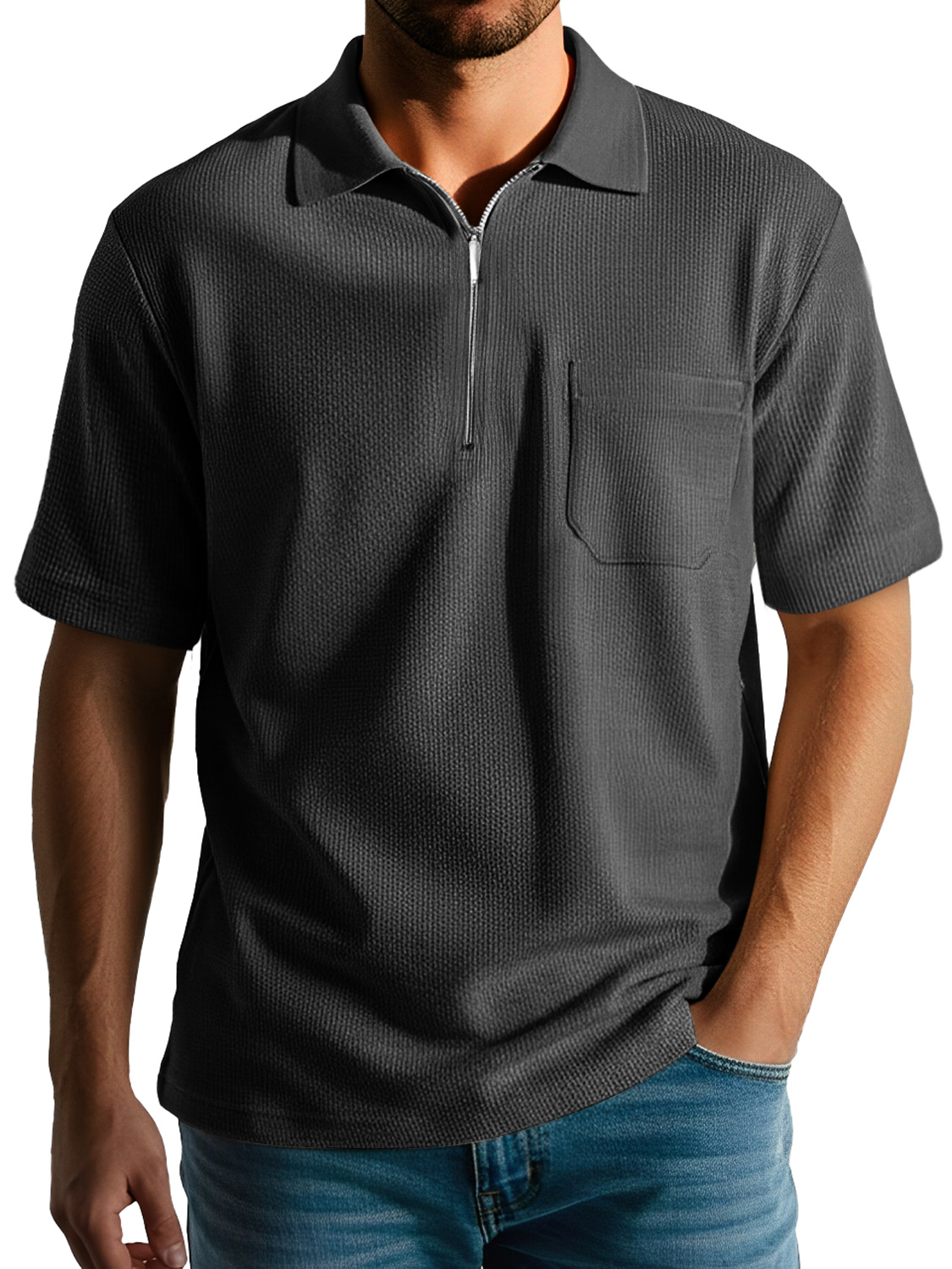 Men's Daily Casual Texture Lapel Zipper Comfortable Short-sleeved Polo Shirt