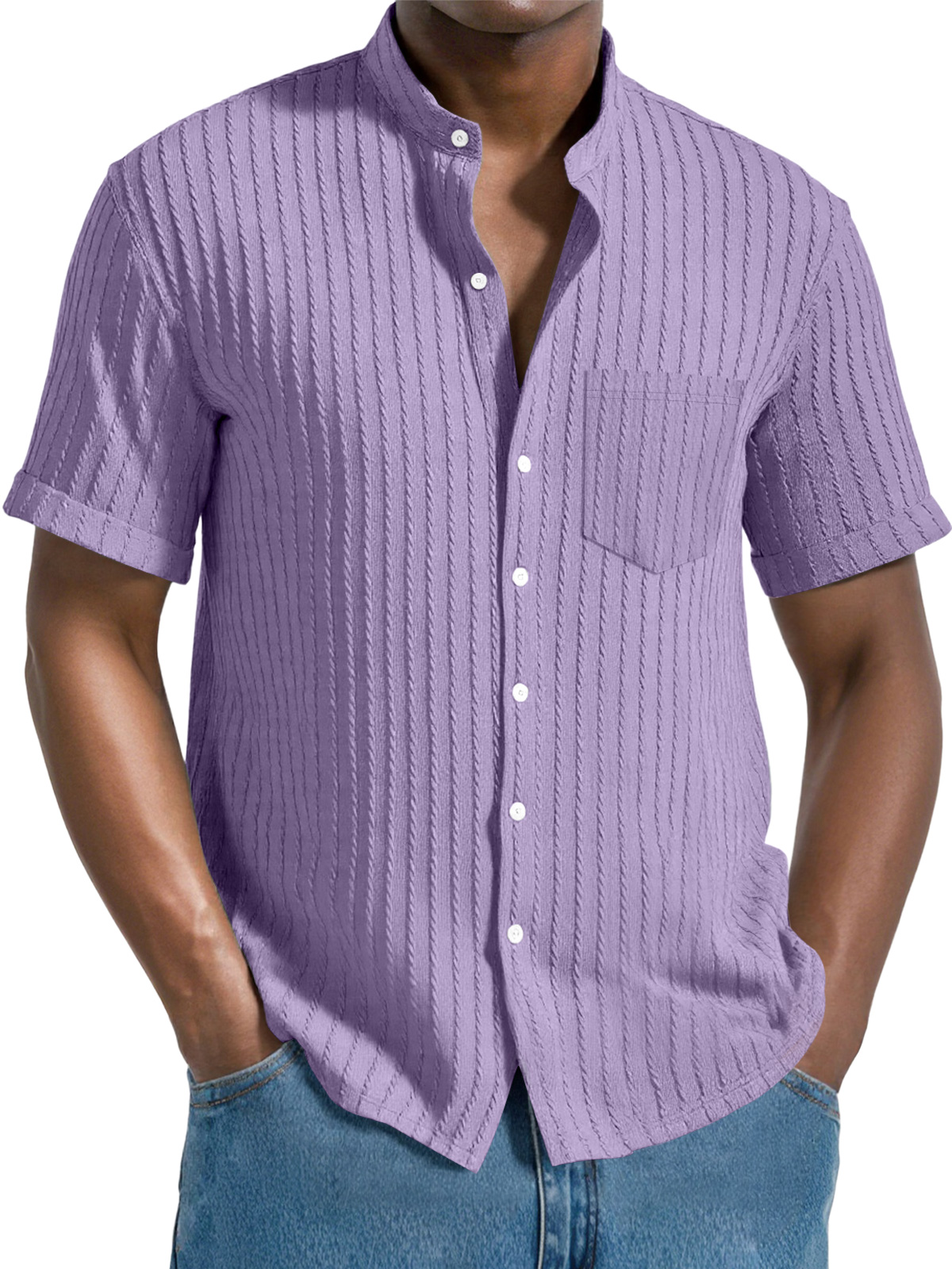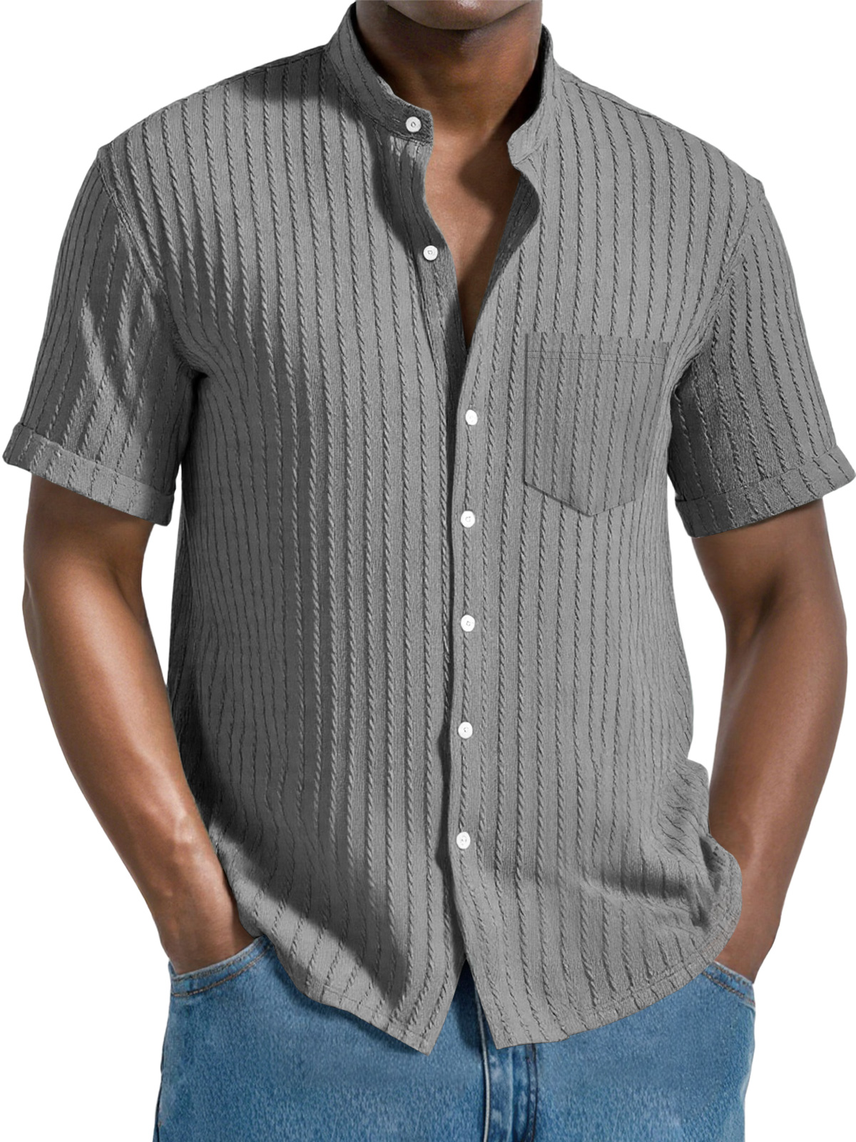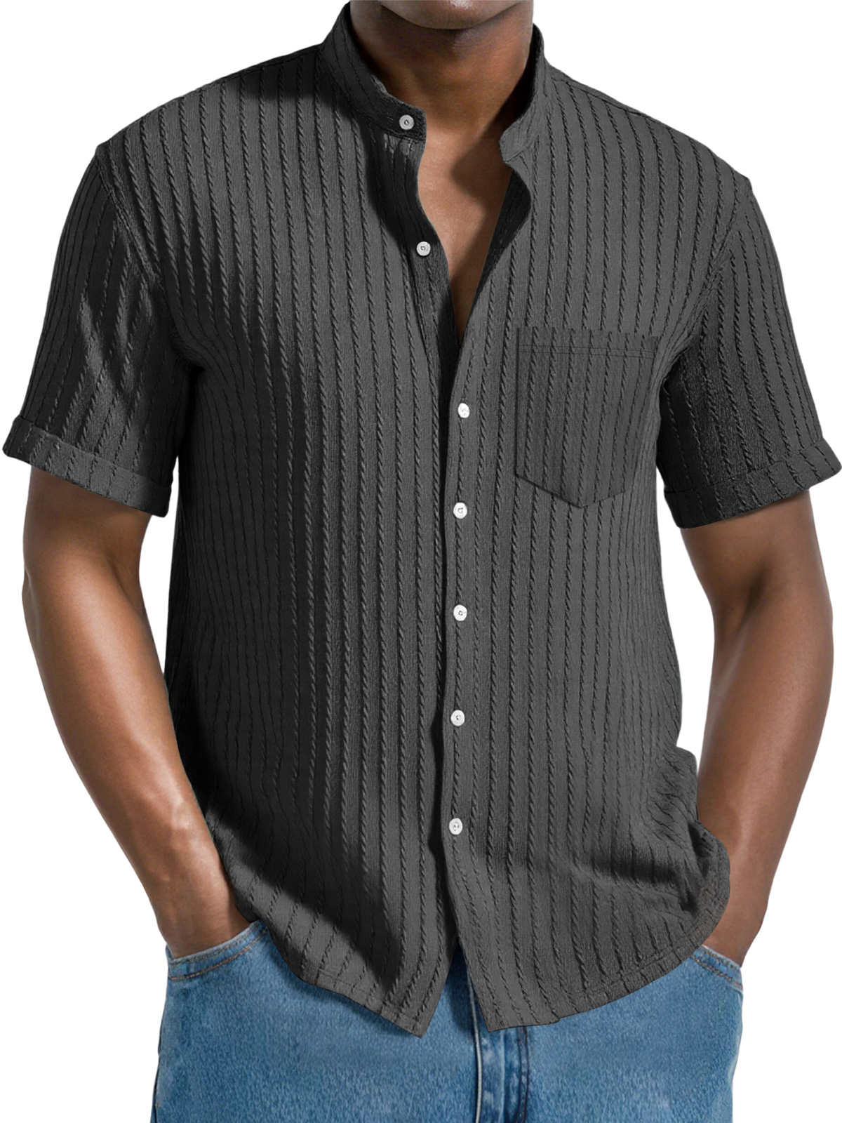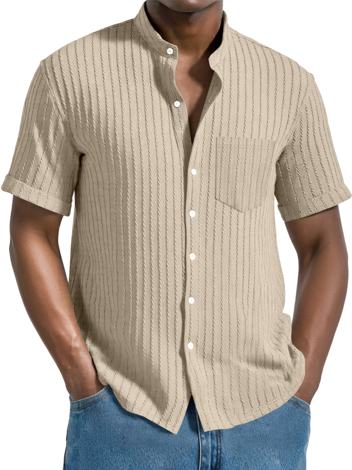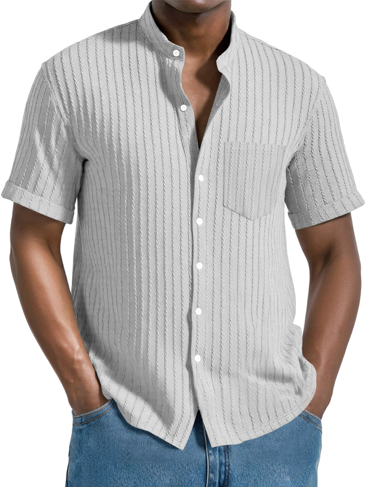 Men's Daily Jacquard Texture Stand Collar Button Casual Short Sleeve Shirt