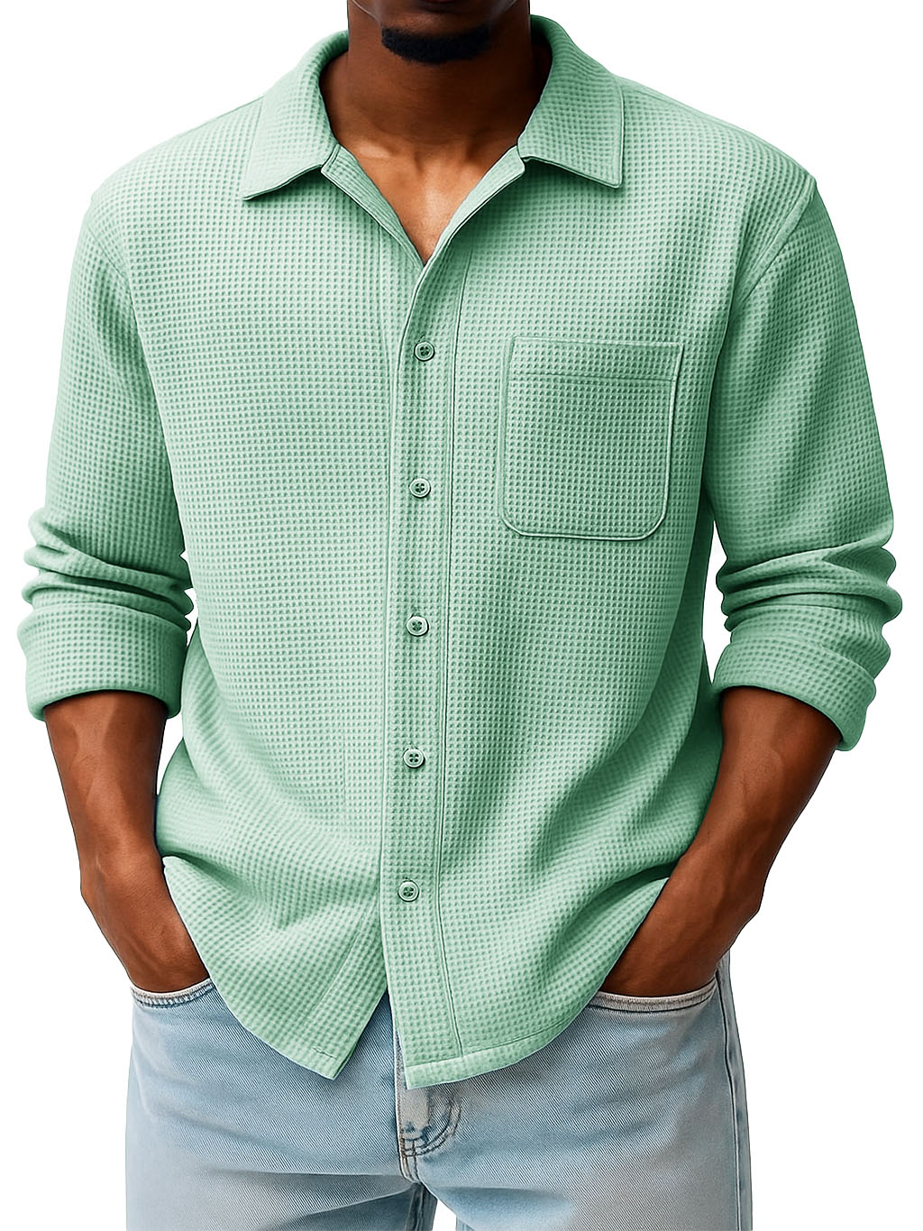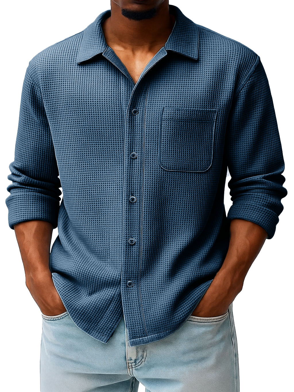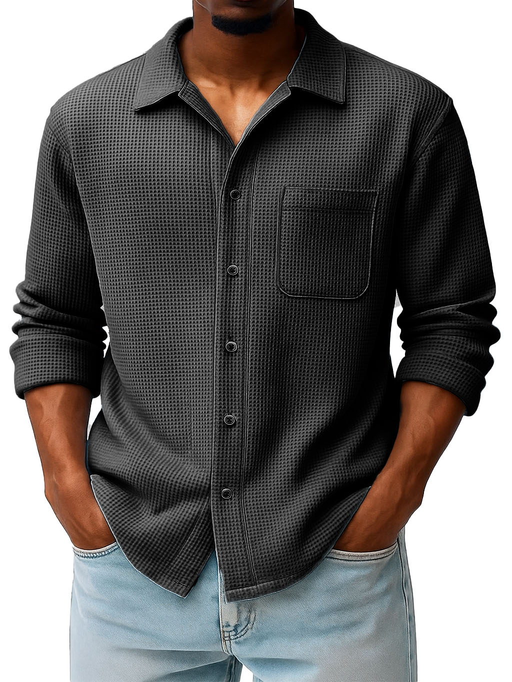 Men's Fashion Casual Waffle Fabric Pocket Long Sleeve Lapel Shirt