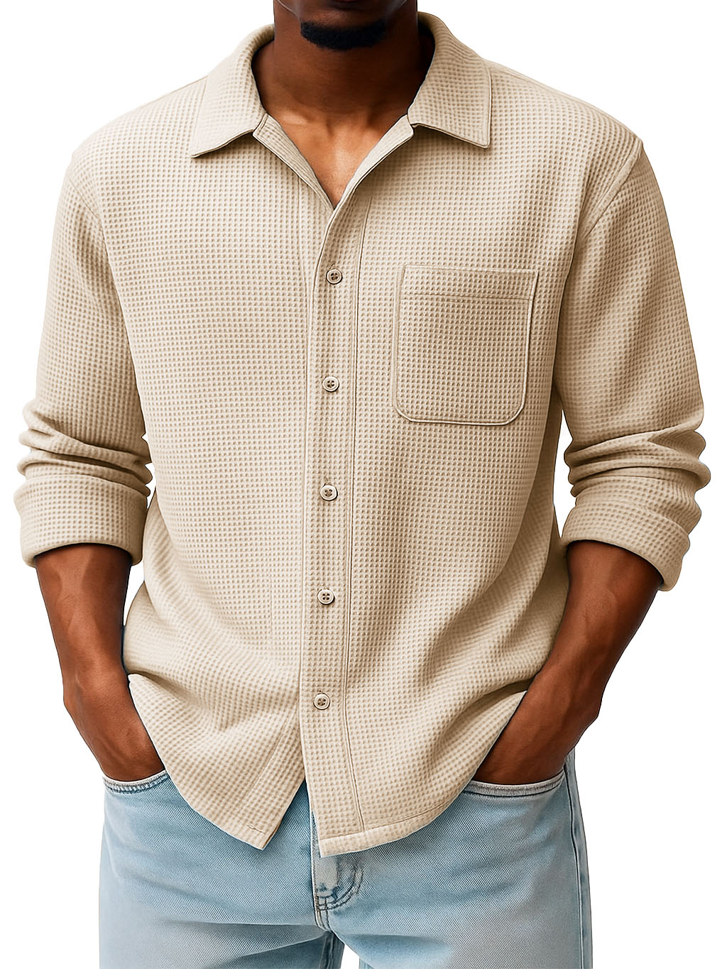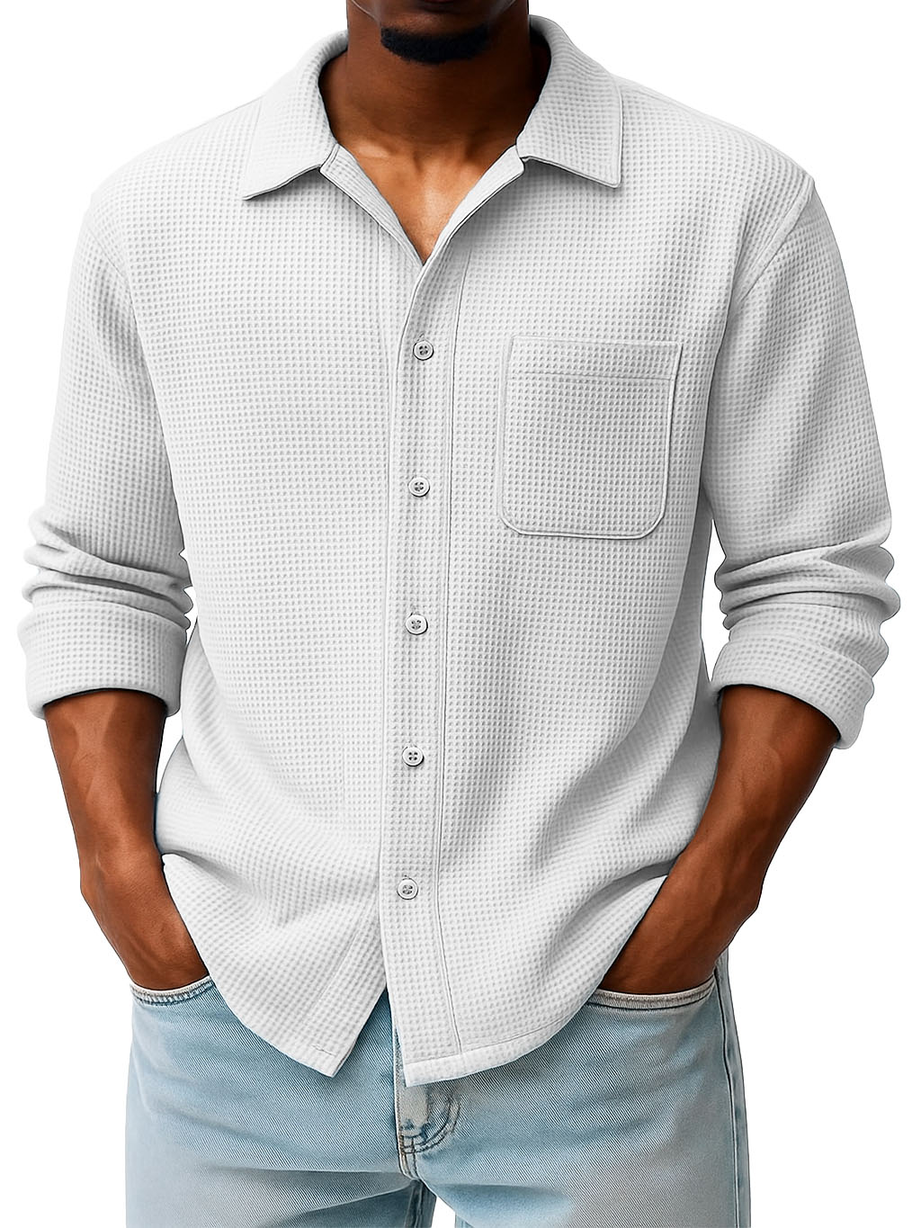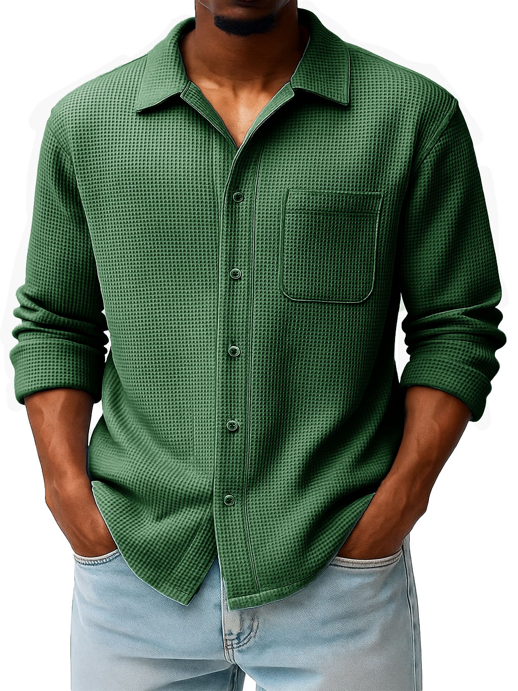 Men's Fashion Casual Waffle Fabric Pocket Long Sleeve Lapel Shirt