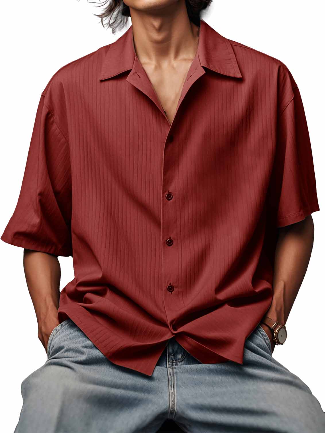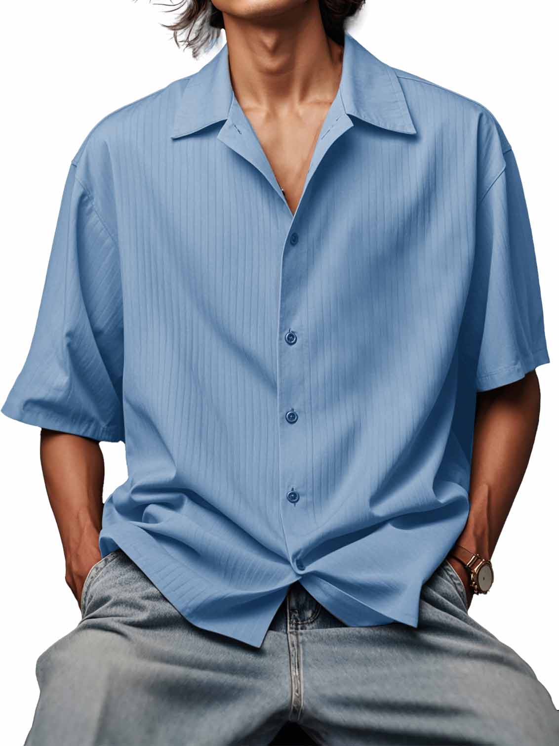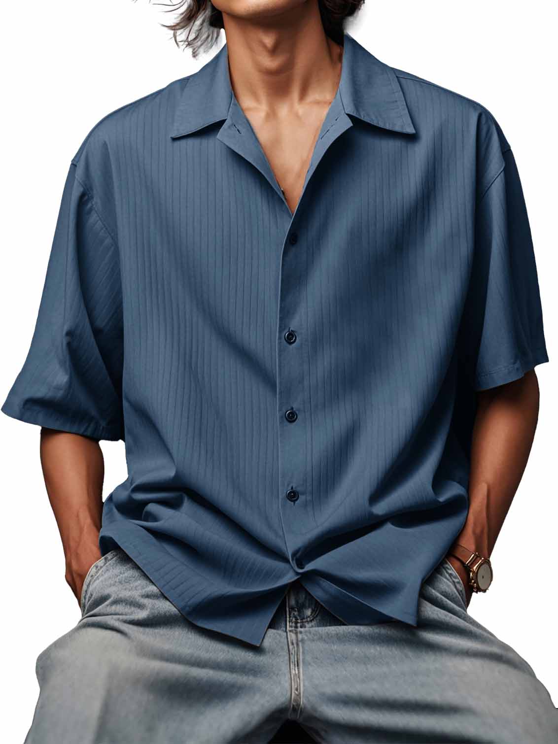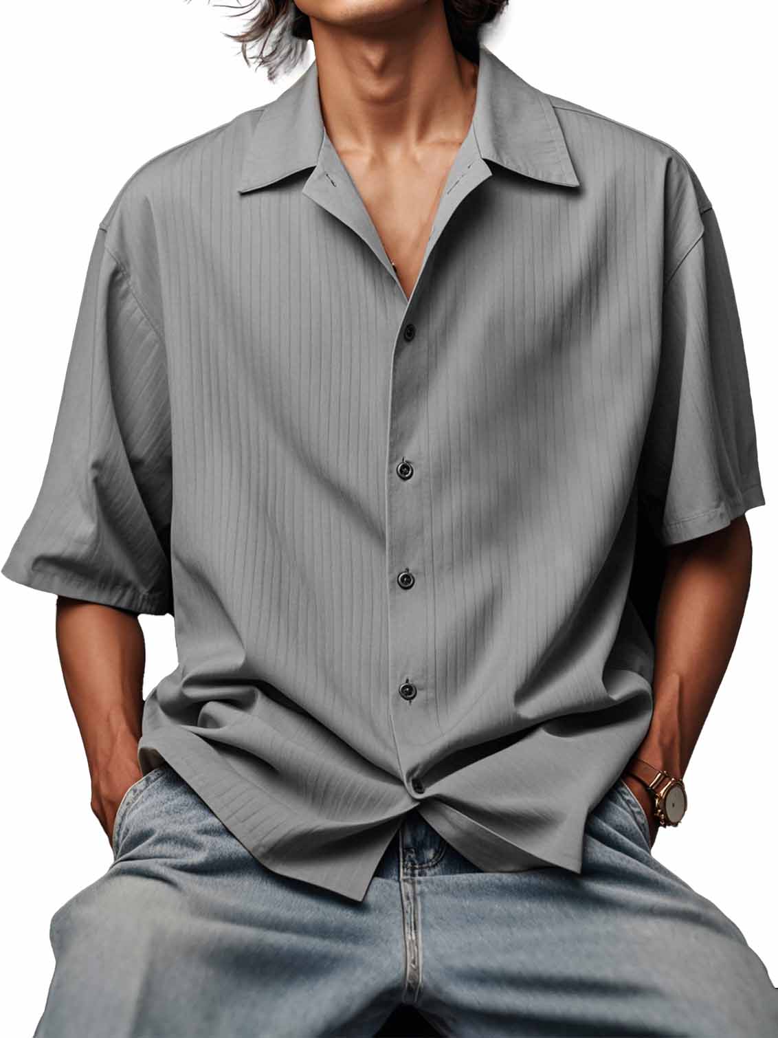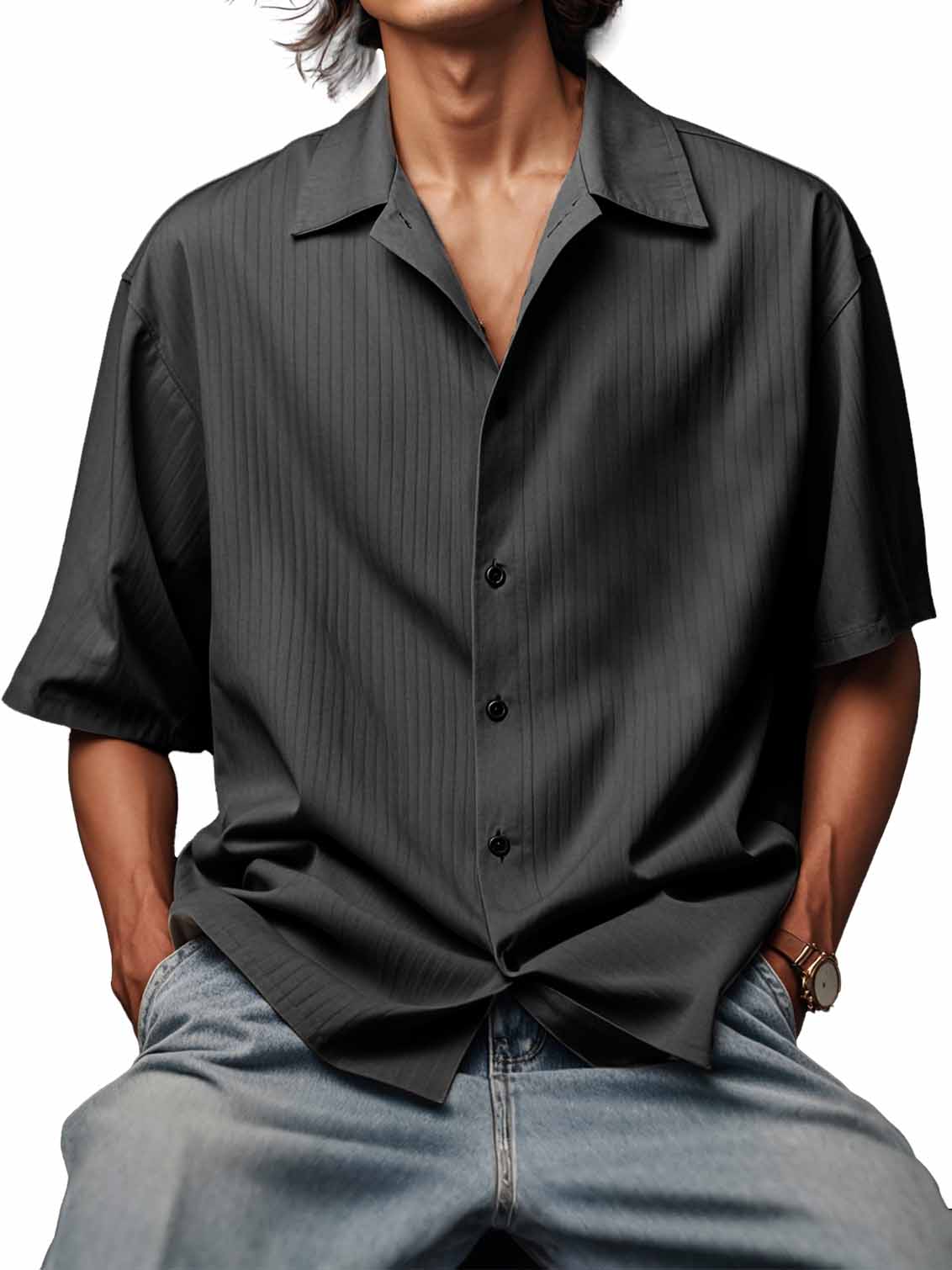 Men's Fashionable Ribbed Fabric Short-Sleeved Lapel Shirt
