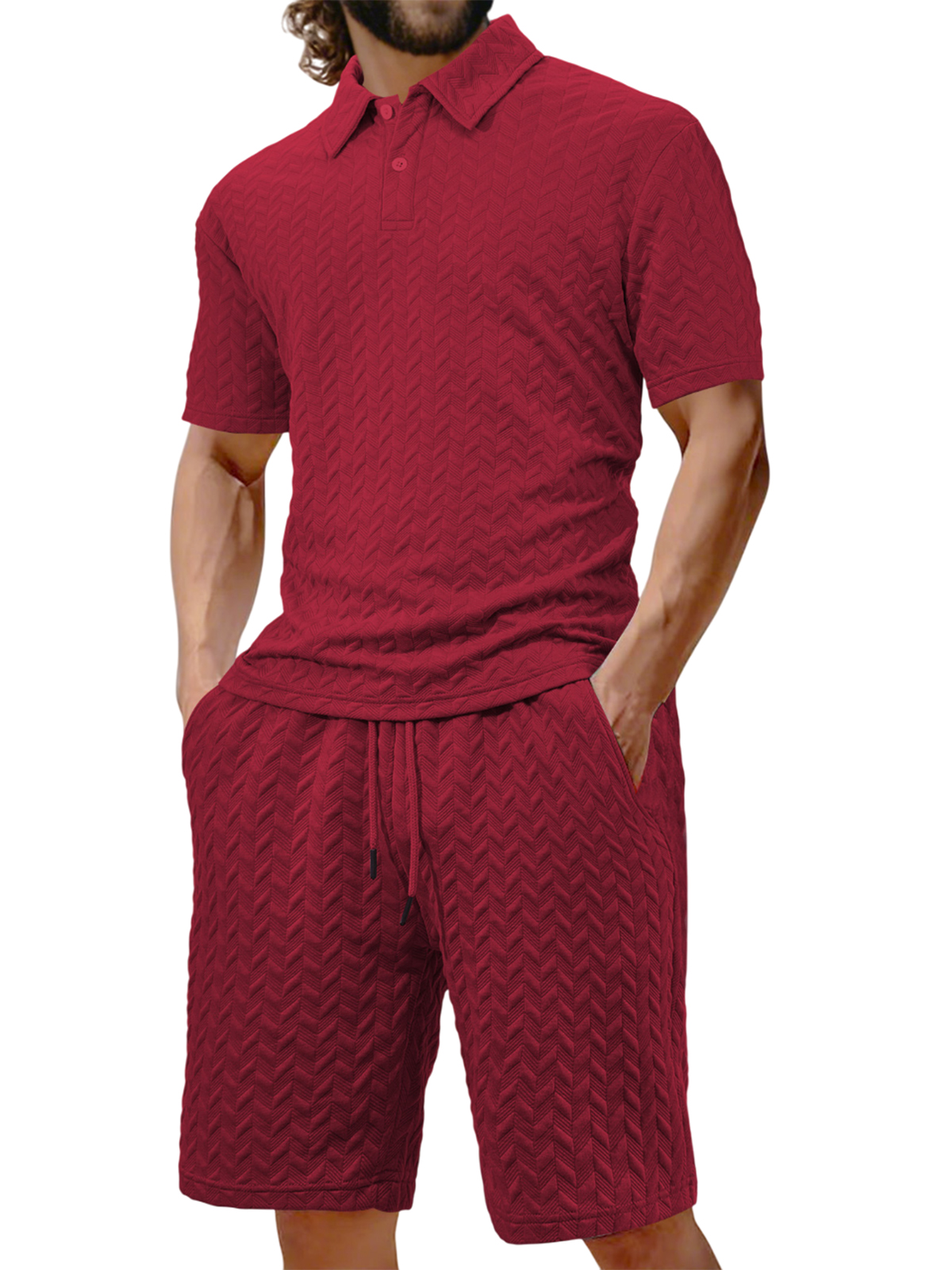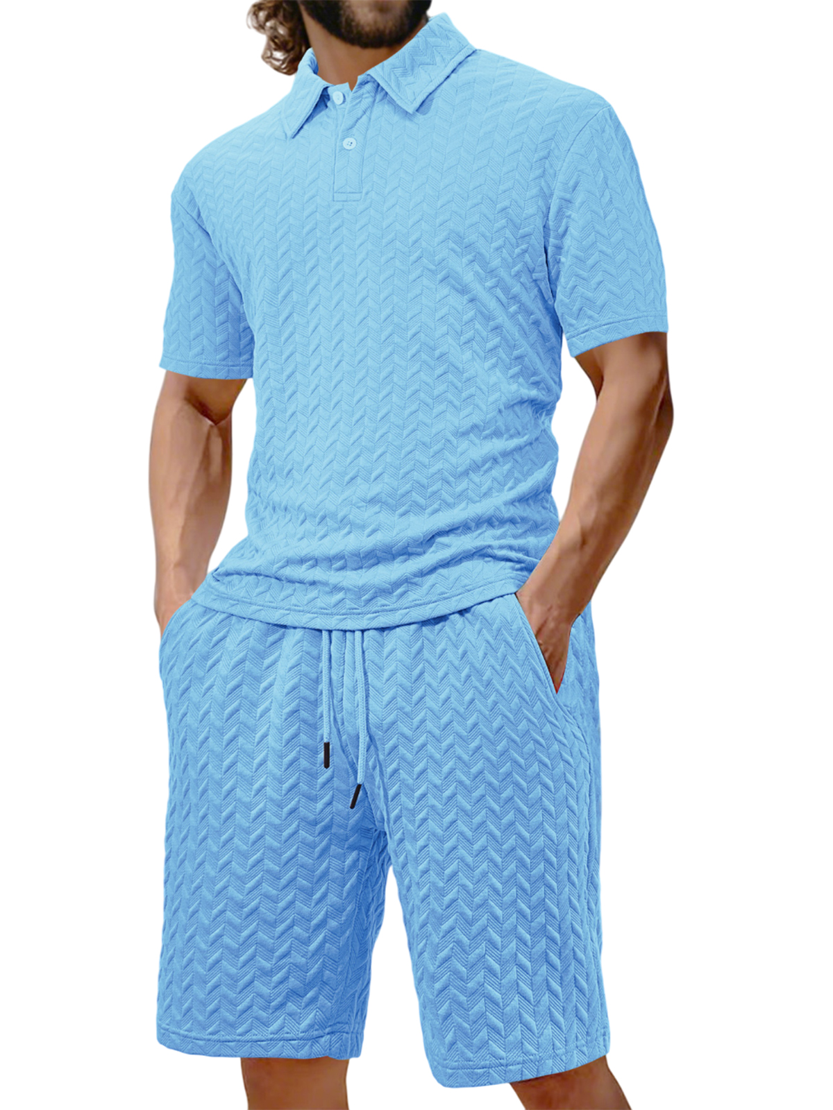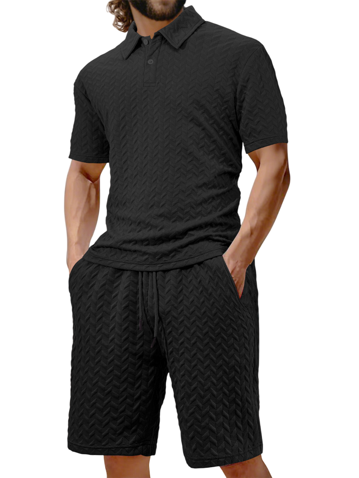 Men's Jacquard Texture Holiday Casual Polo Shirt Lapel Short-sleeved Shorts Suit