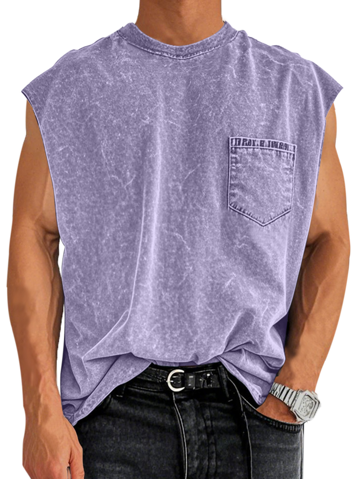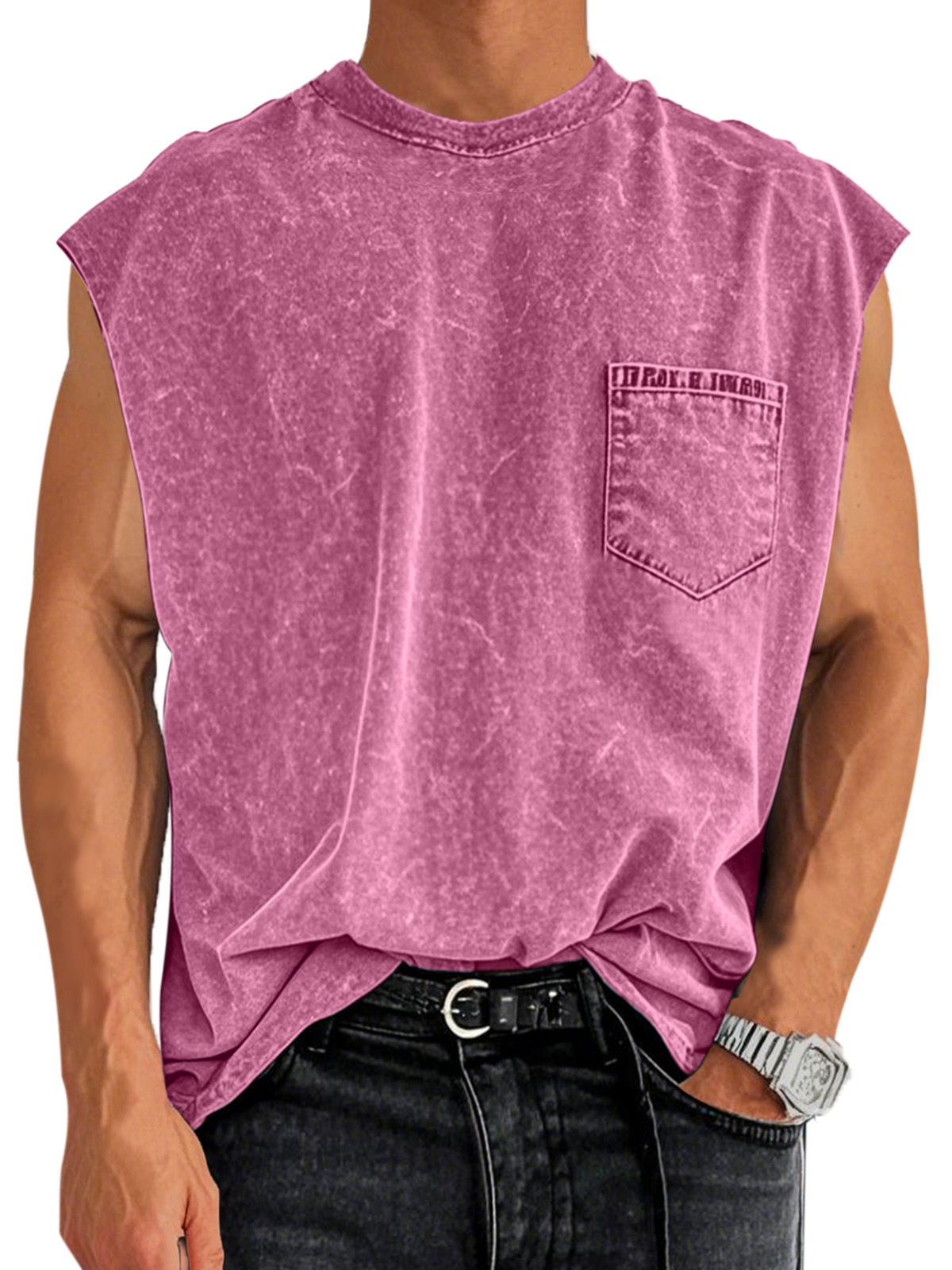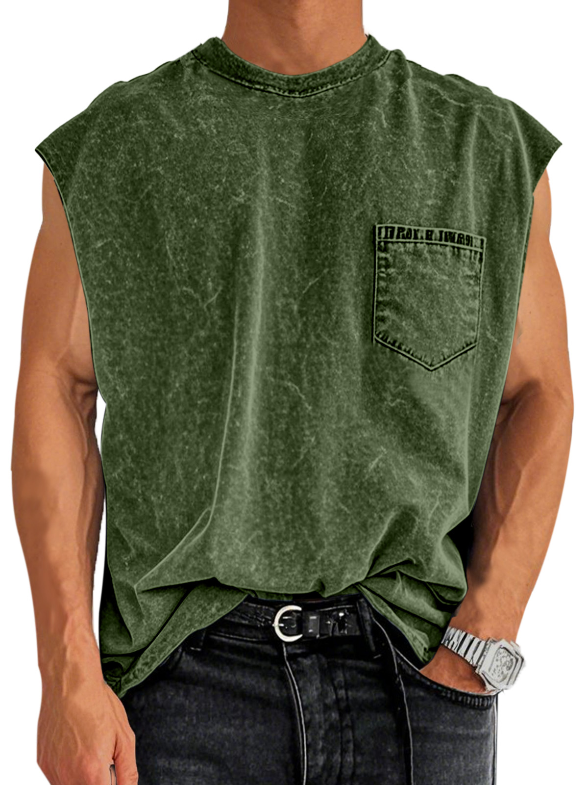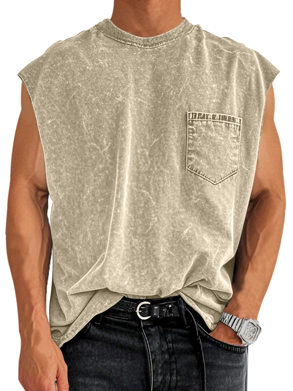 Men's Retro Cotton Washed Pocket Round Neck Sleeveless T-shirt