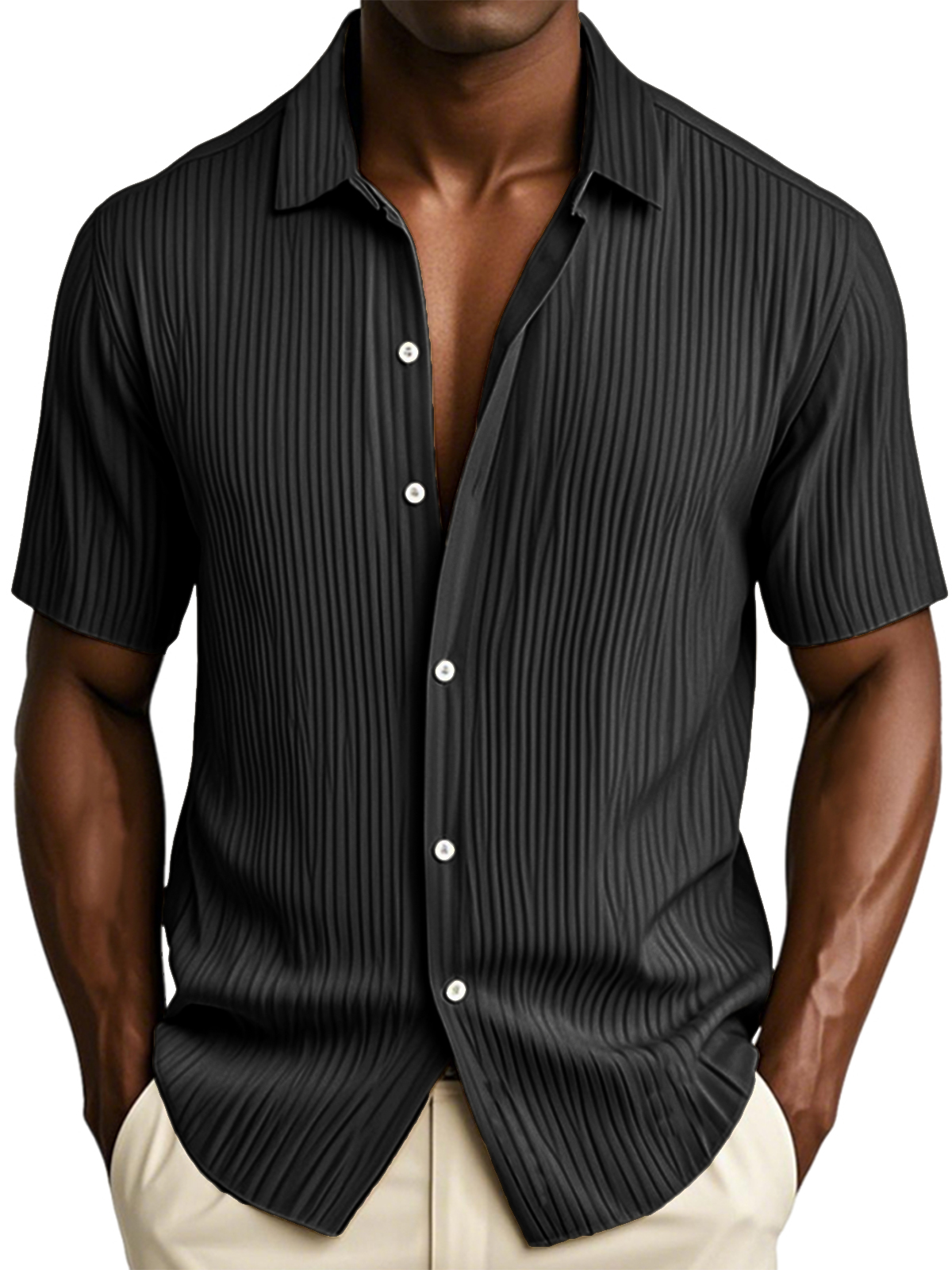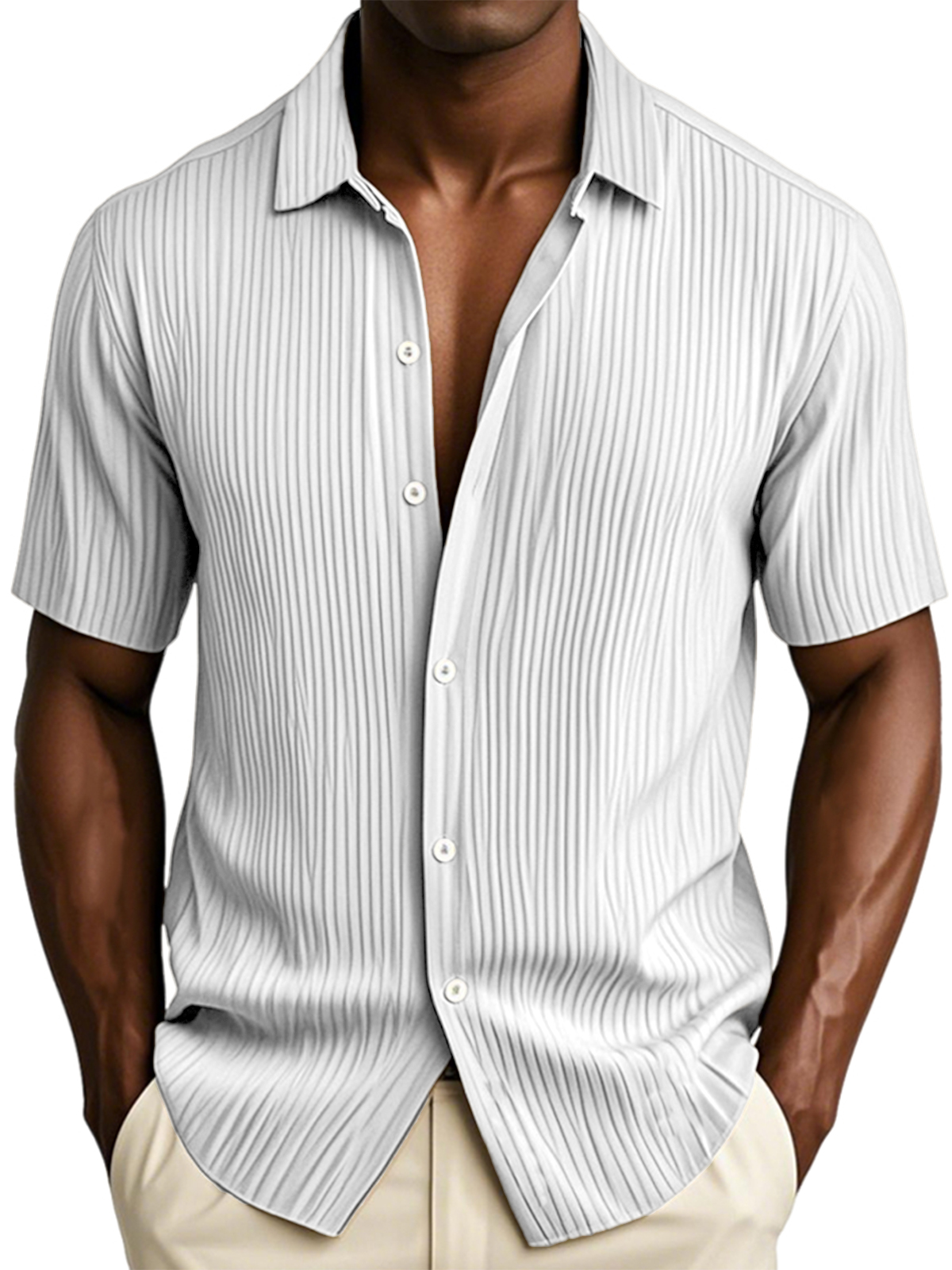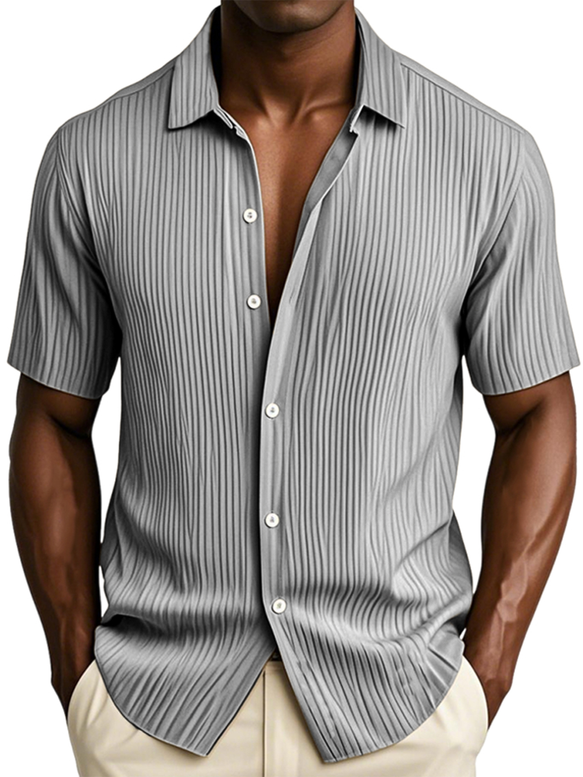 Men's Textured Vertical Striped Ice Silk Ripped Casual Button-down Short-sleeved Shirt