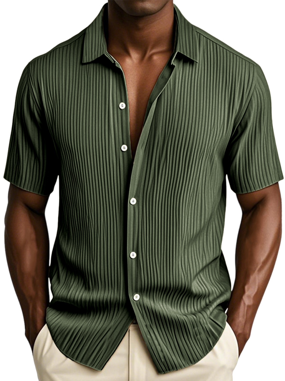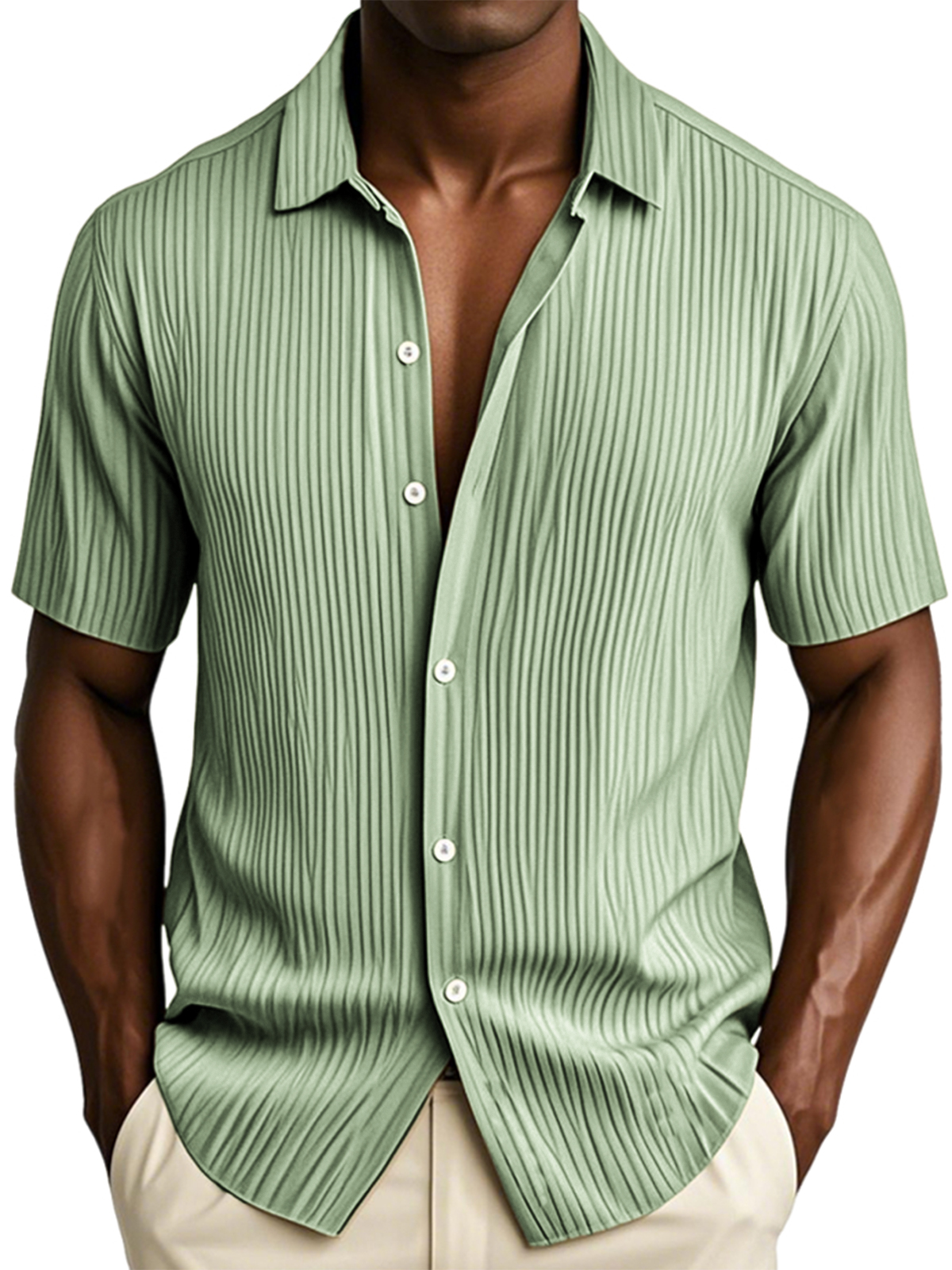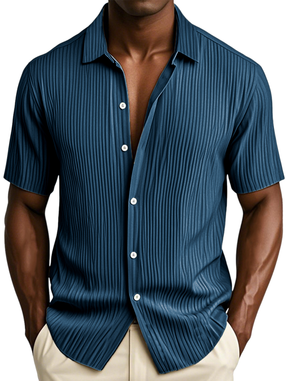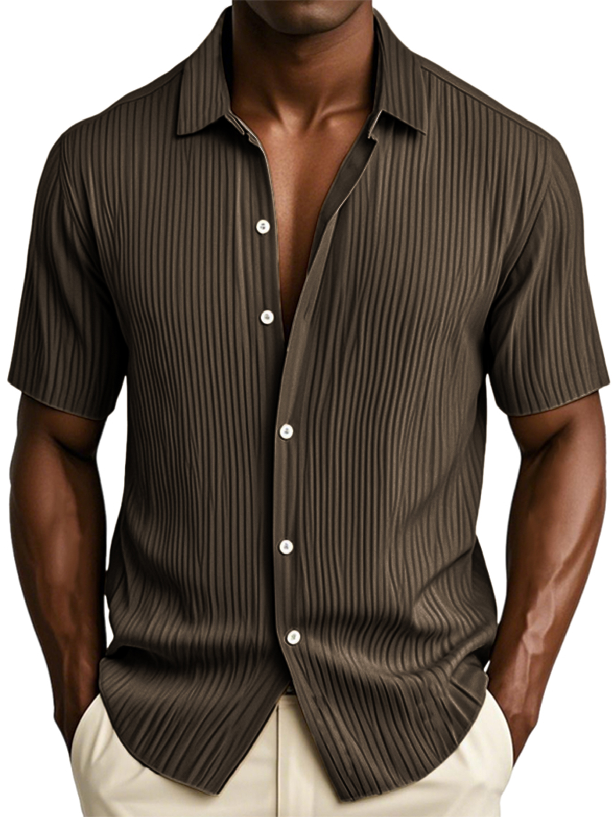 Men's Textured Vertical Striped Ice Silk Ripped Casual Button-down Short-sleeved Shirt