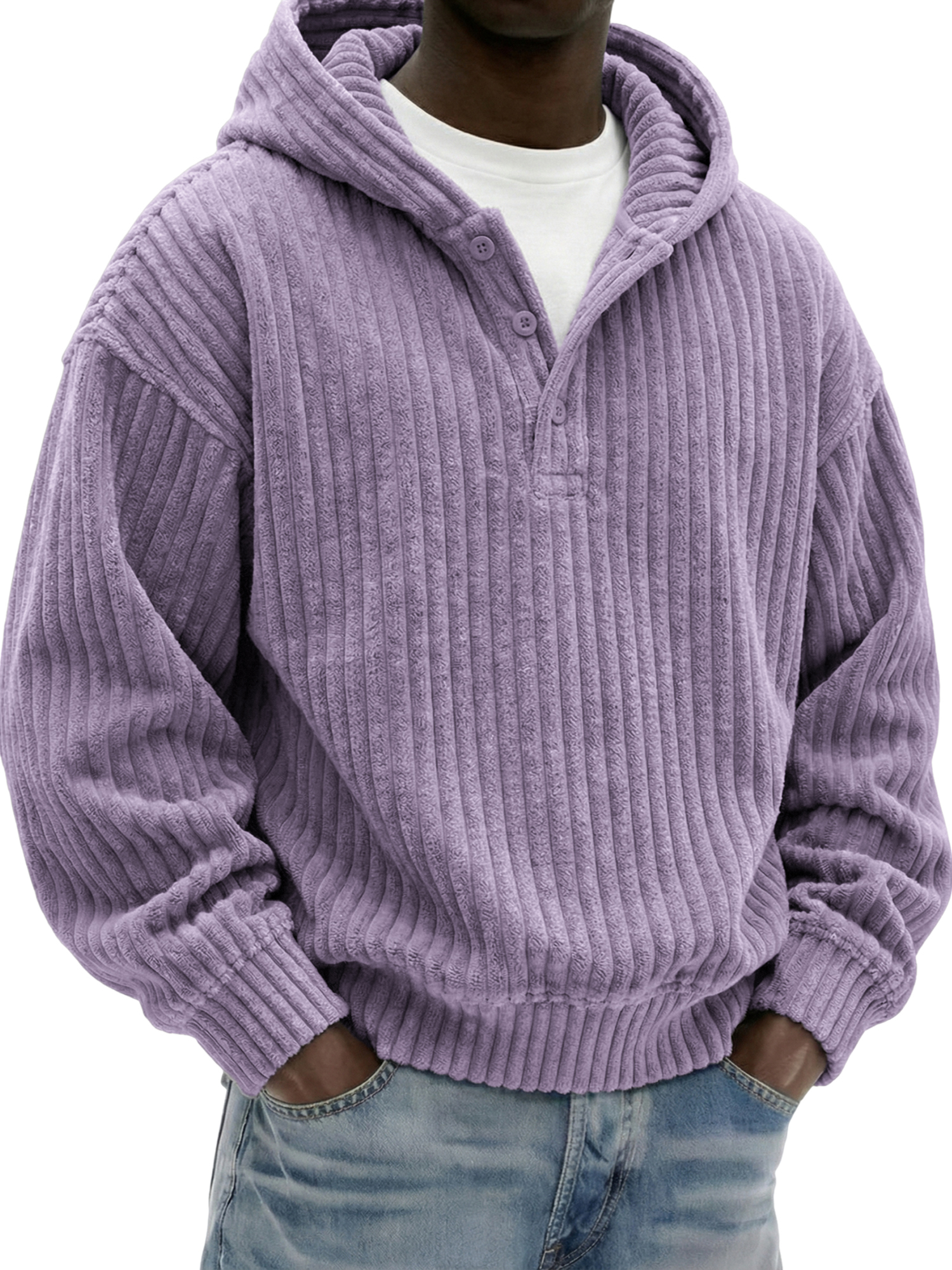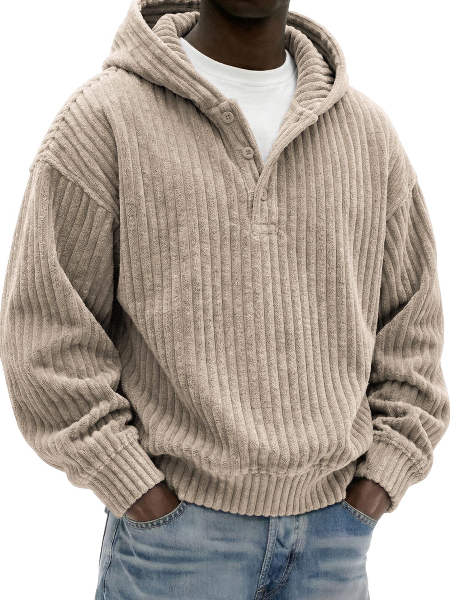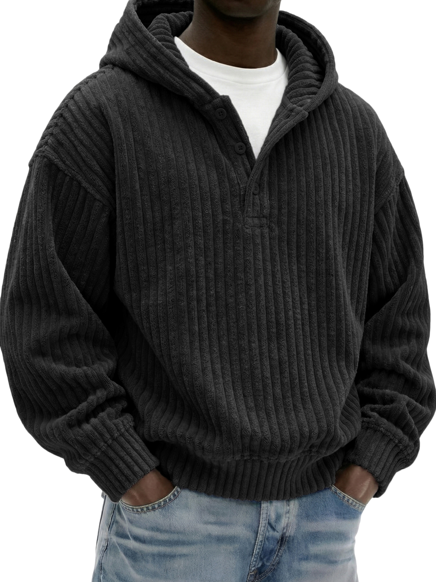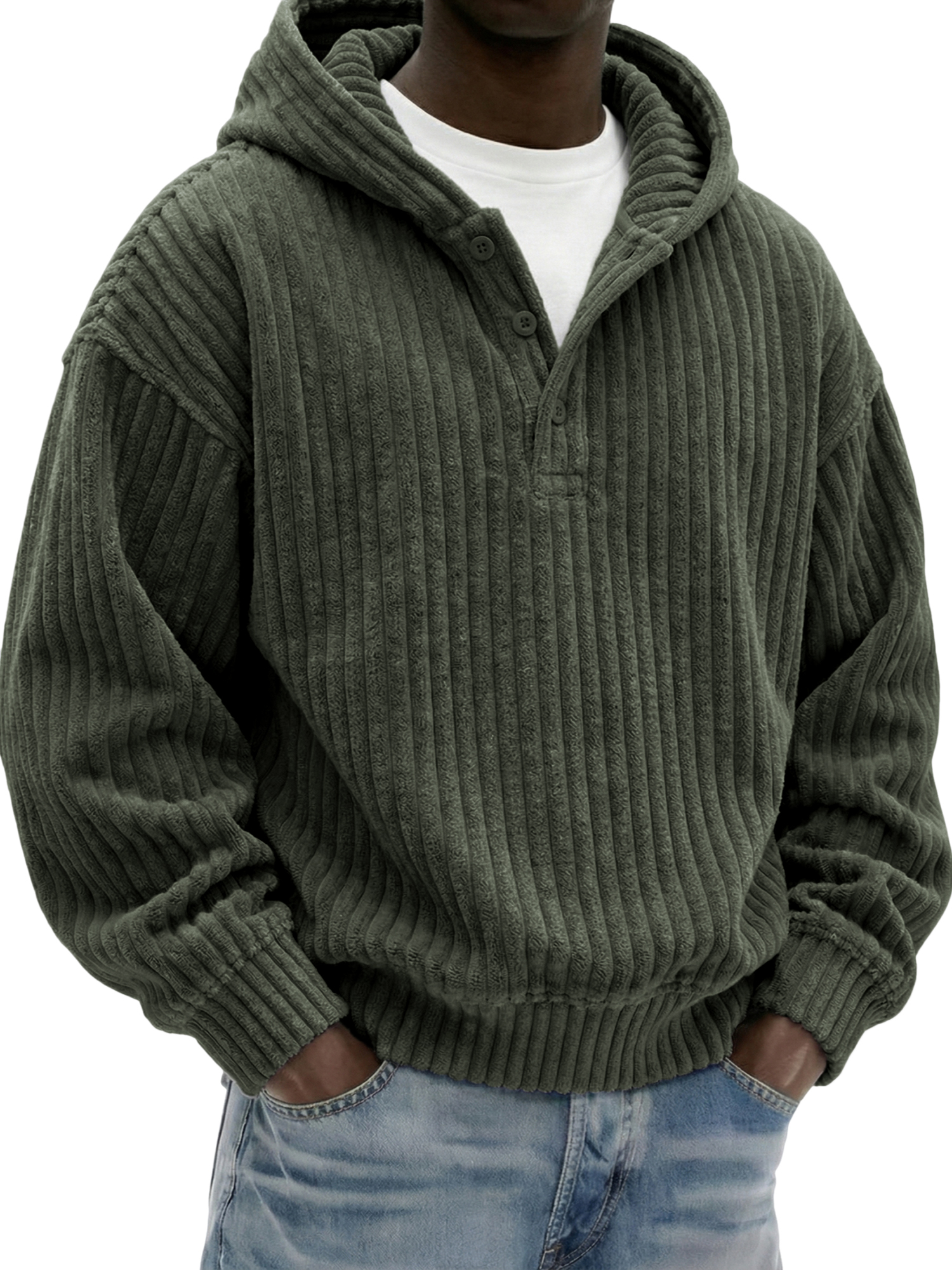 Men's Vintage Corduroy Ribbed Henley Button-down Hoodie Loose-Fit Comfort Pullover