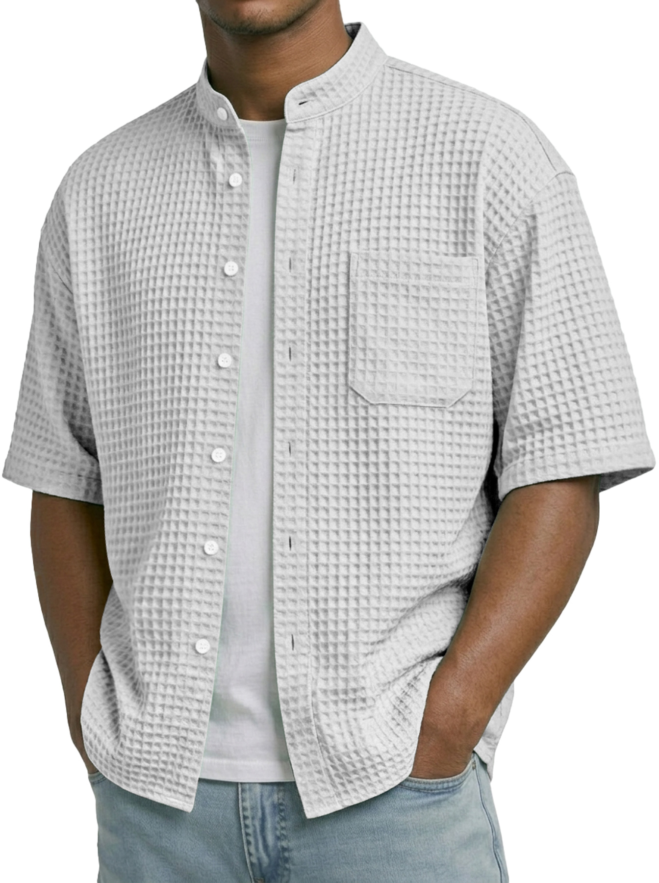 Men's Waffle Collar Stand Collar Pocket Casual Short-Sleeve Shirt
