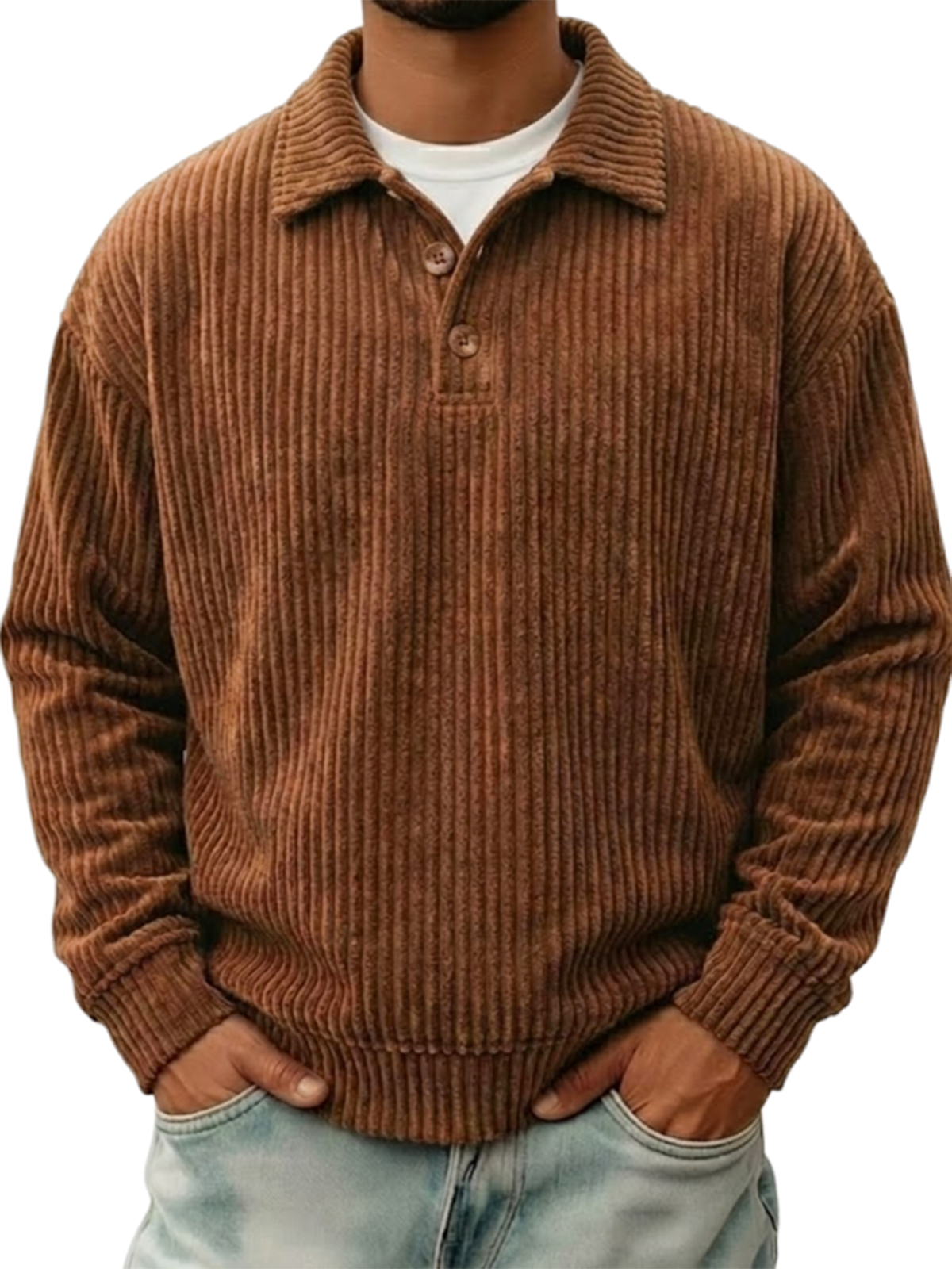 Retro Simple Collar Contrasting Corduroy Button Long-sleeved Polo Shirt$45.99 USD -