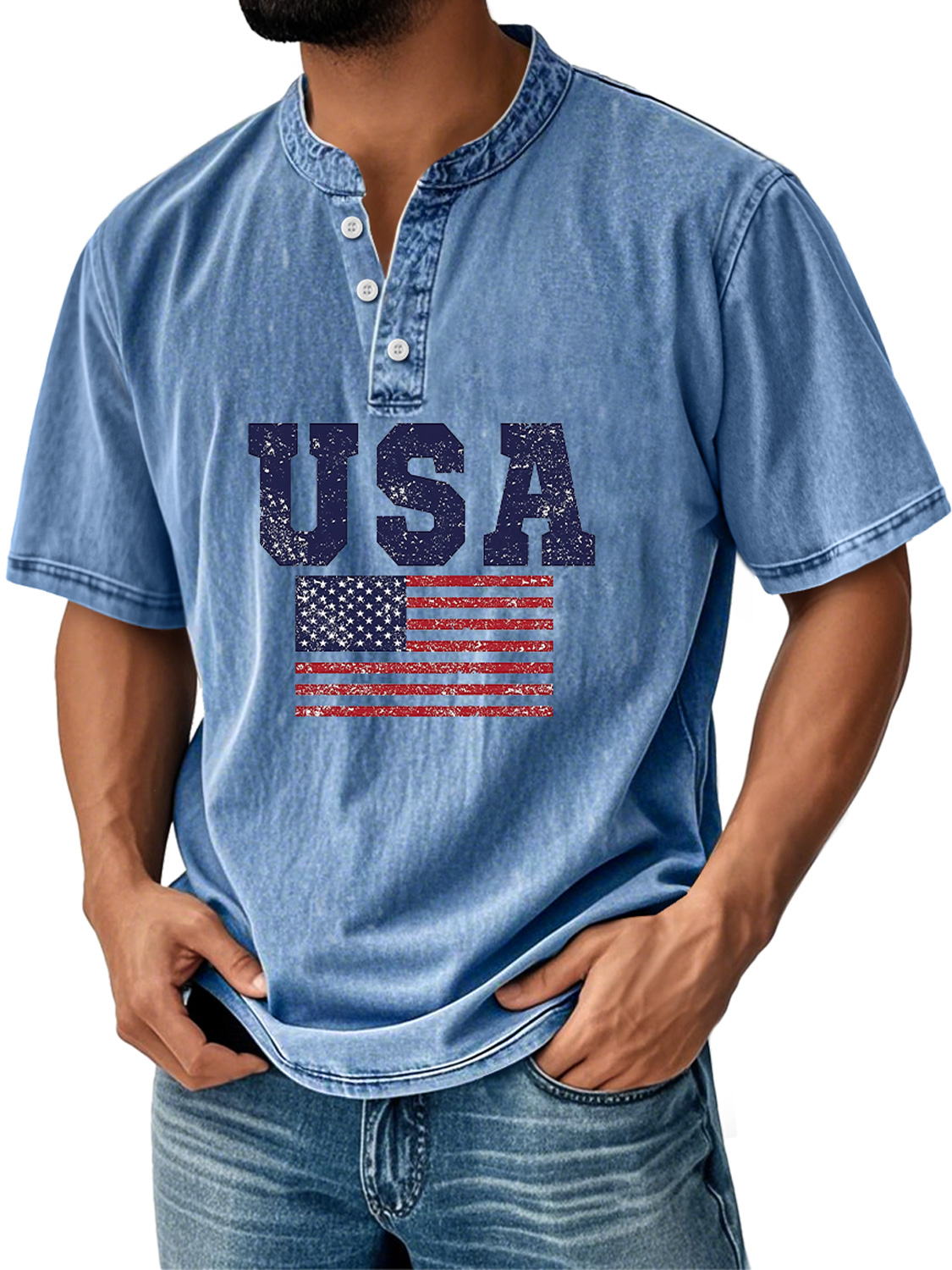 Men's Everyday Independence Day Flag Print Casual Stand Collar Short Sleeve Henley Shirt$39.99 USD -