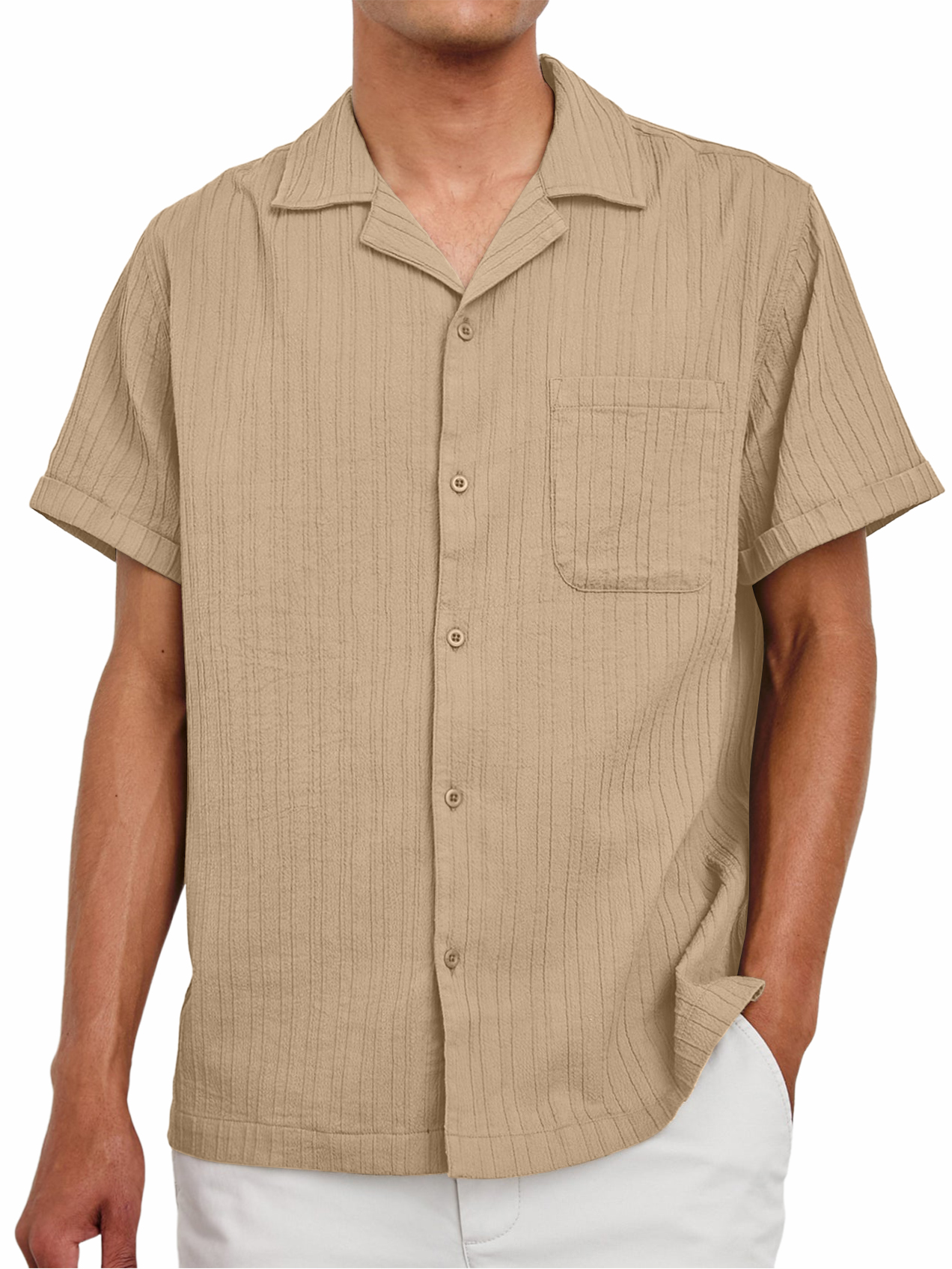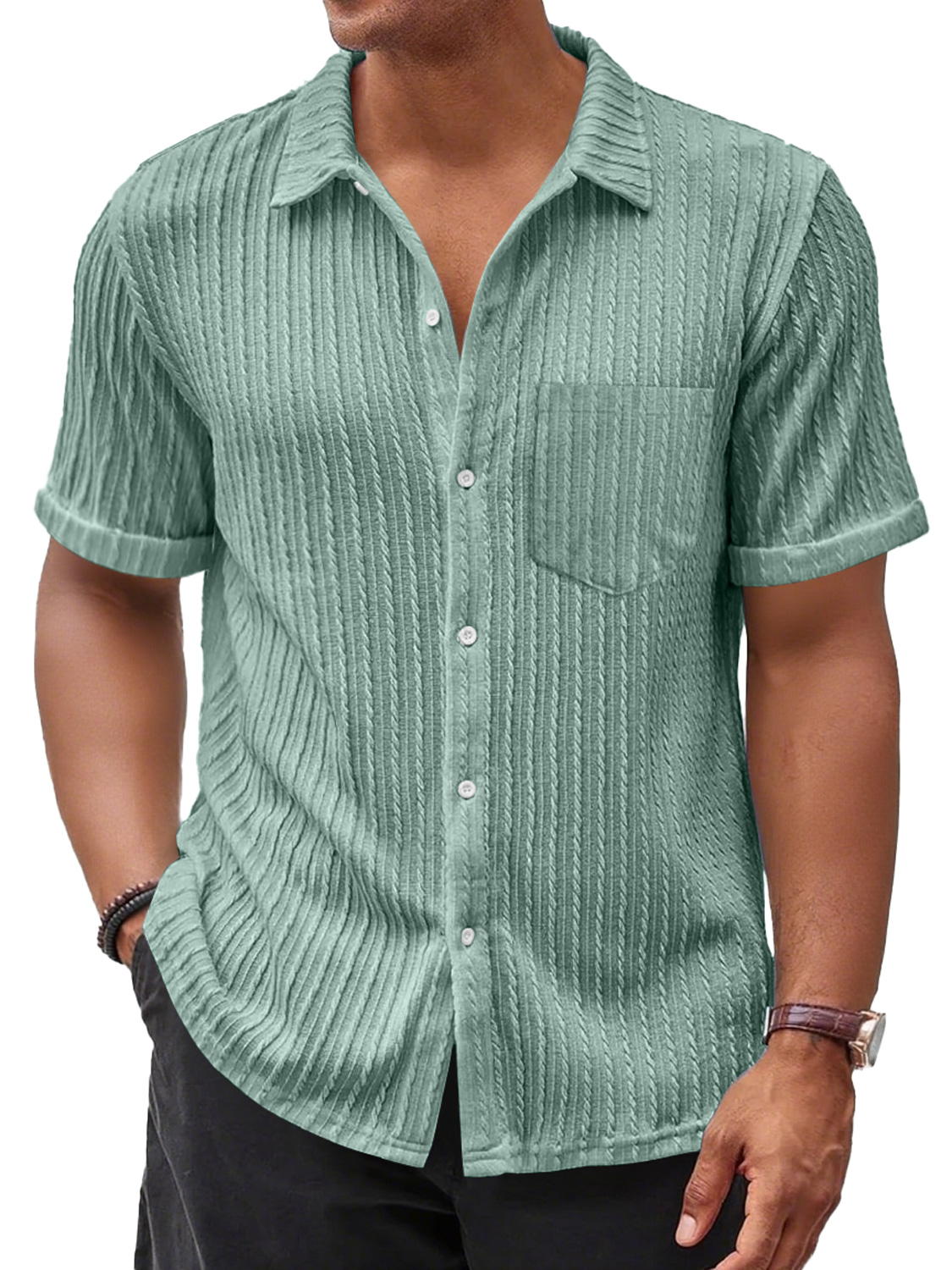 Men's Daily Casual Jacquard Texture Pocket Solid Color Comfortable Short-sleeved Shirt$39.99 USD -