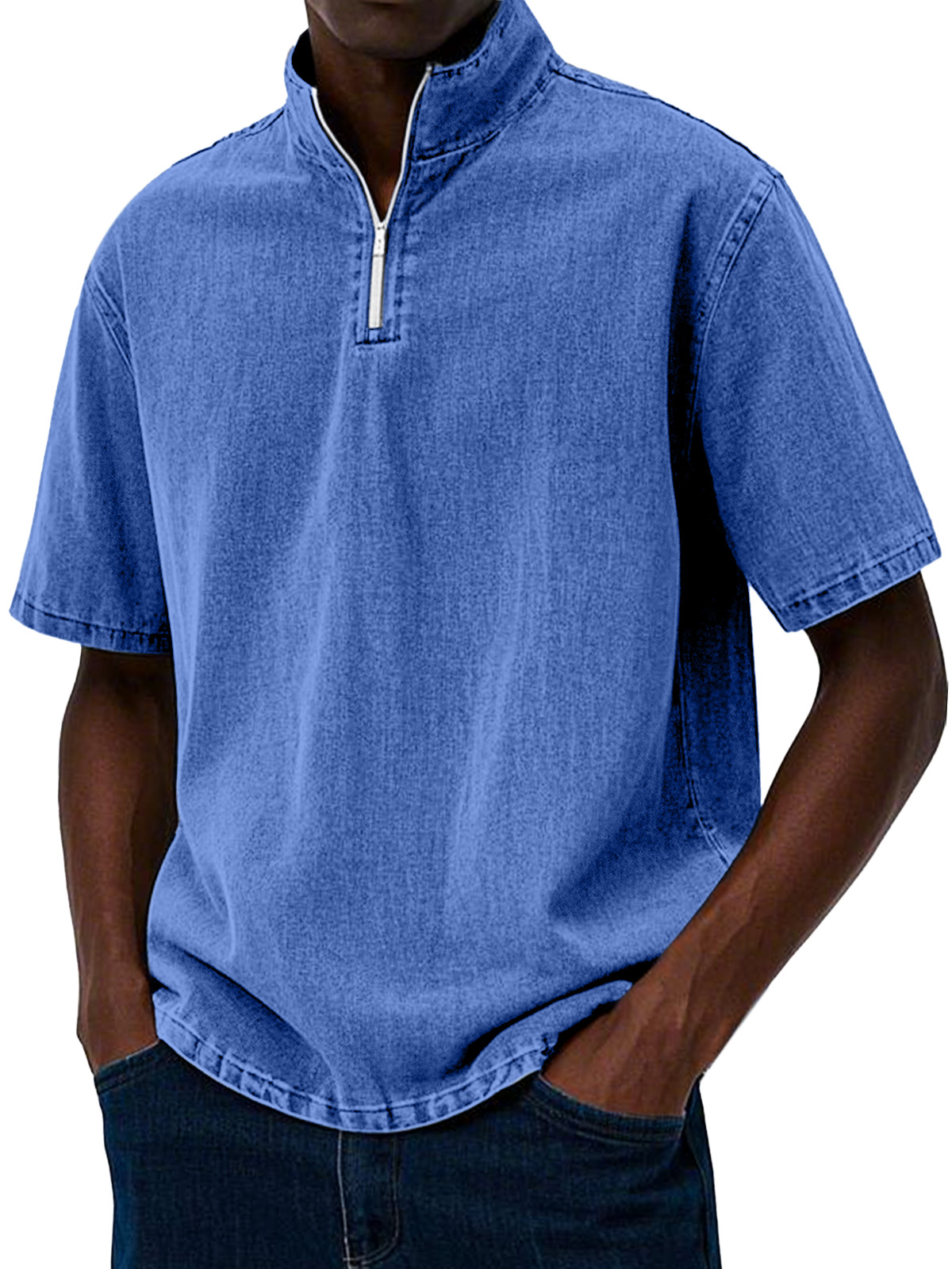Men's Simple Solid Color Retro Stand Collar Zipper Short-sleeved Polo Shirt$39.99 USD -