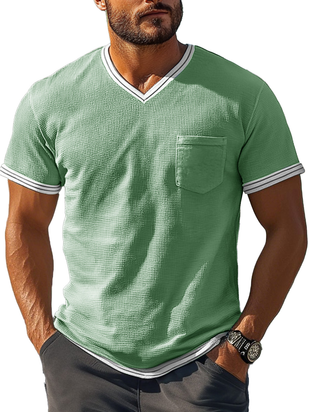 Men's Fashion Retro Patchwork Textured Fabric V-neck Short-sleeved T-shirt$39.99 USD -