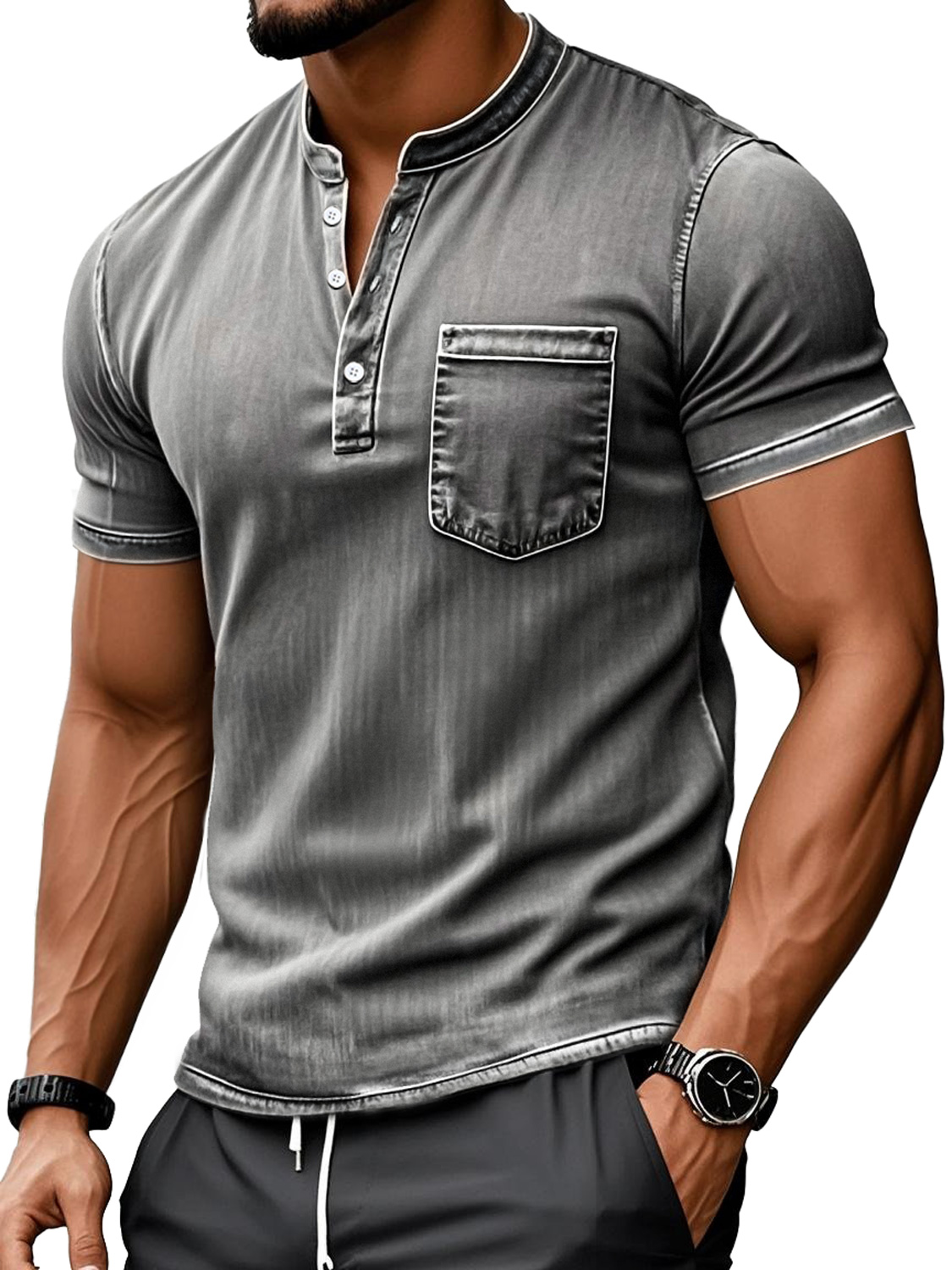 Men's Retro Everyday Stand Collar Pocket Casual Short Sleeve Henley Shirt$39.99 USD -