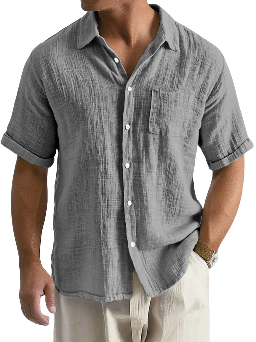 Men's Casual Textured Lapel Solid Color Short-sleeved Shirt$39.99 USD -
