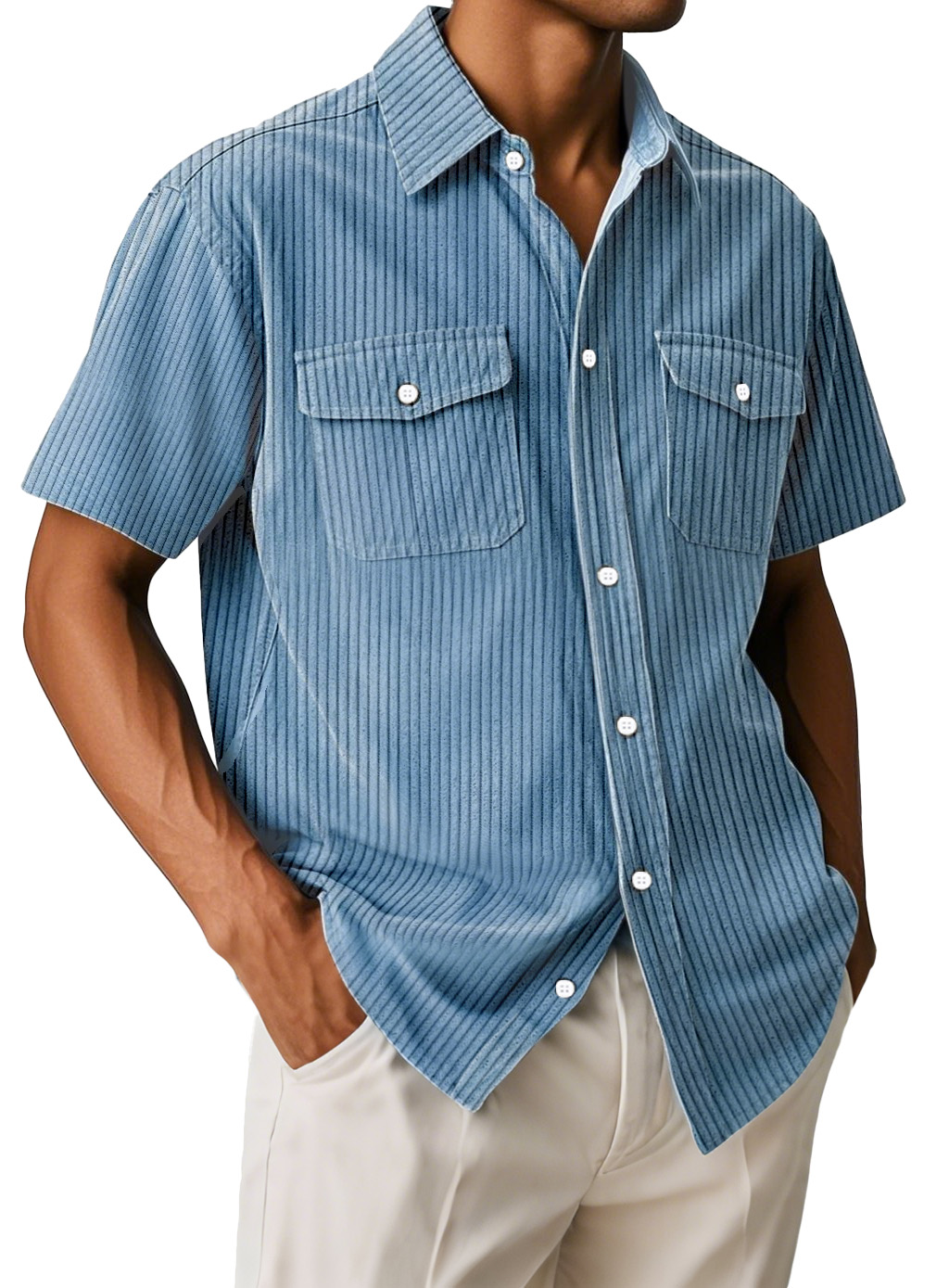 Men's Simple Vertical Pit Strip Solid Color Retro Double Pocket Short-sleeved Shirt$39.99 USD -