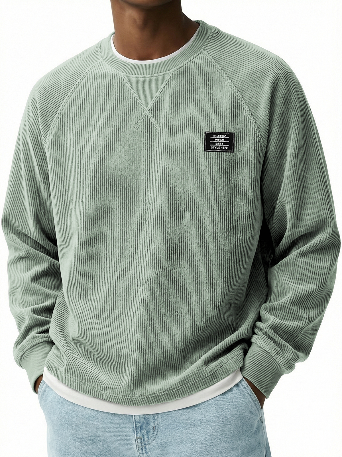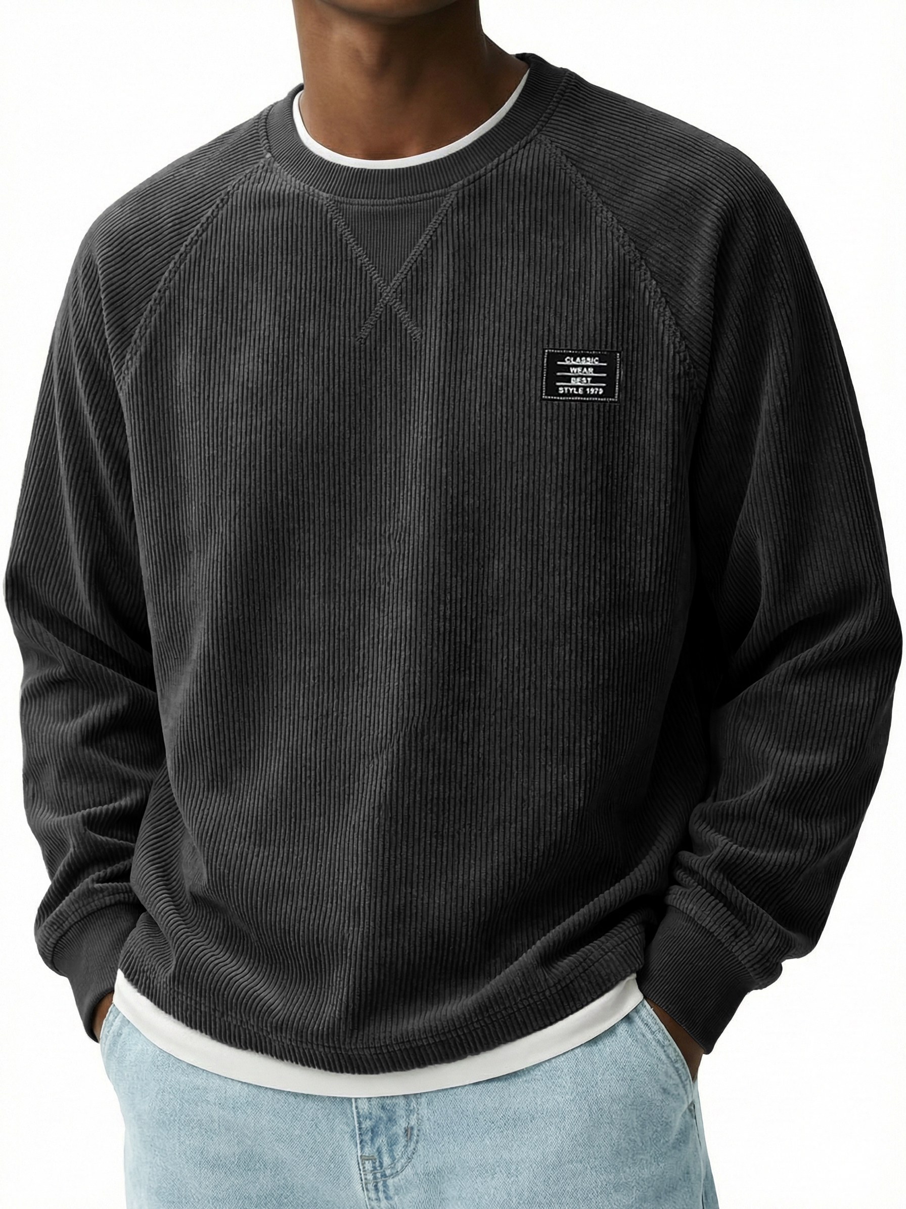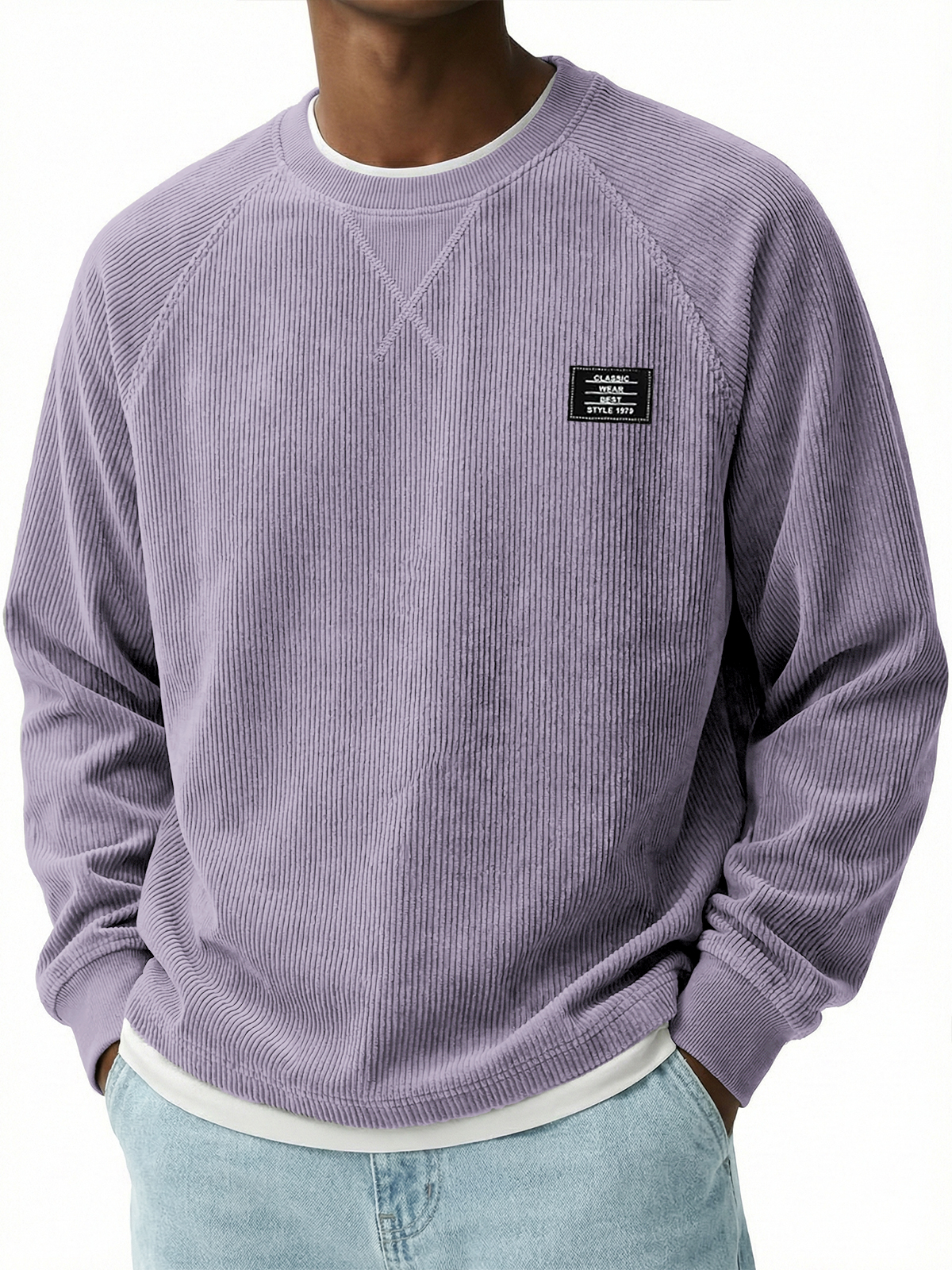 Corduroy Raglan Crew Neck Pullover Top with Stitched Embroidery Design