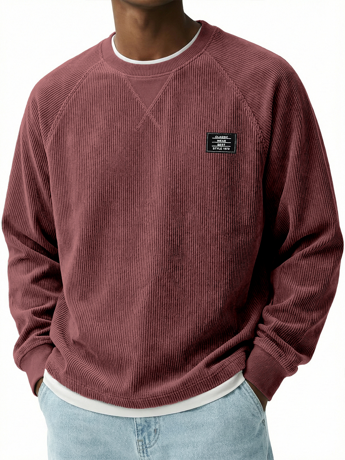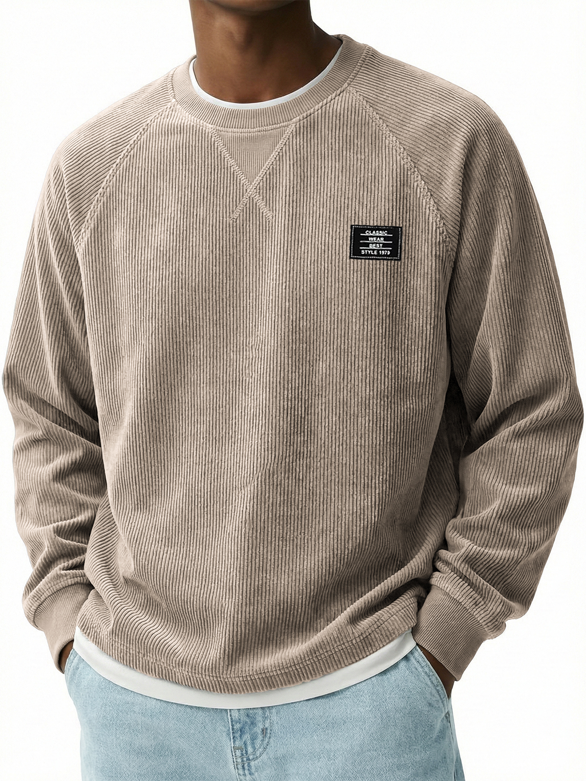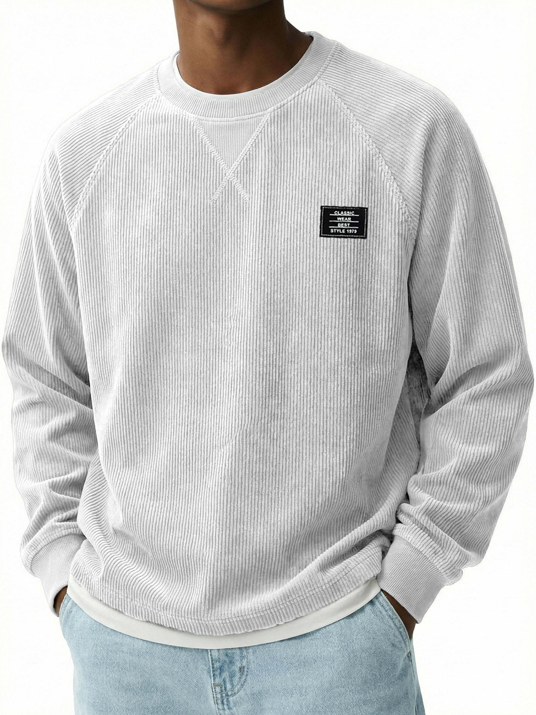 Corduroy Raglan Crew Neck Pullover Top with Stitched Embroidery Design