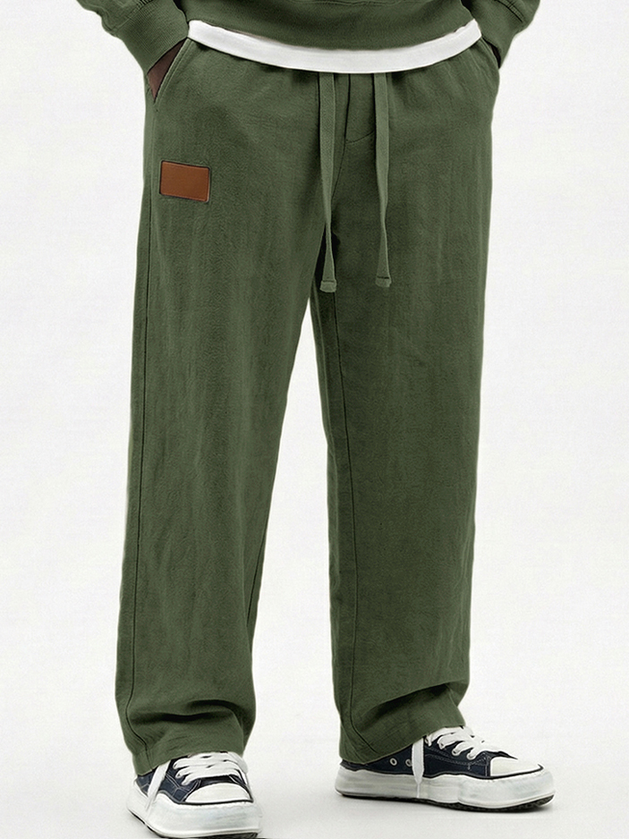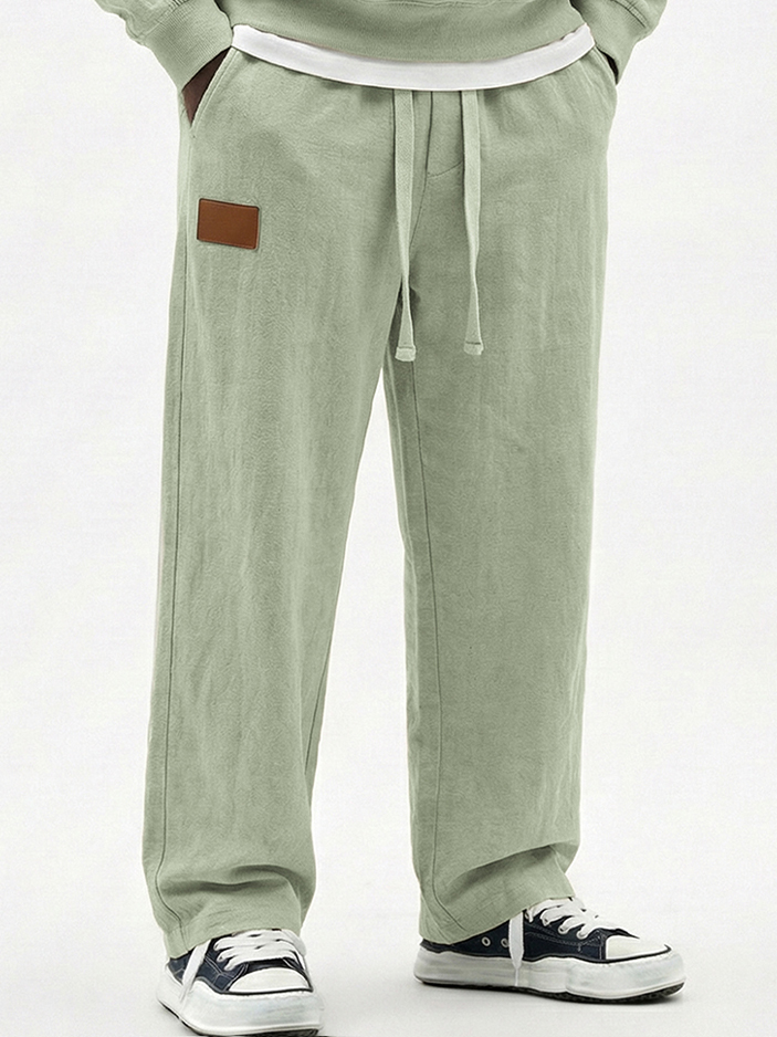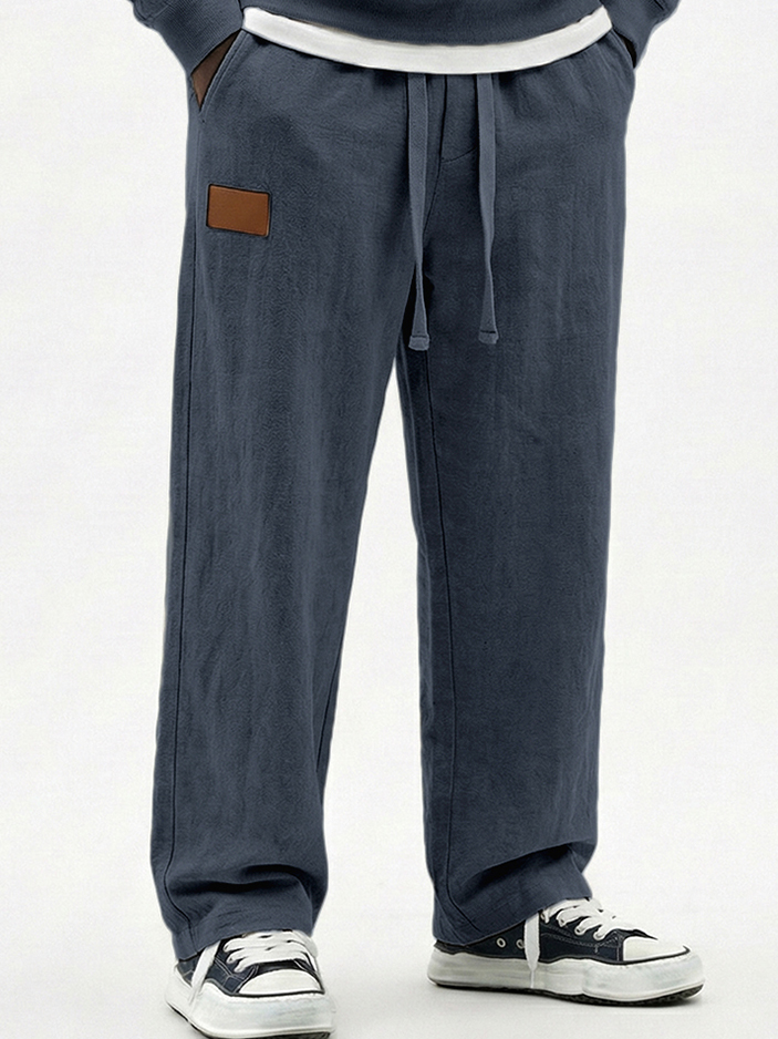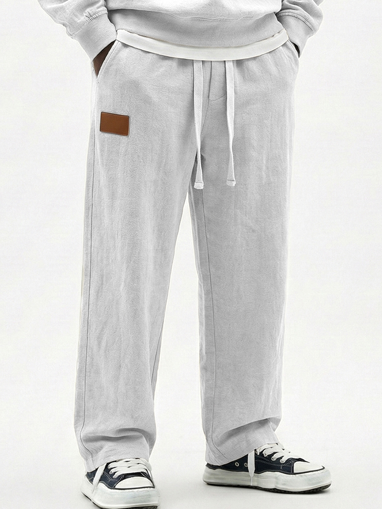 Men's Breathable Cotton-linen Textured Pants with Leather Embroidery Patchwork