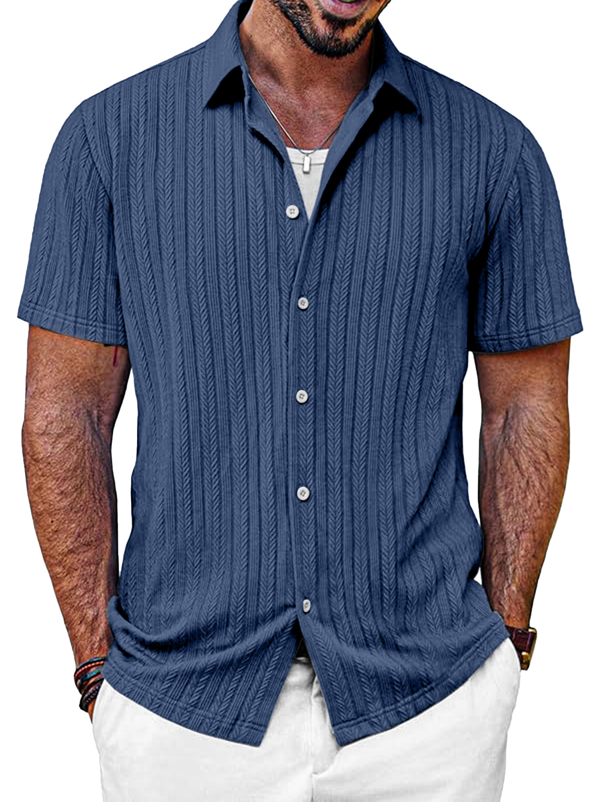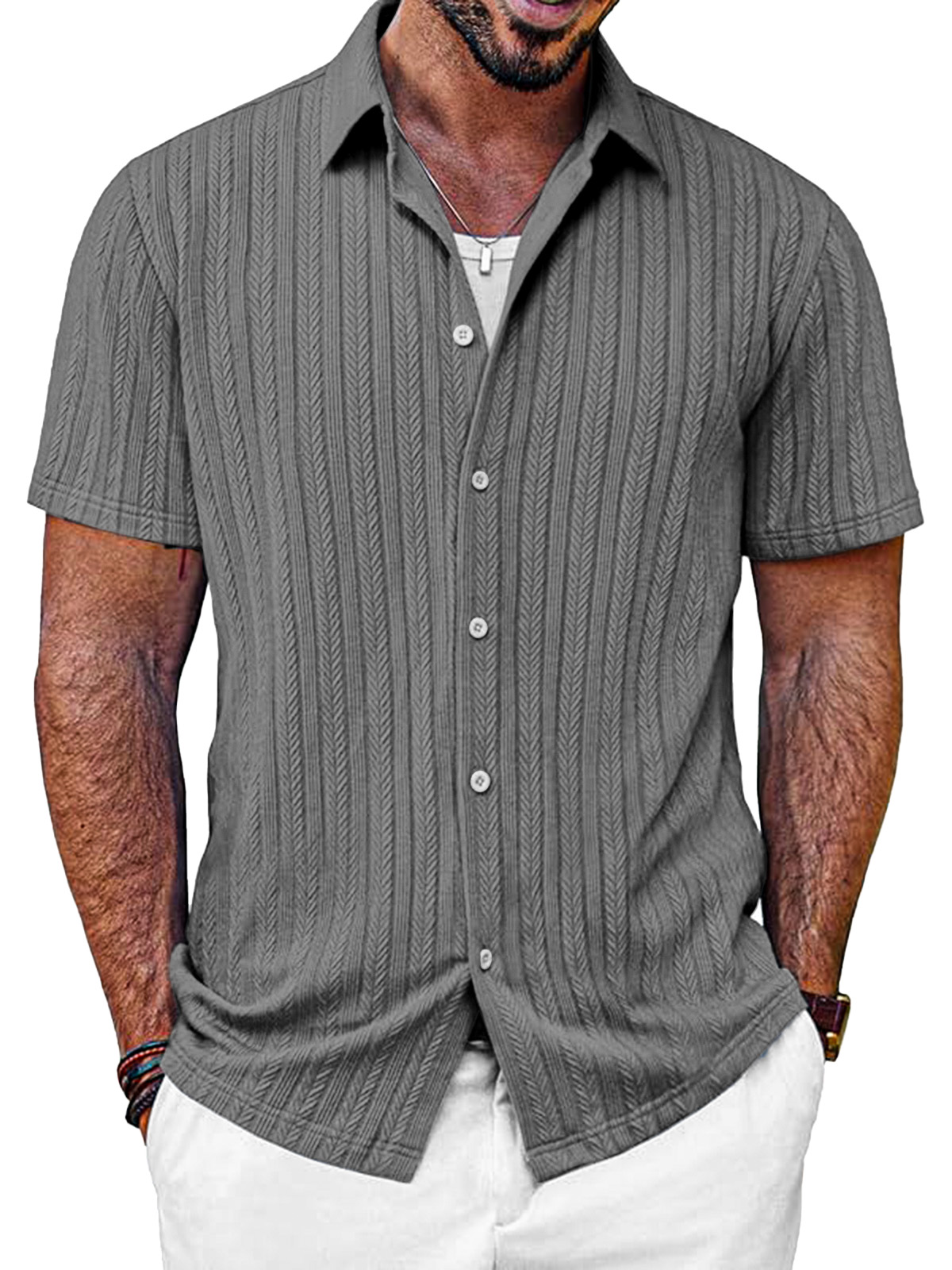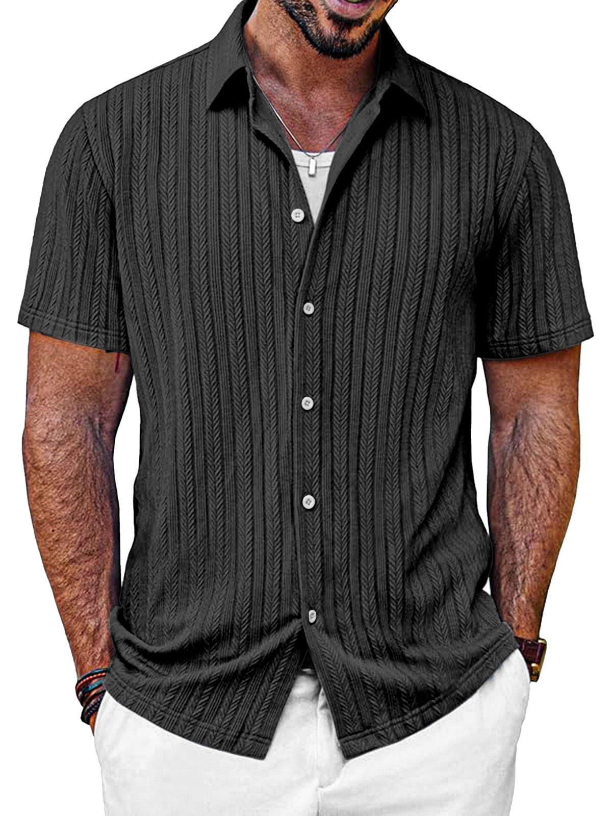 Men's Casual Solid Color Textured Short-sleeved Button-down Shirt