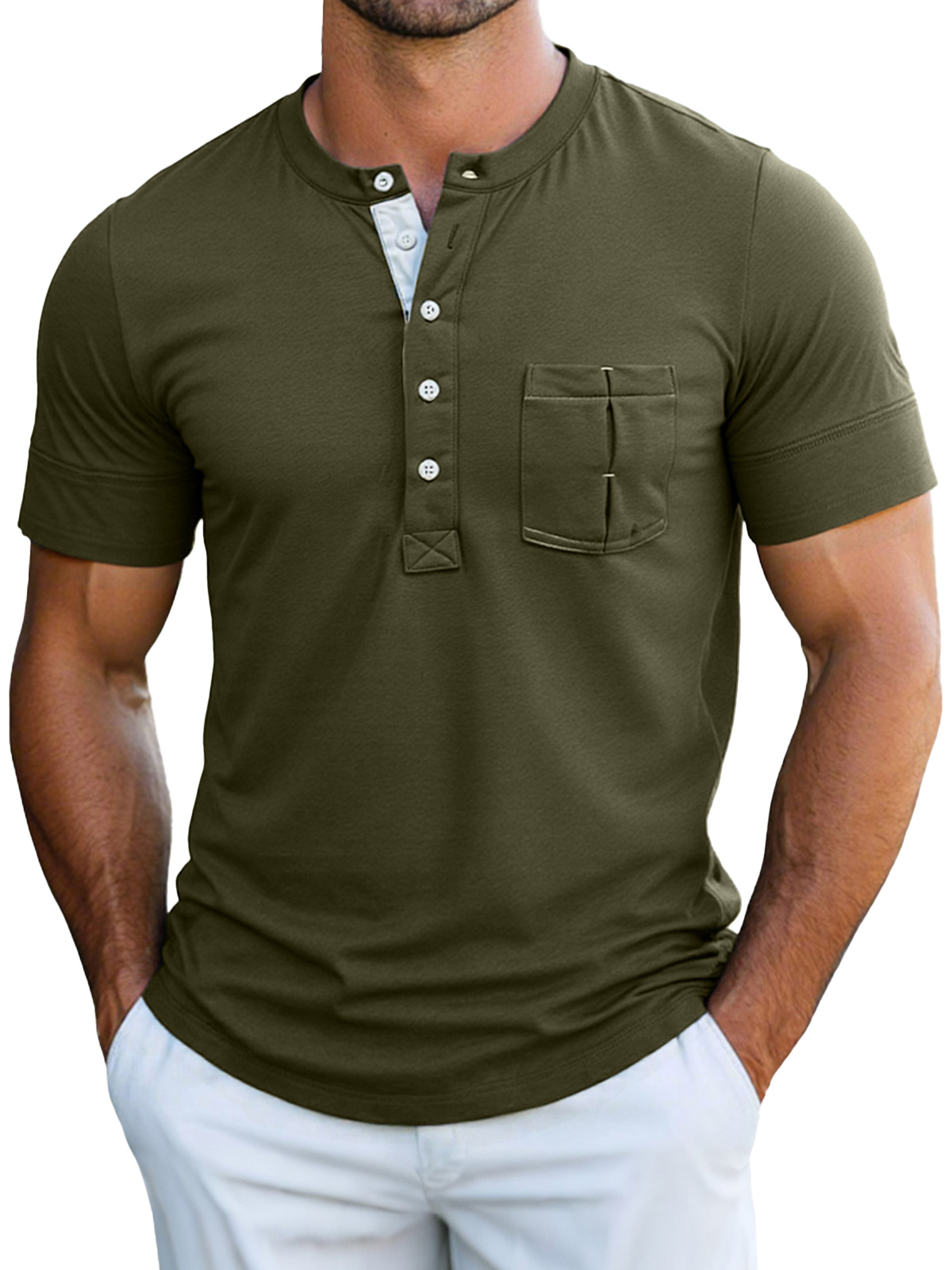 Men's Casual Stand Collar Pocket Solid Color Short Sleeve Henley Shirt