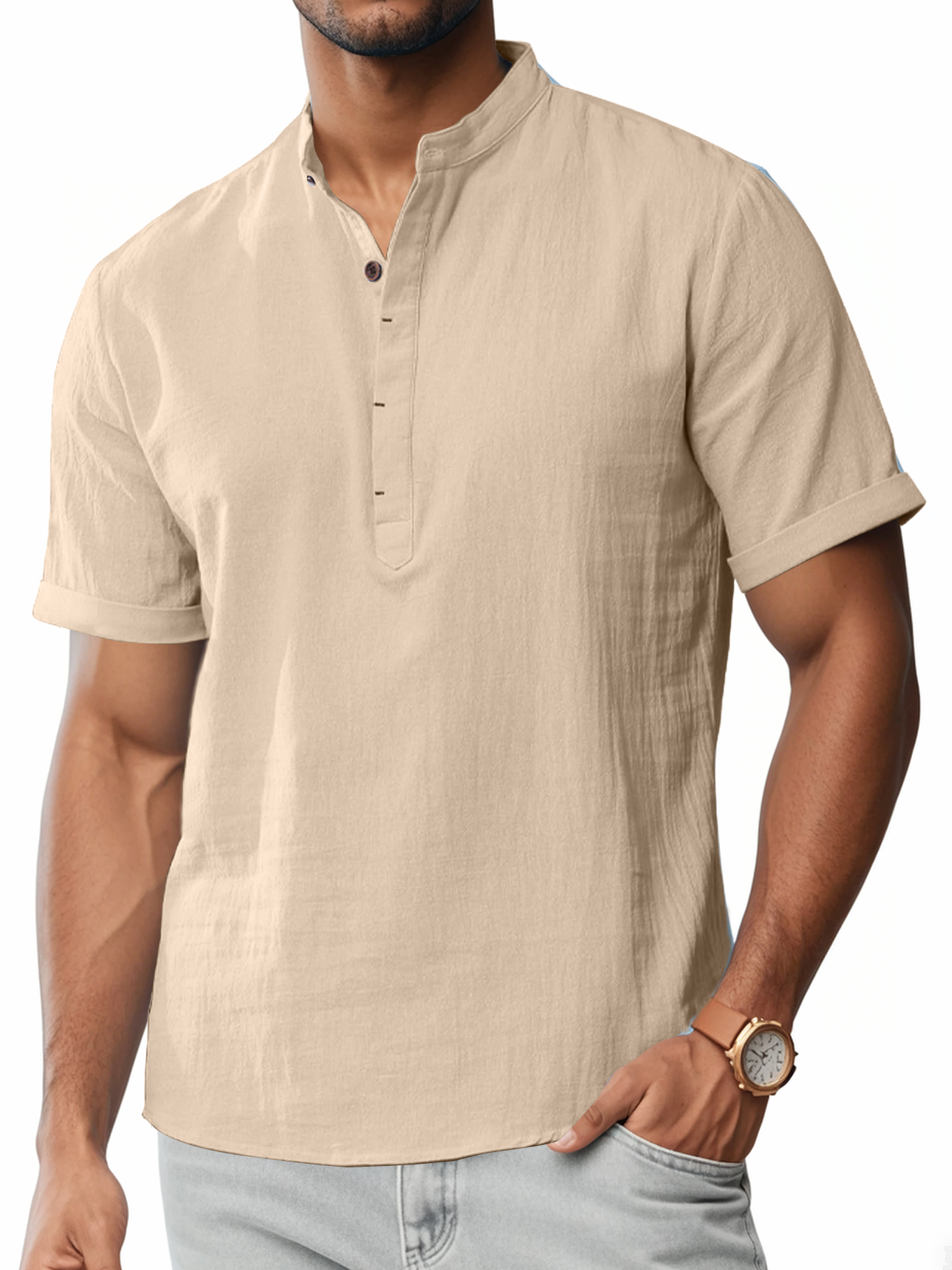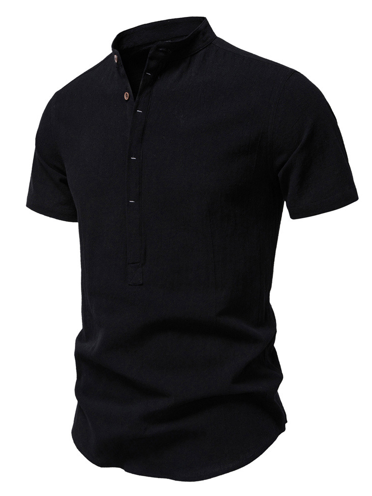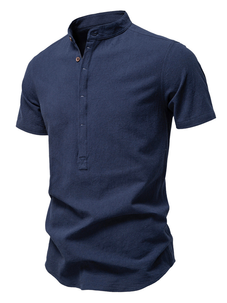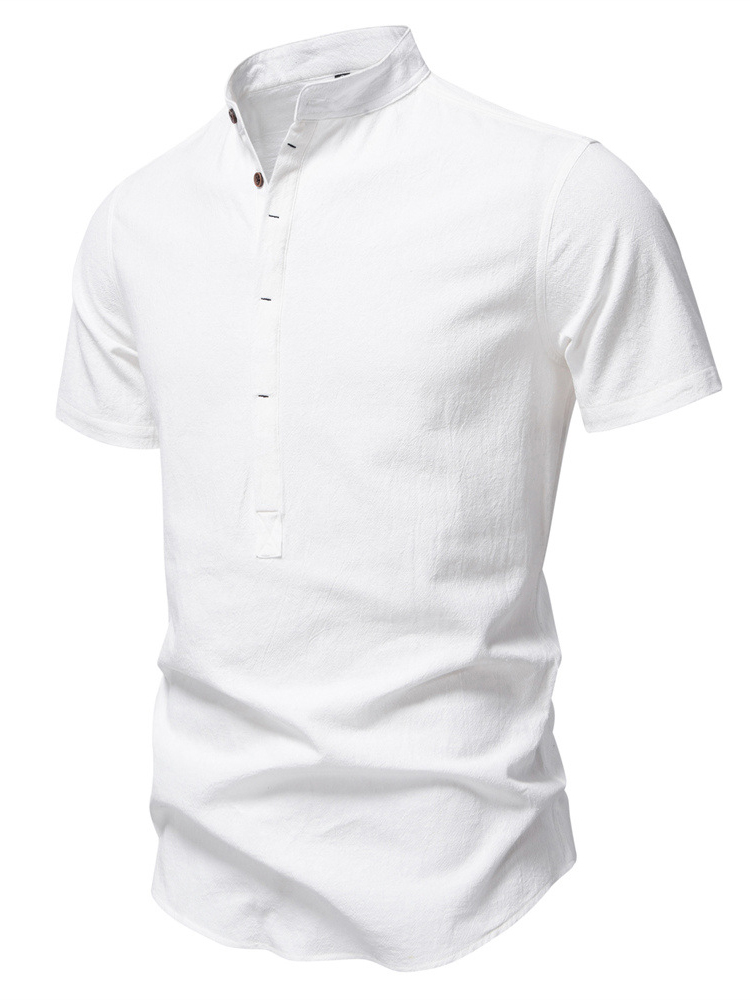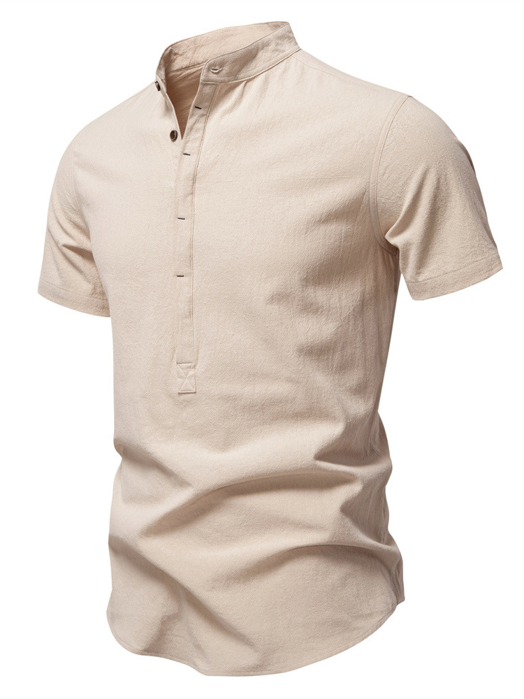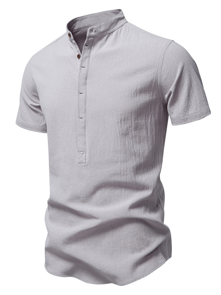Men's Cotton And Linen Stand-up Collar Quality Short-sleeved Shirt