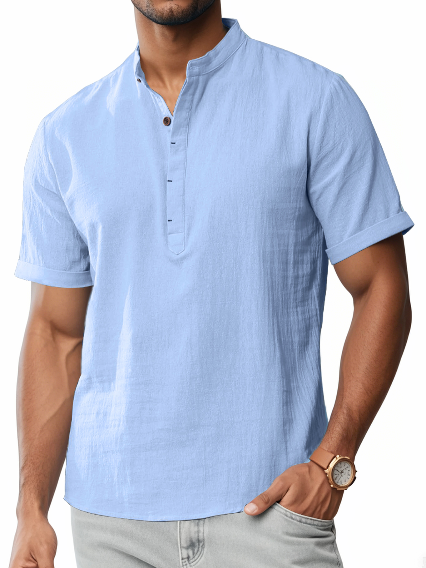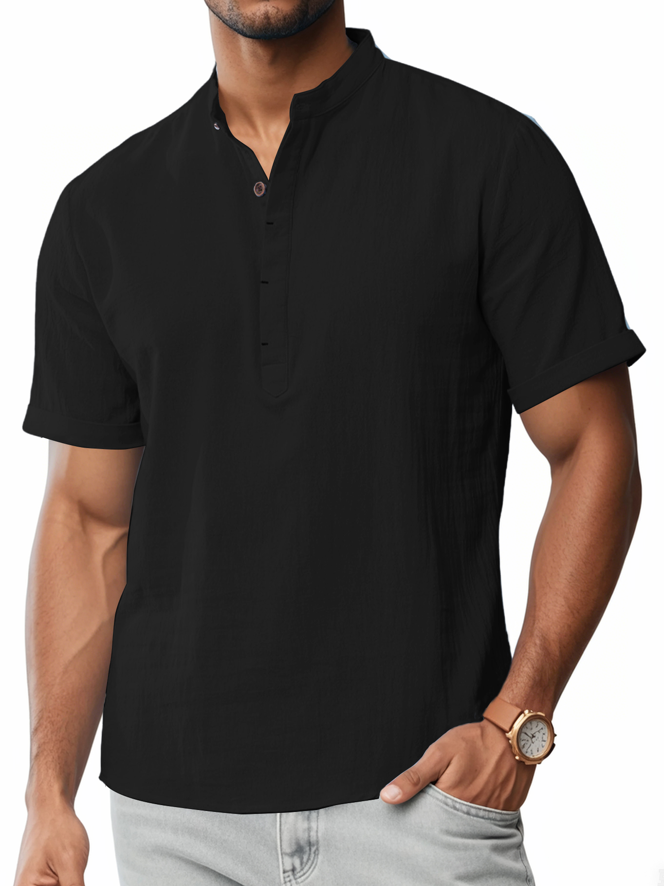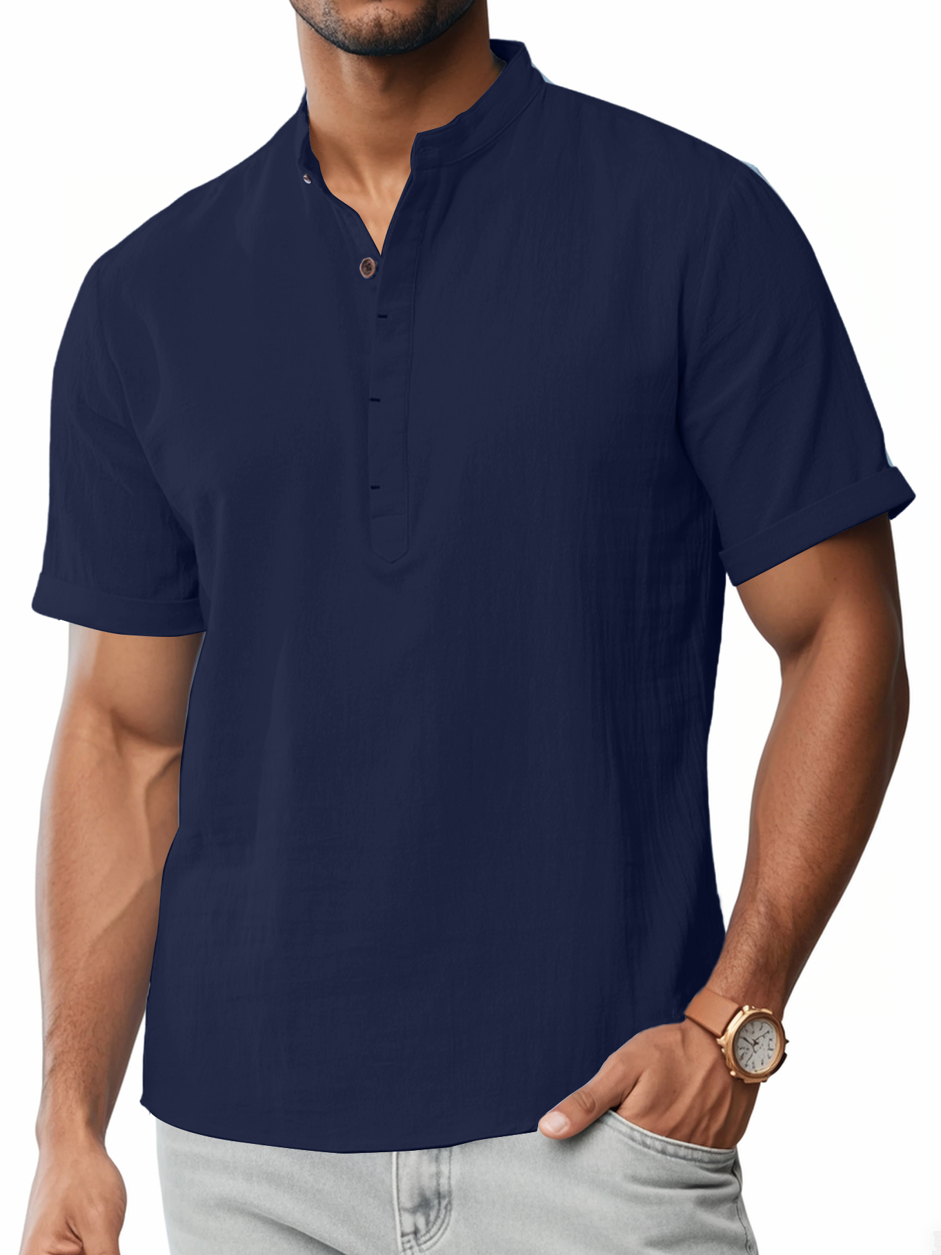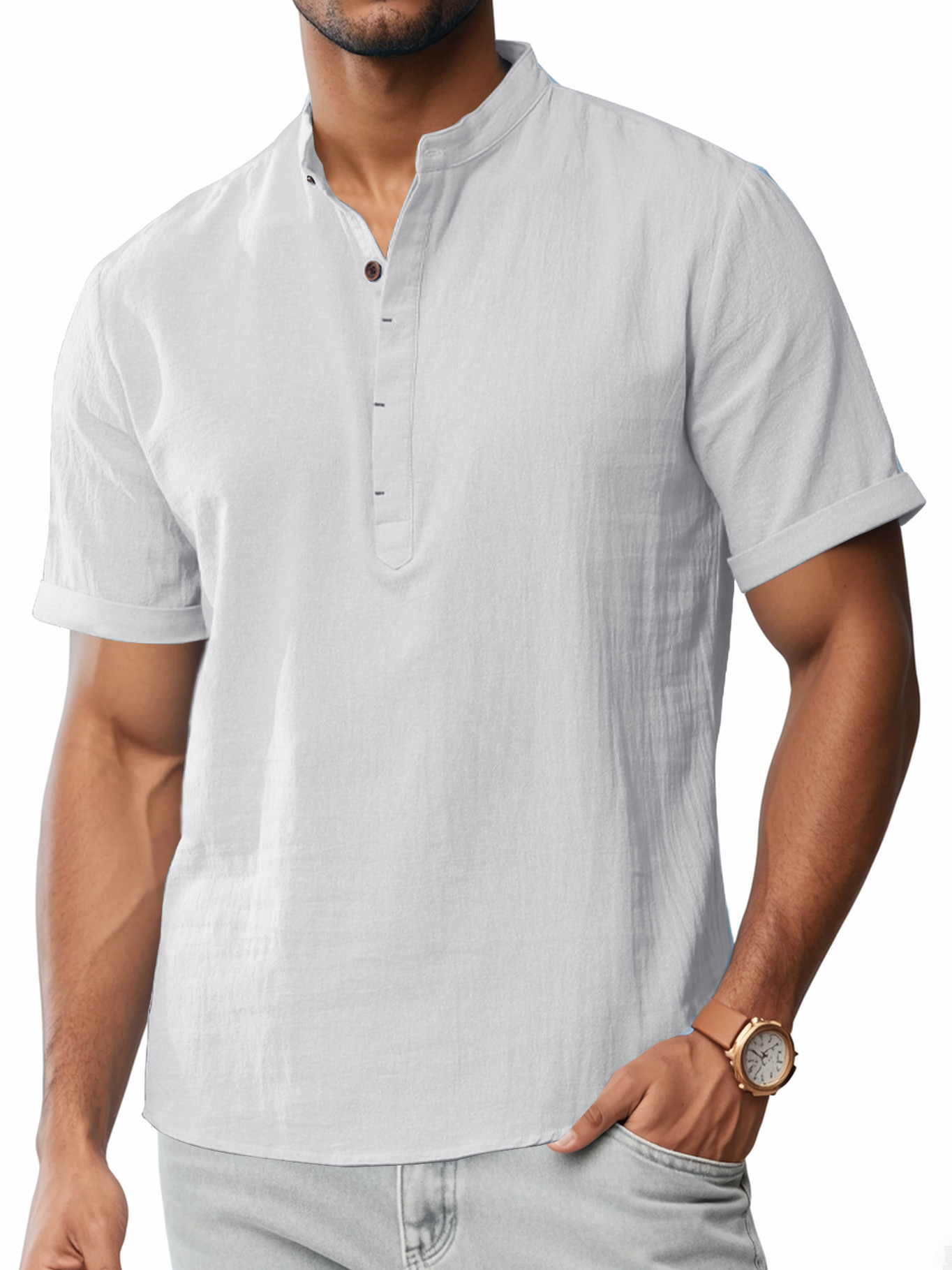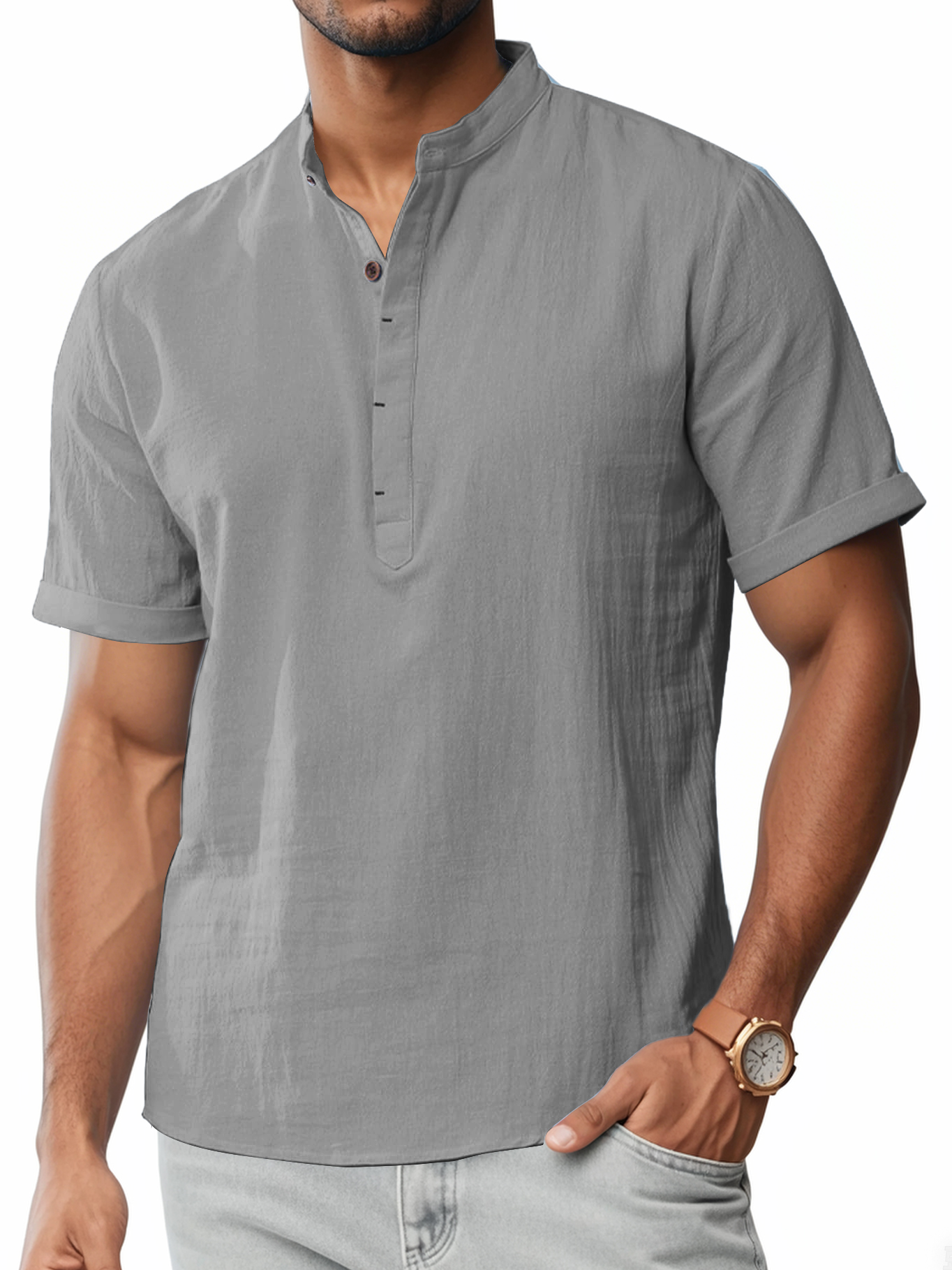 Men's Cotton And Linen Stand-up Collar Quality Short-sleeved Shirt