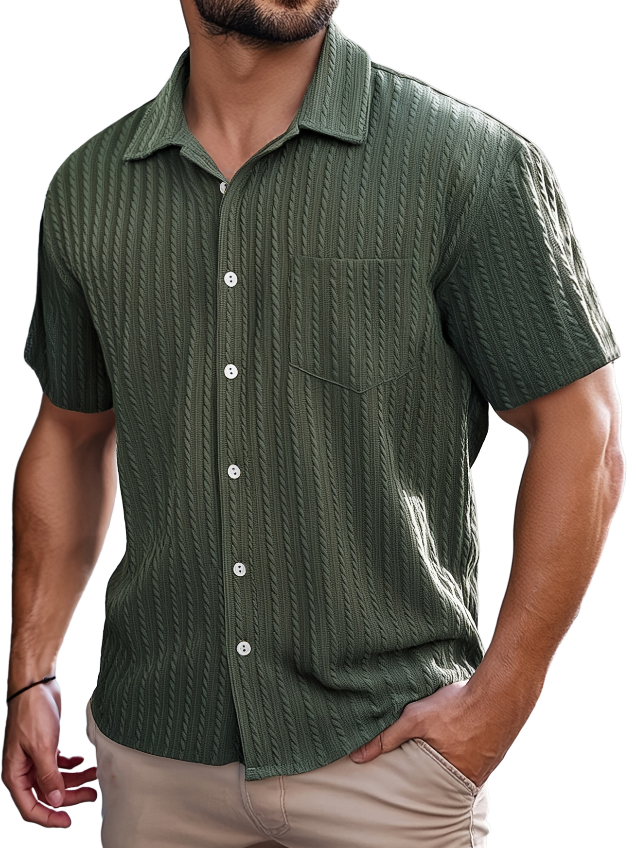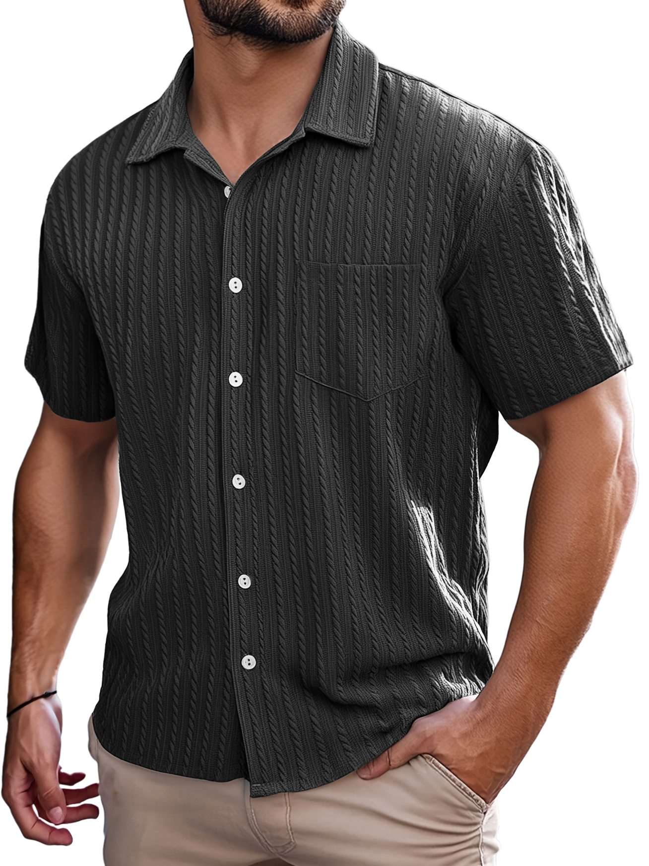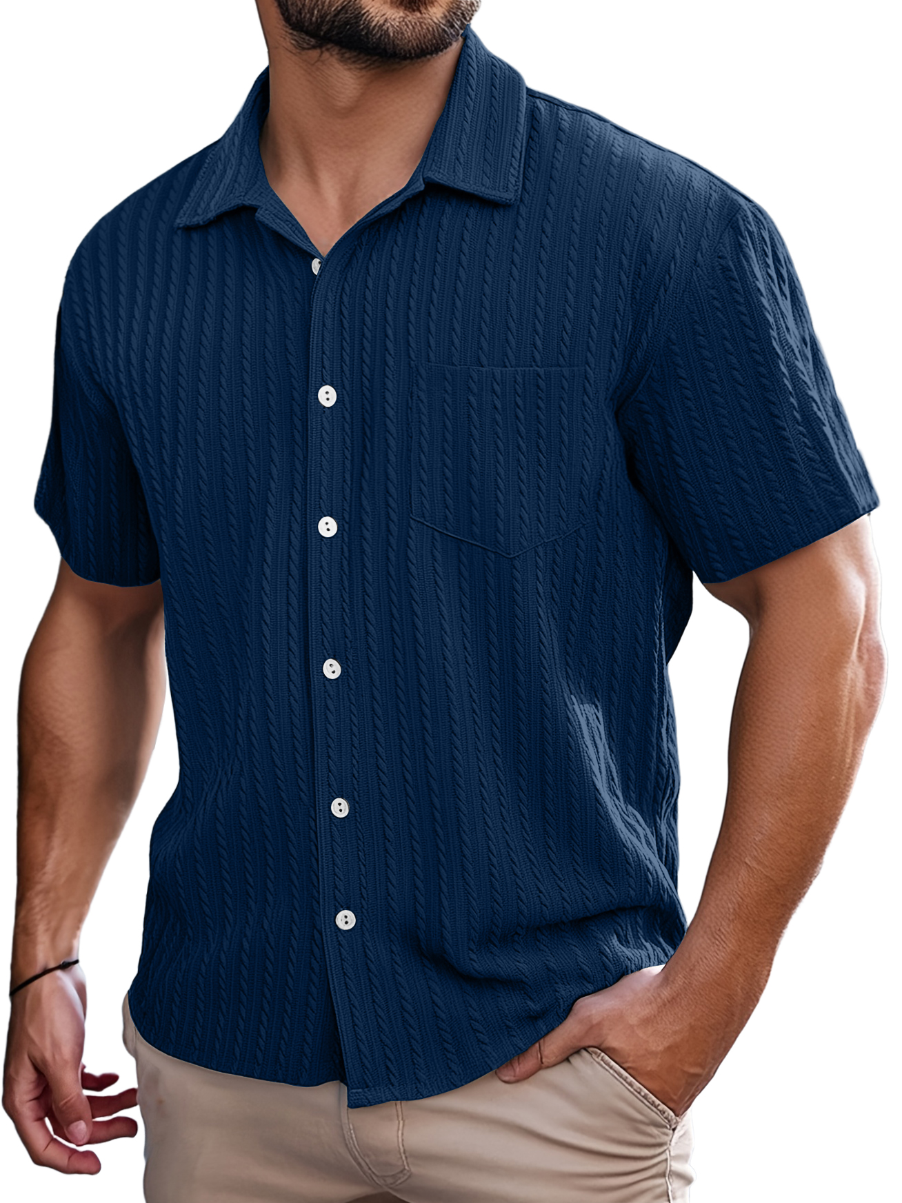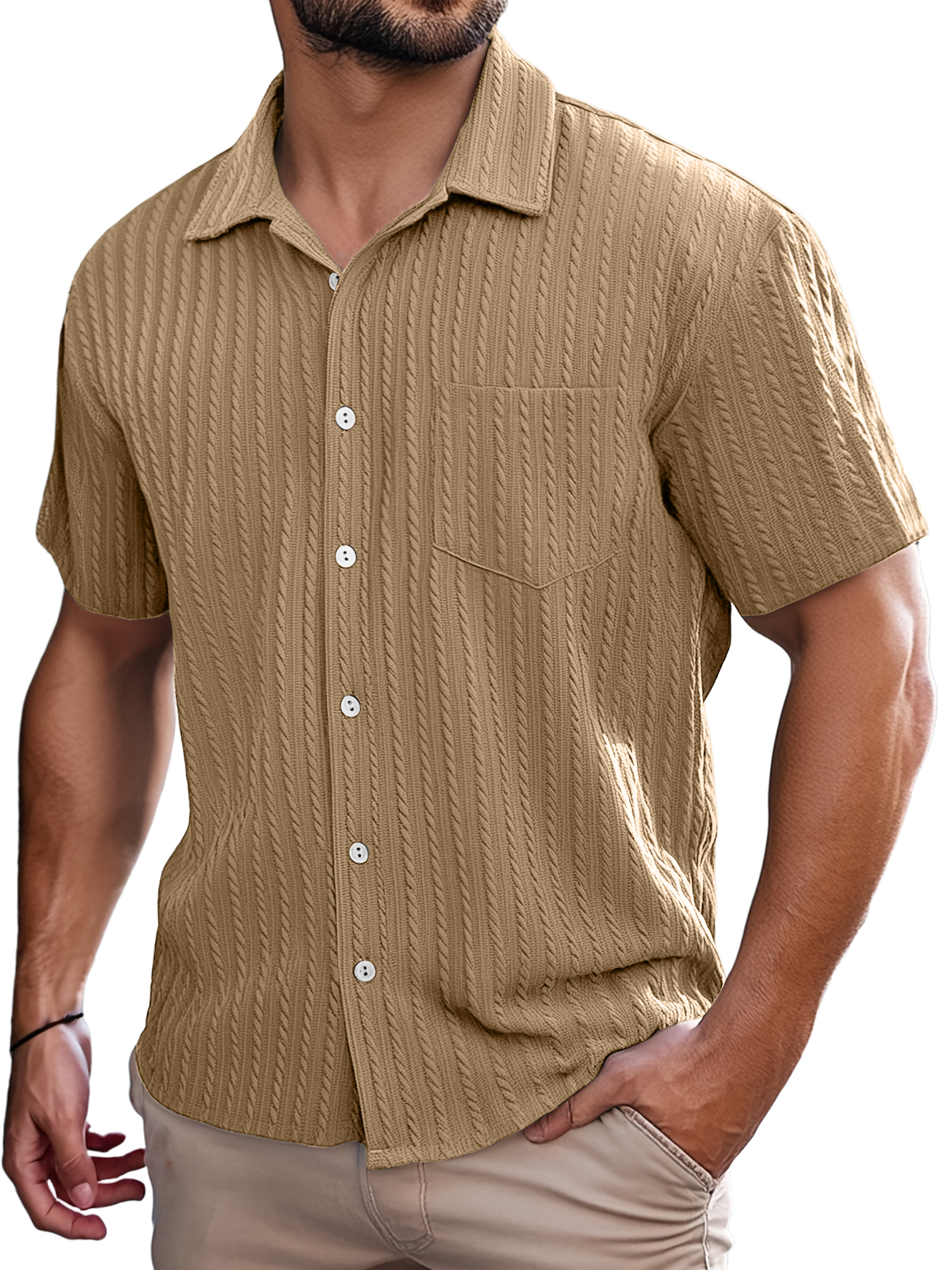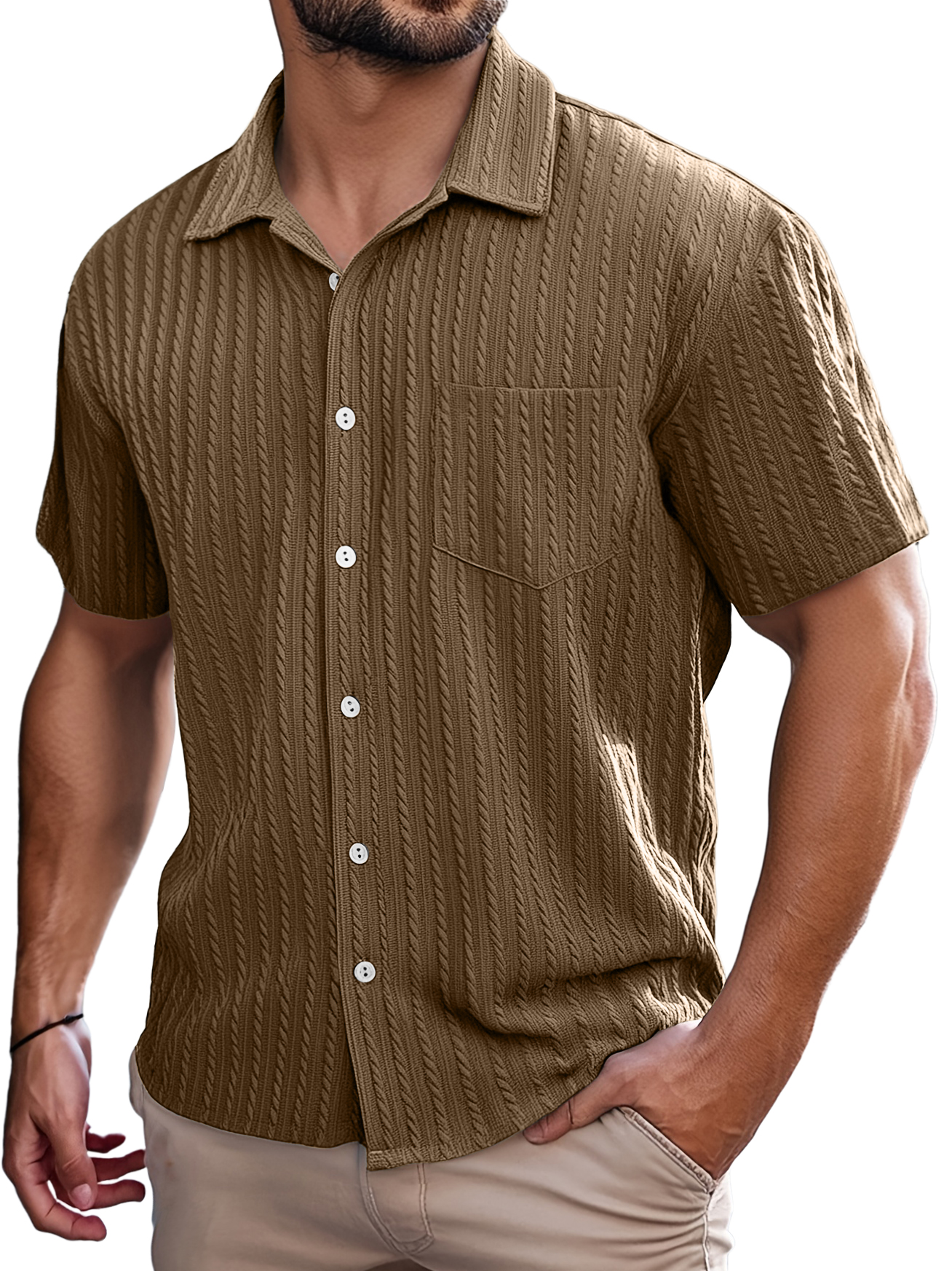 Men's Retro Casual Striped Jacquard Pocket Short-sleeved Shirt