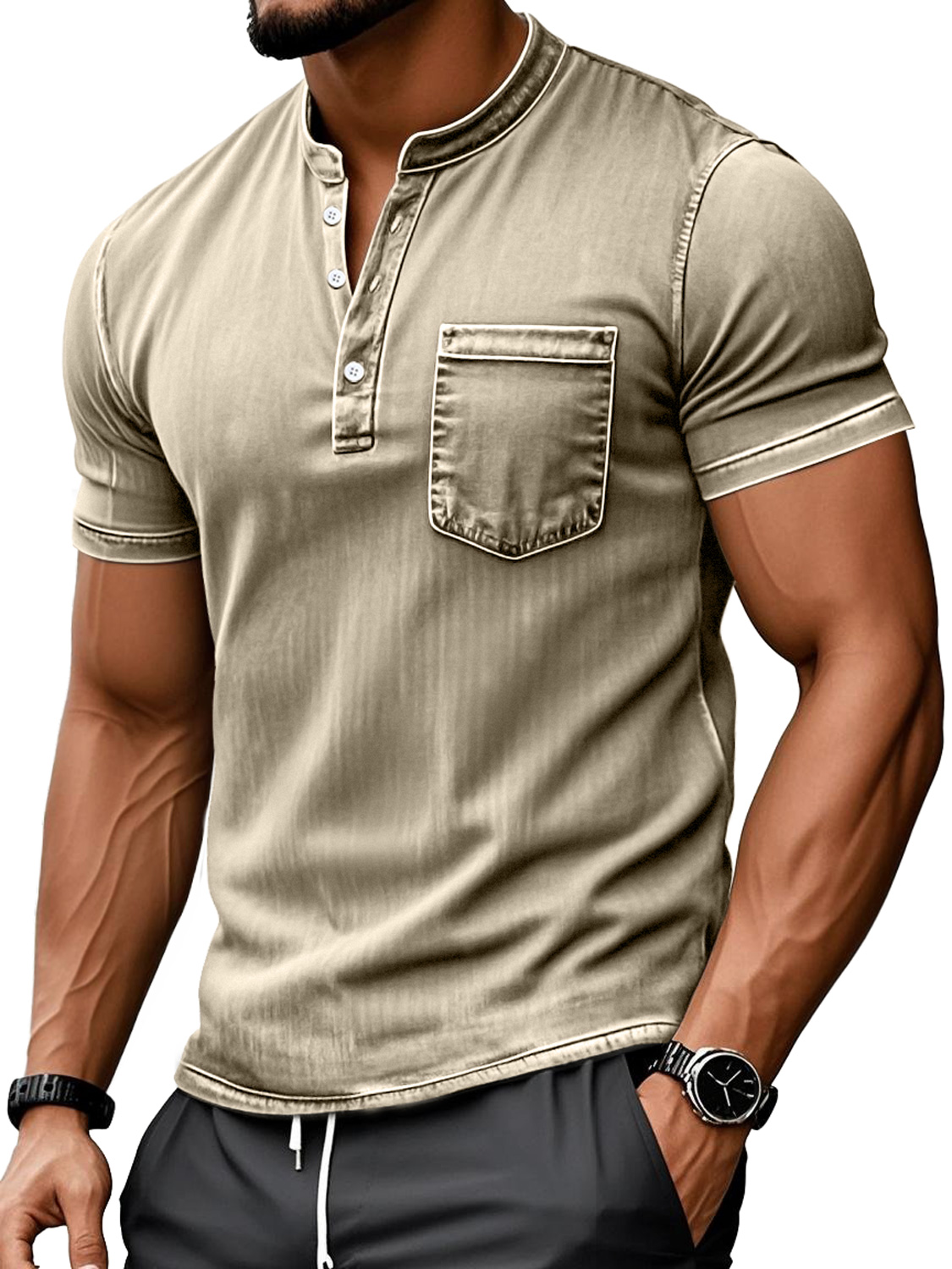 Men's Retro Everyday Stand Collar Pocket Casual Short Sleeve Henley Shirt