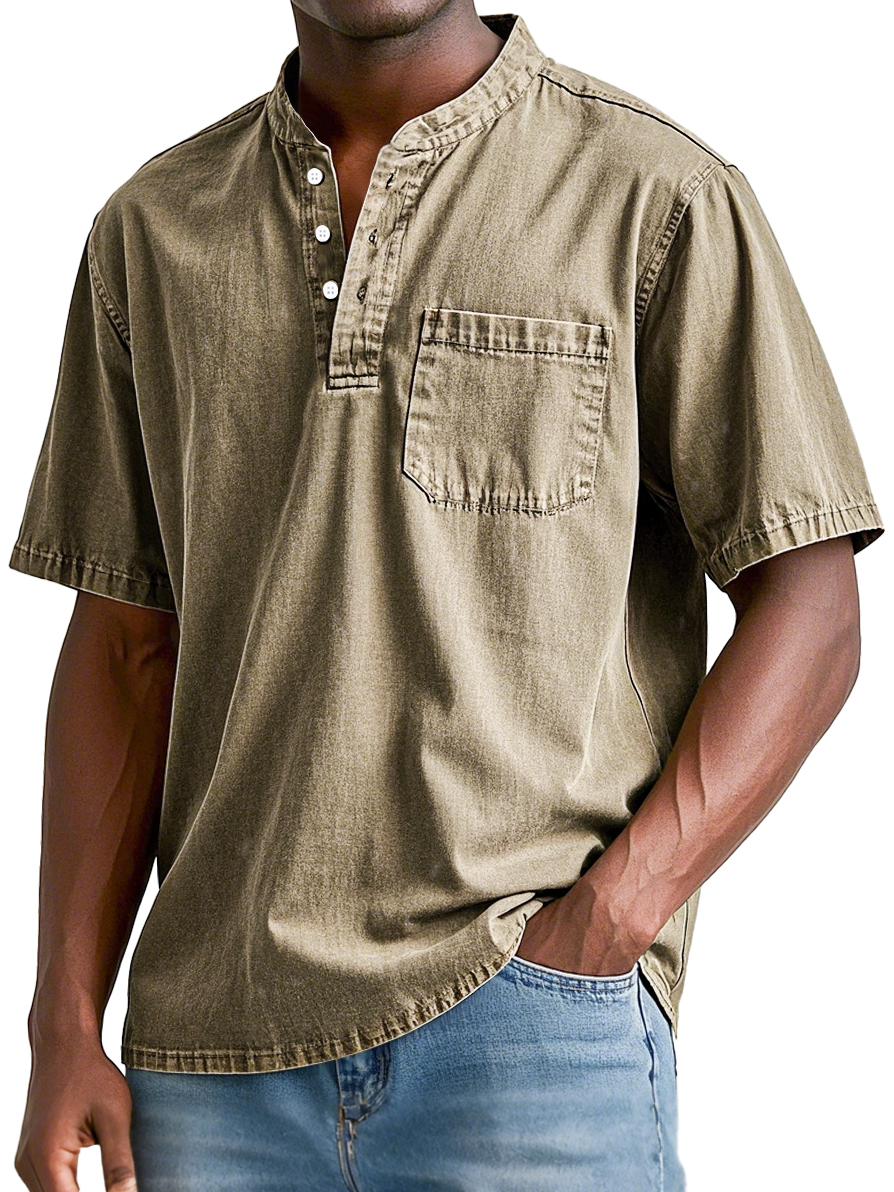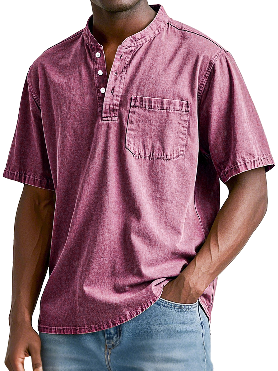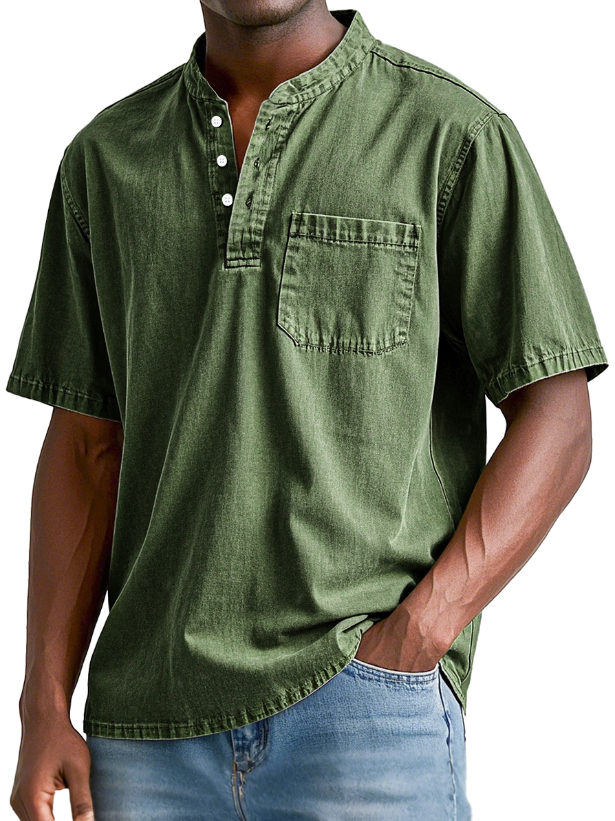 Men's Retro Stand Collar Pocket Casual Short Sleeve Henley Shirt